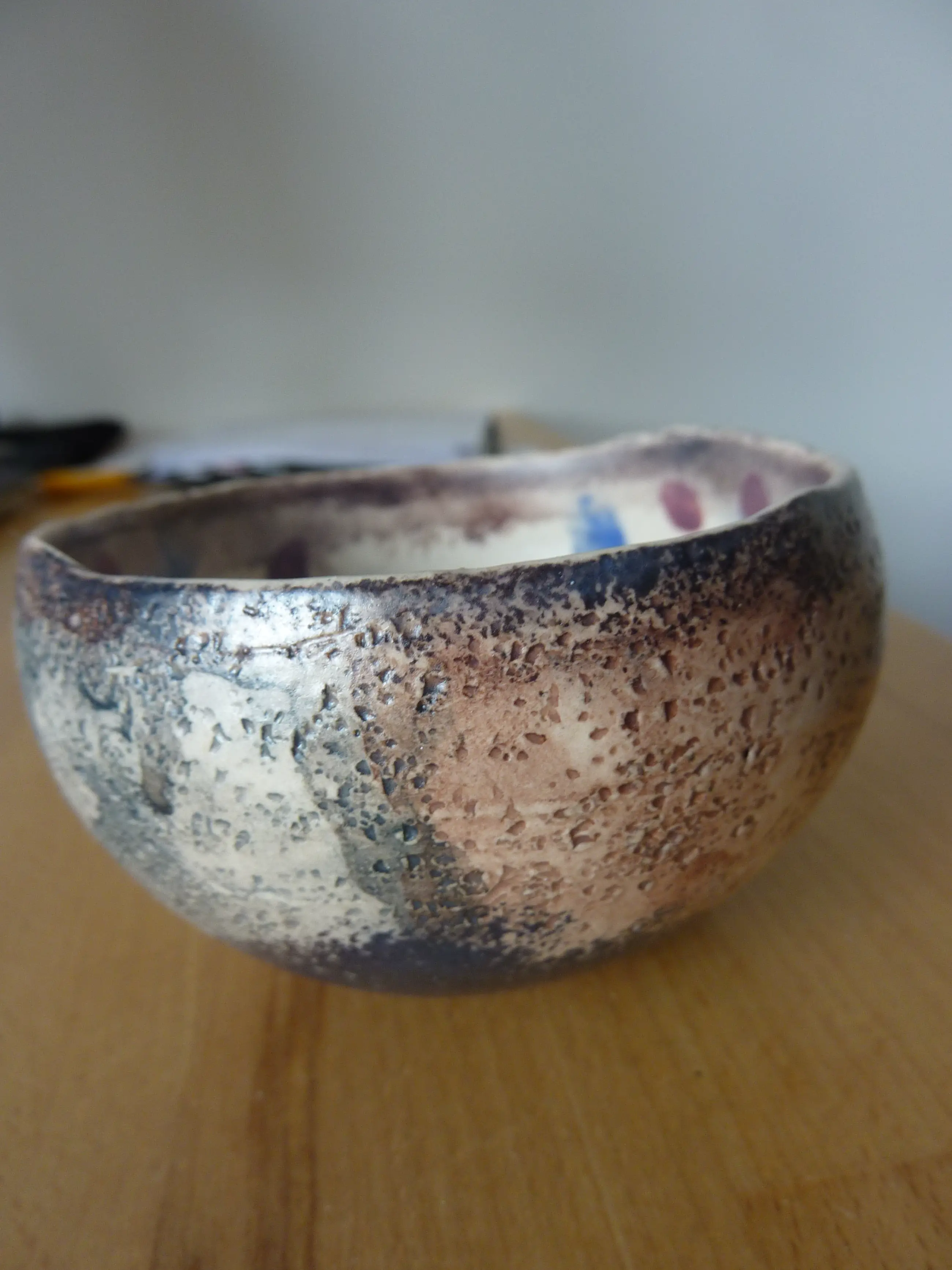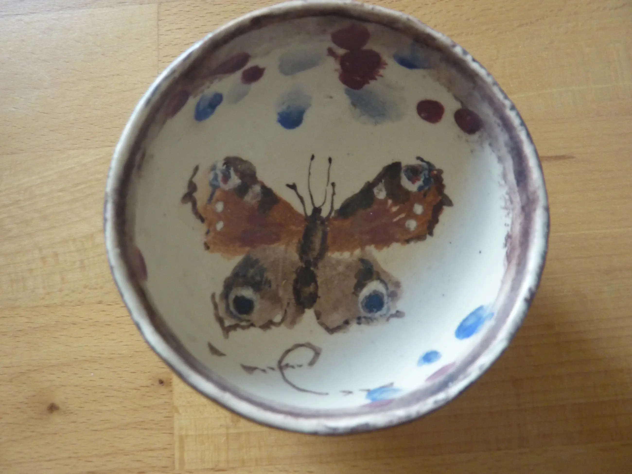 Keramieken schaaltje of kommetje met vlinder aan de binnenkant. Onderop gesigneerd met NIC. Binnendoorsnede 8 cm. Roodbruin met blauw gekleurd. Op onderkant kleine inkeping, handgemaakt. Het aardewerk is oneffen aan buitenkant en bovenkant.
