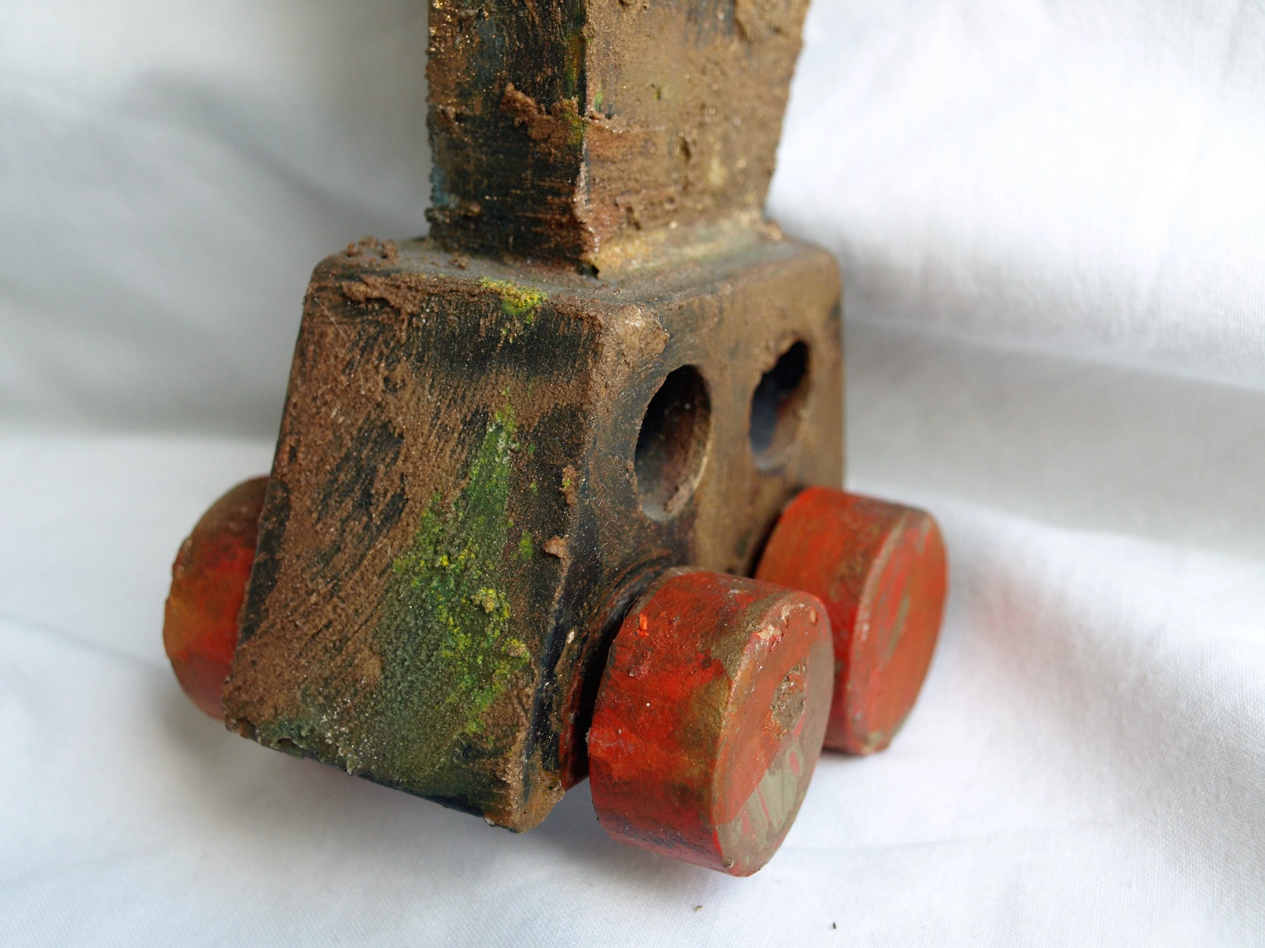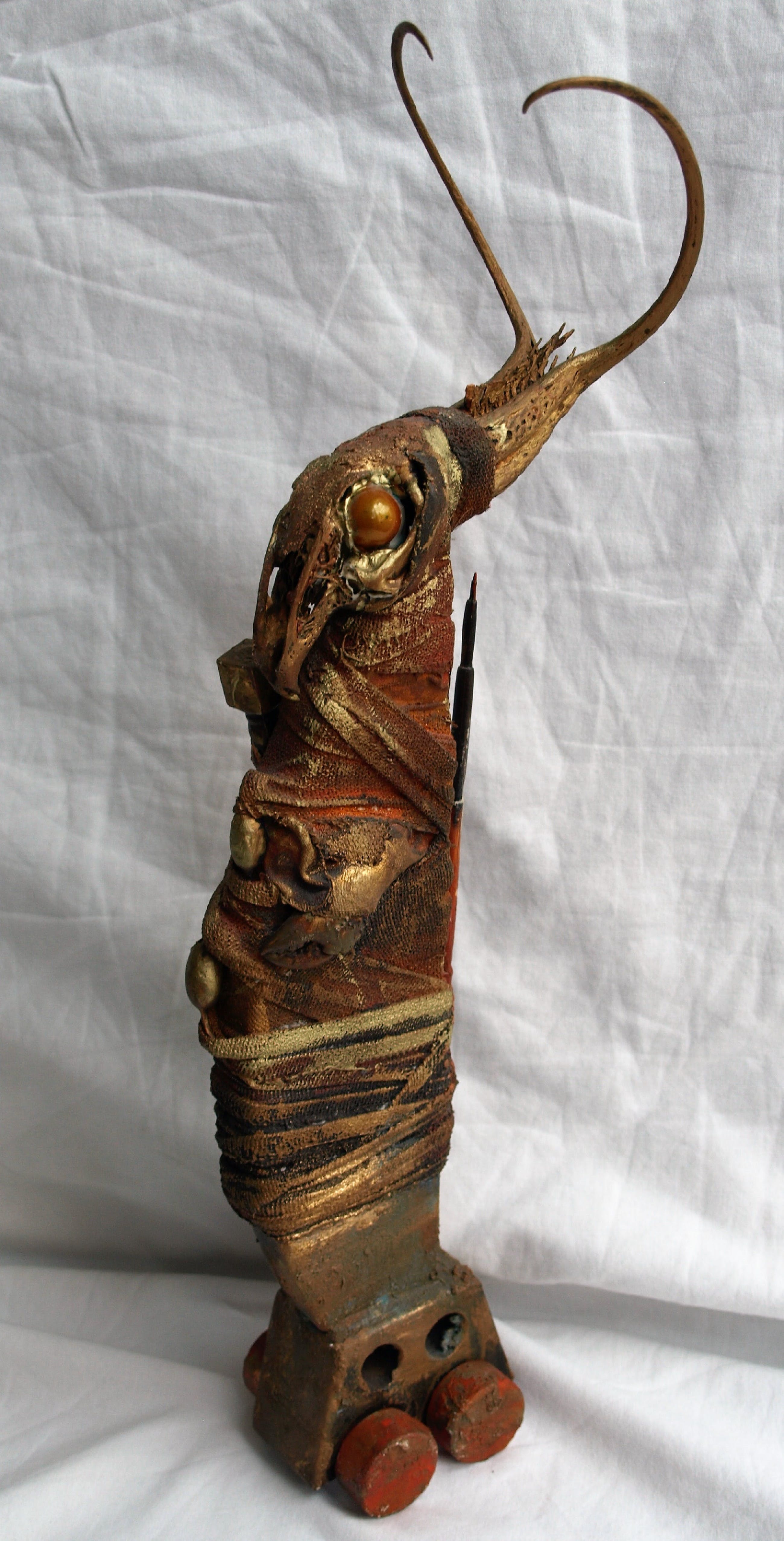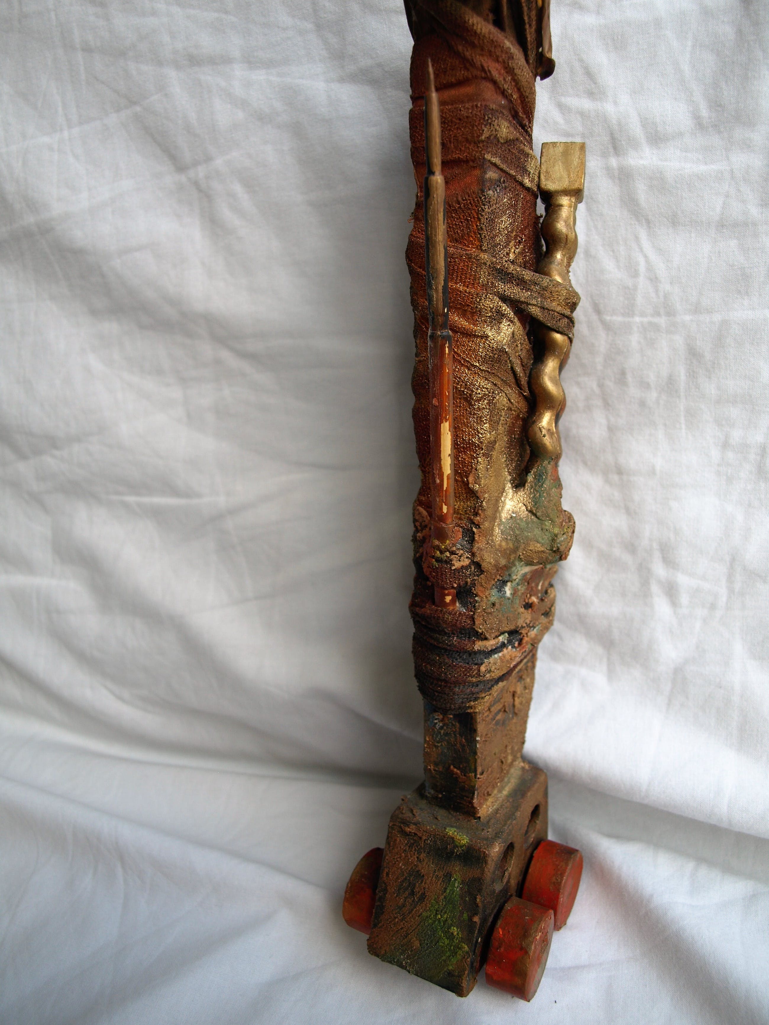 Een assemblage op wieltjes van de Nederlandse kunstenaar Niek Bruynzeel (1952), gemaakt van gevonden en/of verloren materiaal (o.a. hout, speelgoed, dierenschedel(s), goudverf, doek).