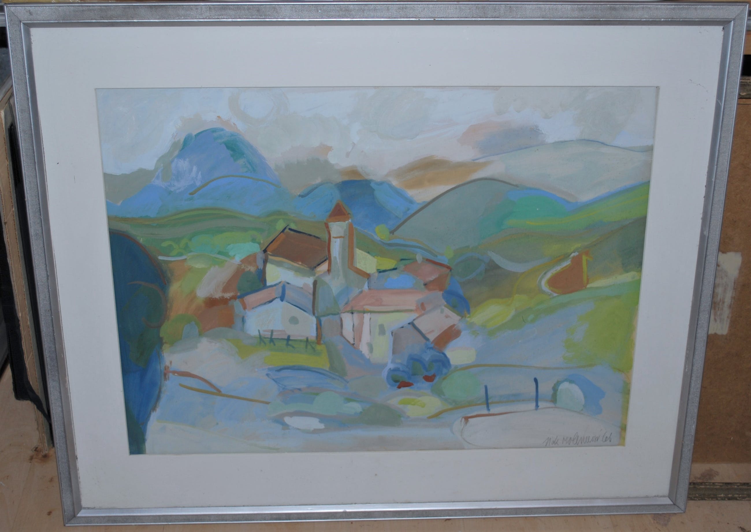 De gouache is in goede staat. De lijst heeft gebruiksporen. Het achterkarton is aan vervanging toe.