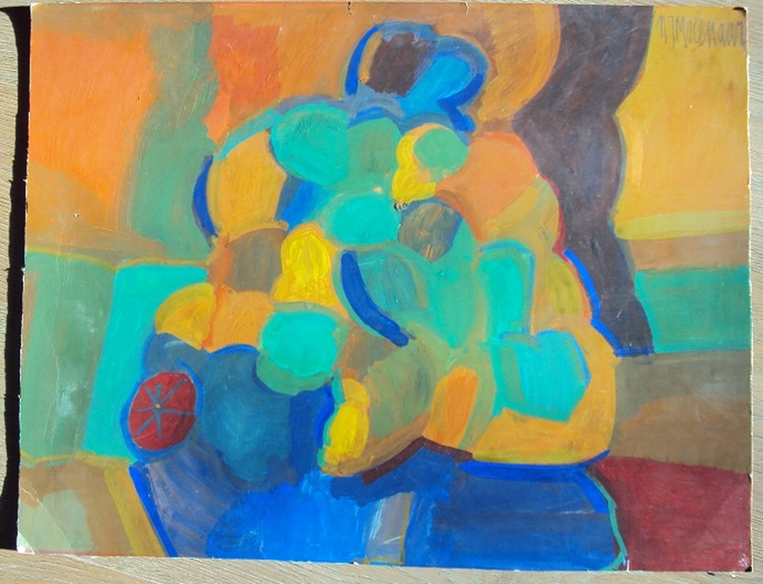 Gouache op kartonachtig papier. Abstraherend figuratief werk met helder kleurgebruik. Niet ingelijst. Wel gesigneerd. Bovenin 2 kleine scheurtje en linksonde een vouwtje welke na inlijsting niet zichtbaar zal zijn. Het formaat is 48 bij 62 centimeter. Niek Molenaar is een representant ven de Utrechtse kunstenaars uit de jaren '60 van de vorige eeuw.