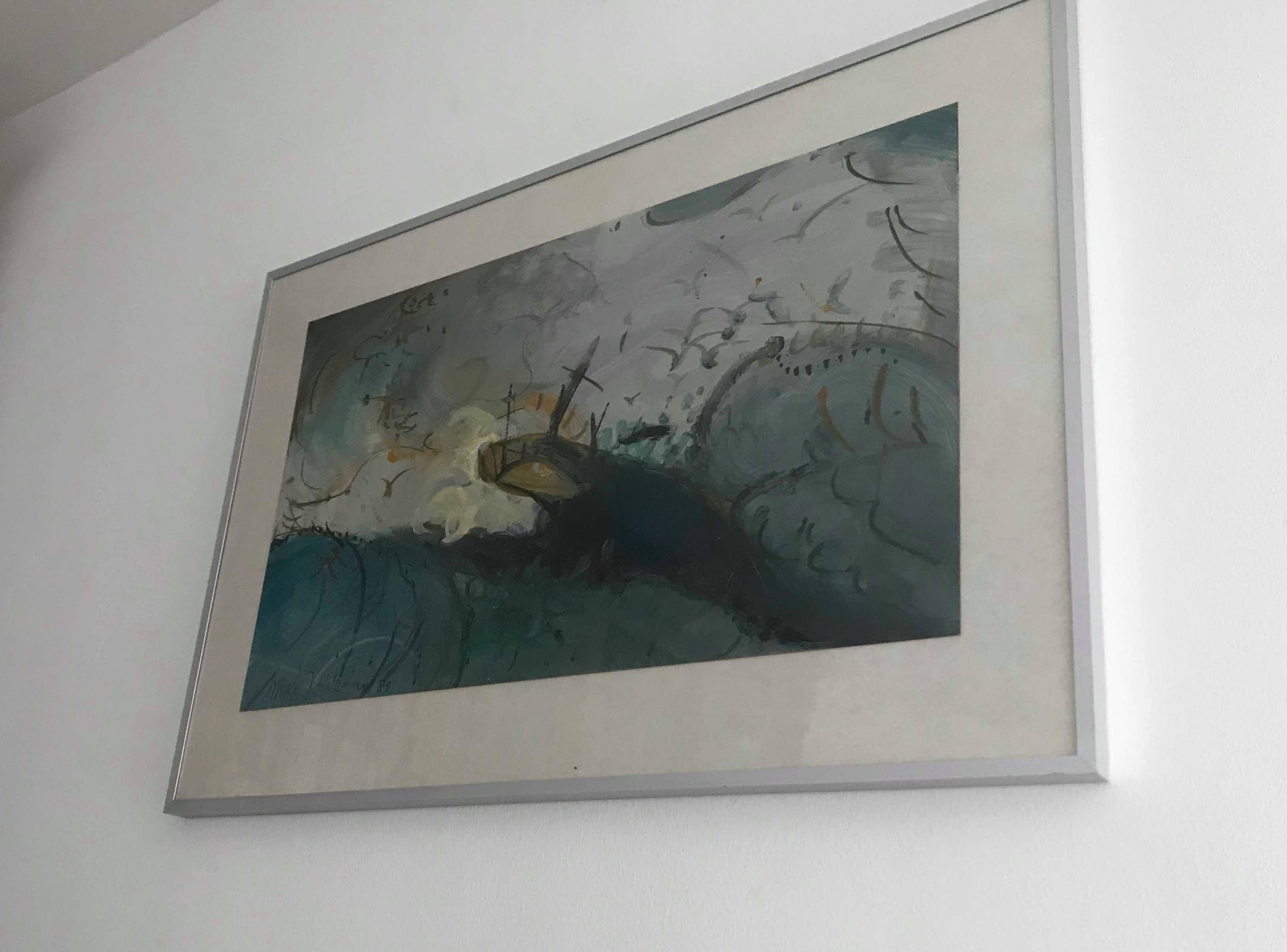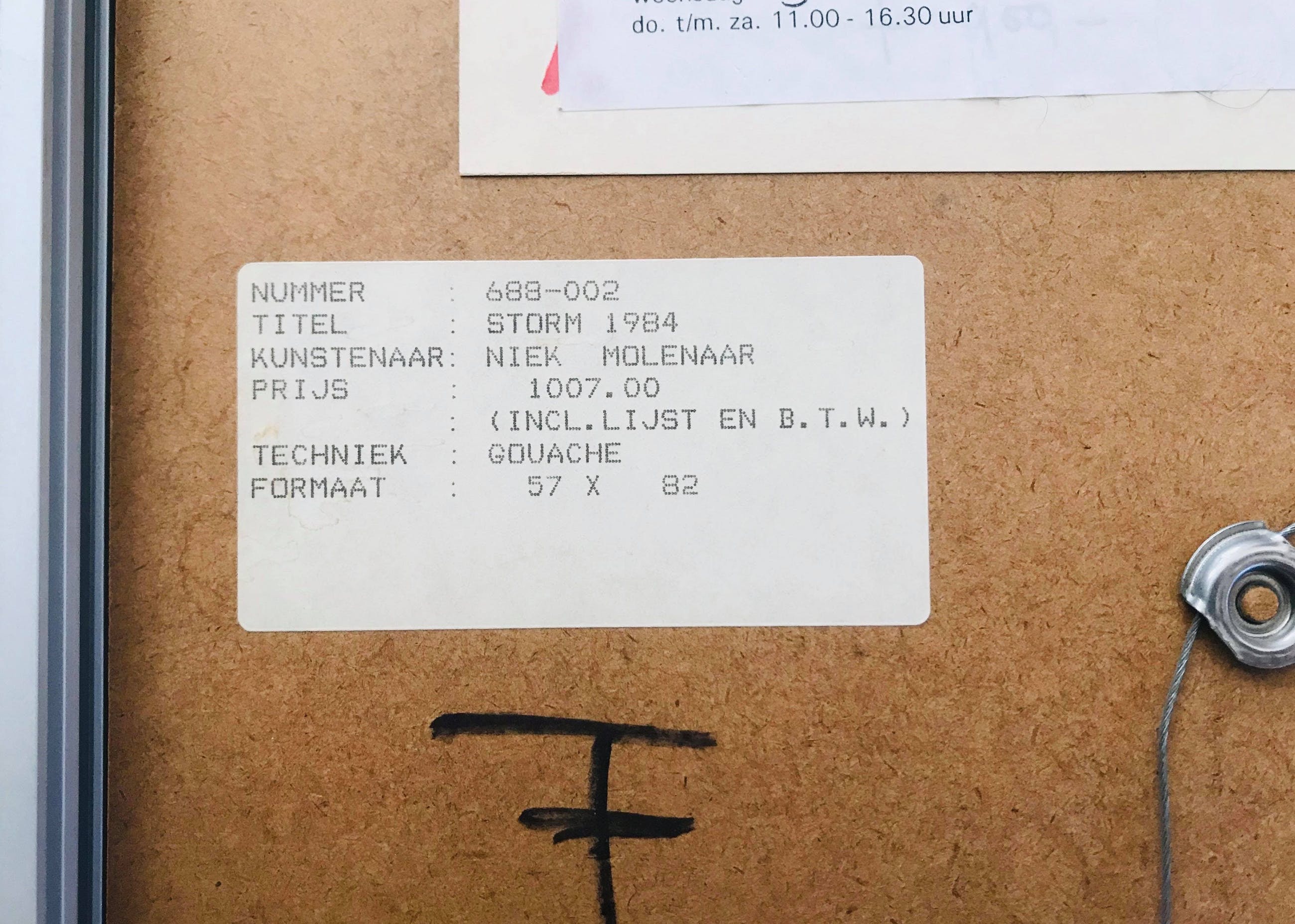 Uniek werk in erg goede staat van kunstenaar Niek Molenaar. Gouache op stevig papier, gekleefd op passe-partout-karton. In eenvoudige wissellijst. Eerlijk gezegd verdient dit werk een fraaiere lijst van een lijstenmaker met een mooi diep (Frans) passe-partout.