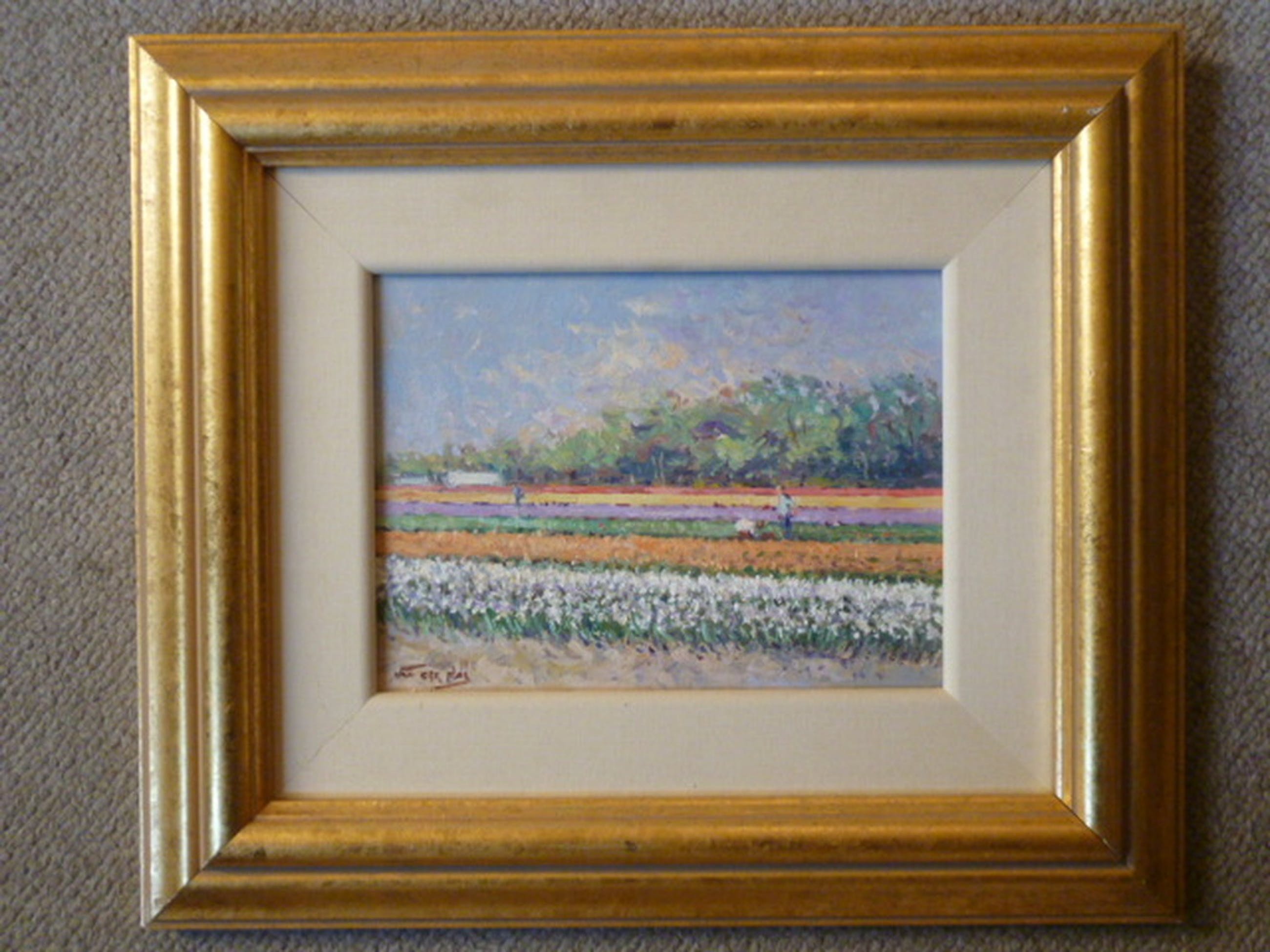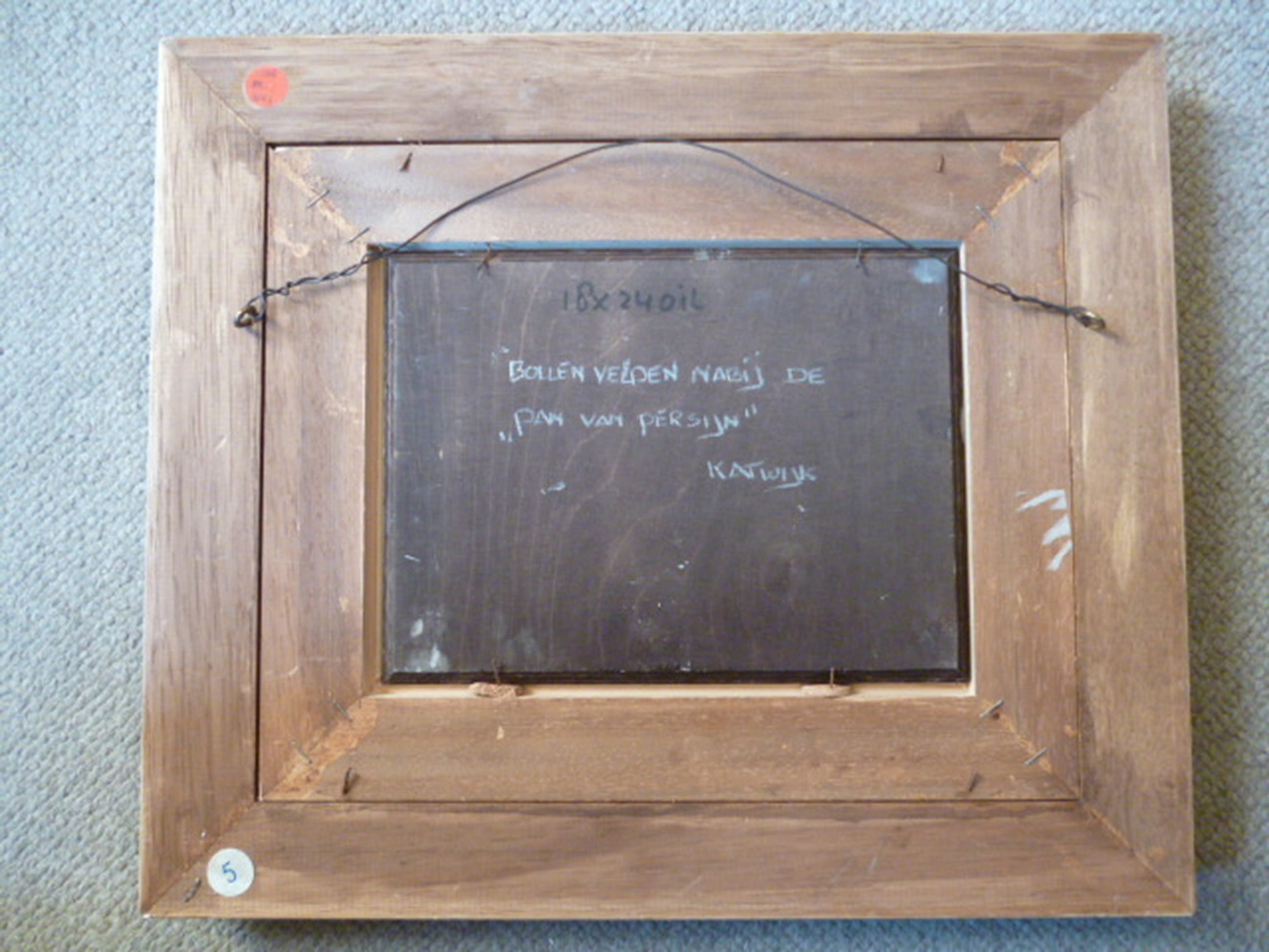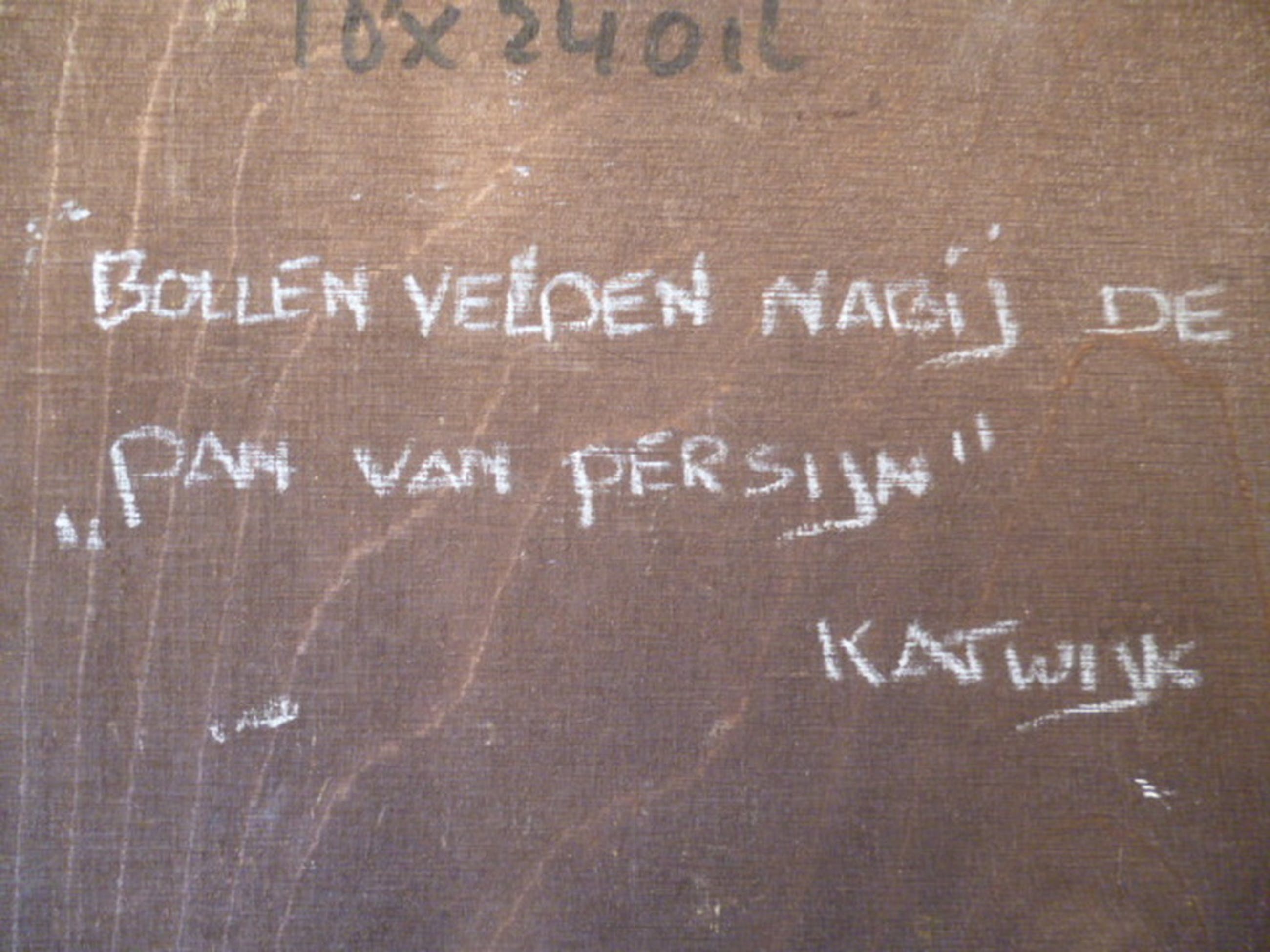 Olieverf op paneel. Getiteld aan achterzijde: "Bollenvelden nabij de "Pan van Persijn" Katwijk.