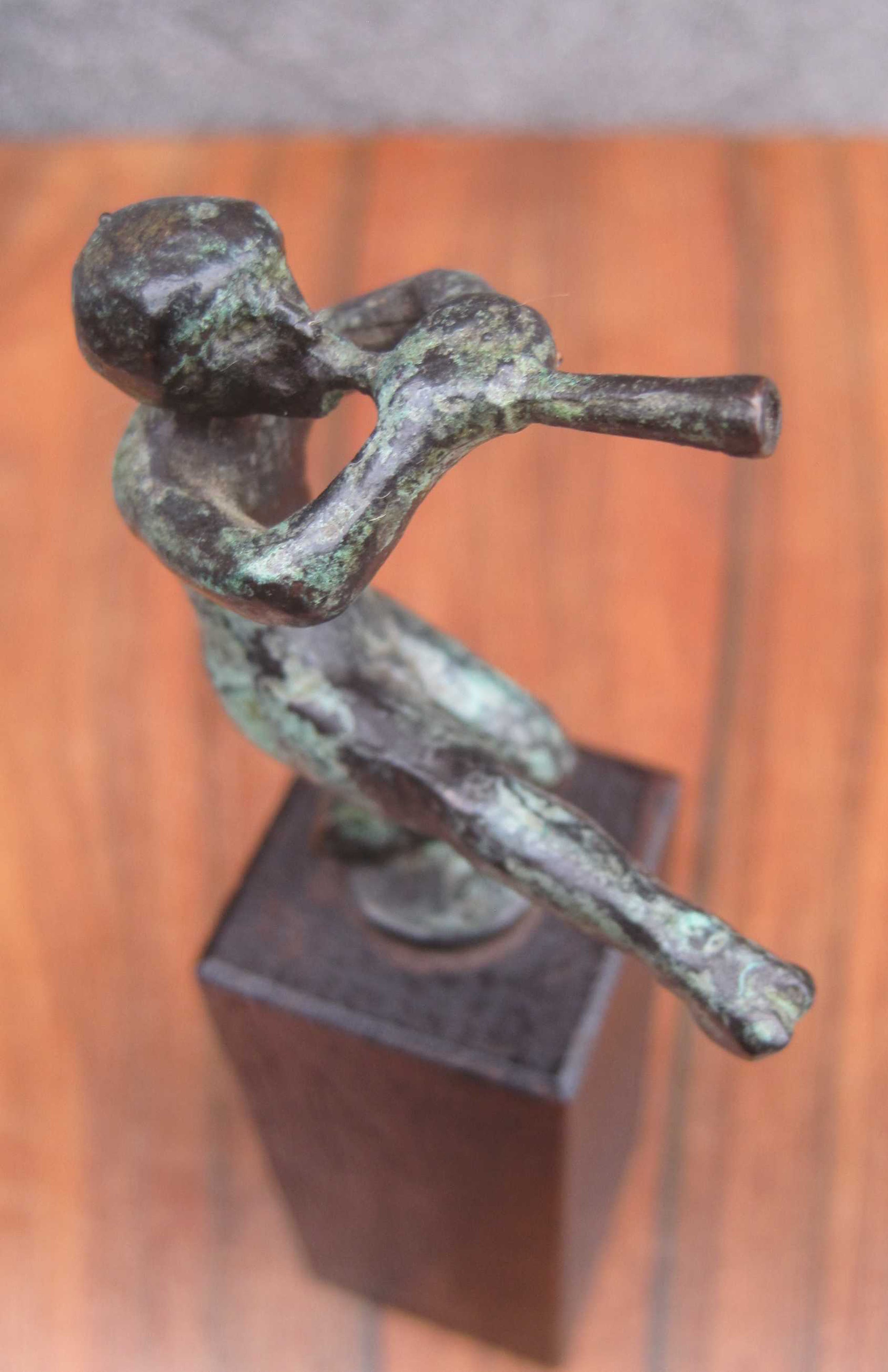 Vrolijk en speels bronzen beeldje van de Griekse god Pan. Ontworpen door Niels Steenbergen ( 1911 - 1997 ) Afmetingen van het beeldje zonder sokkel: 5,5 cm hoog x 4,5 cm breed x 3 cm diep. Het originele bronzen beeld stond in de tuin van het Möllercollege. Dit beeldje verkeert helemaal in originele staat.
