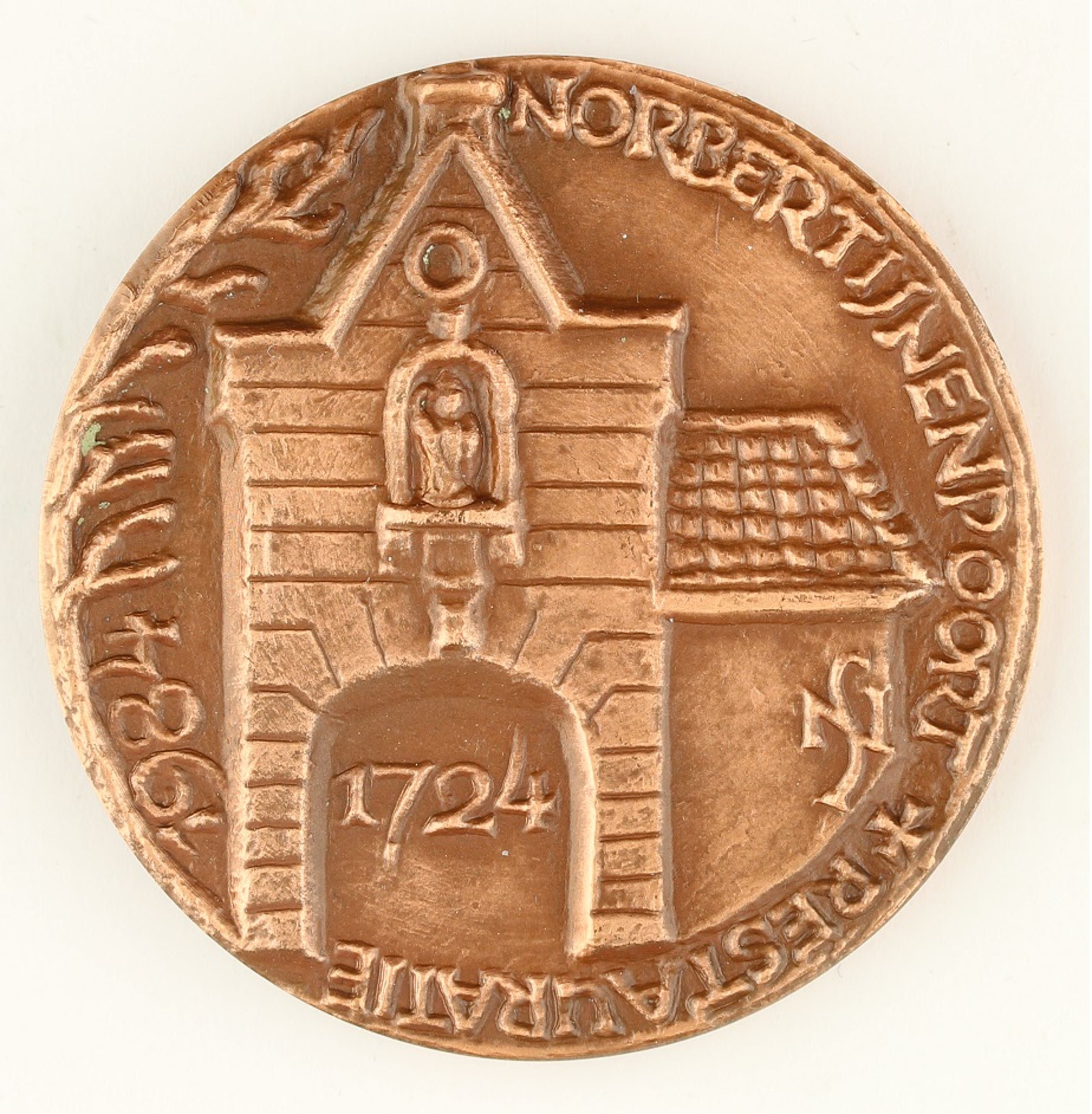 Vz. Frontaal afgebeeld de zogenaamde ‘Norbertuspoort’, gezien vanaf de Goirkestraat. In de poortopening het jaartal ‘1724’ (bouwjaar); omschrift: ‘NORBERTIJNENPOORT RESTAURATIE (…) 1984’; links een bladetak.