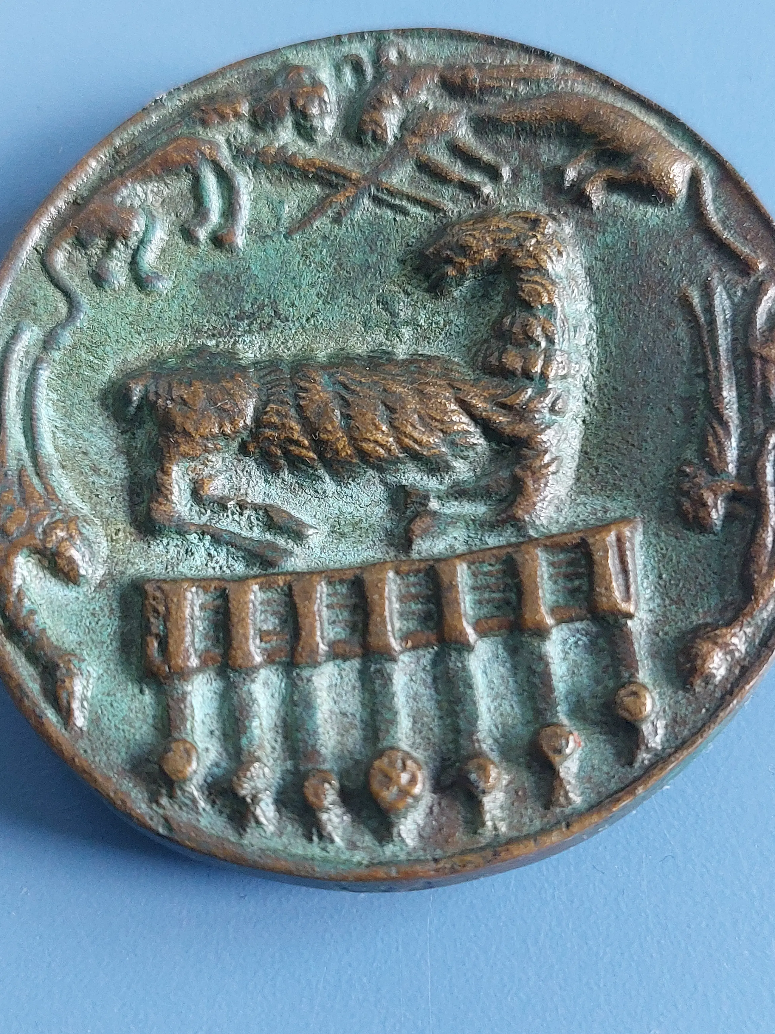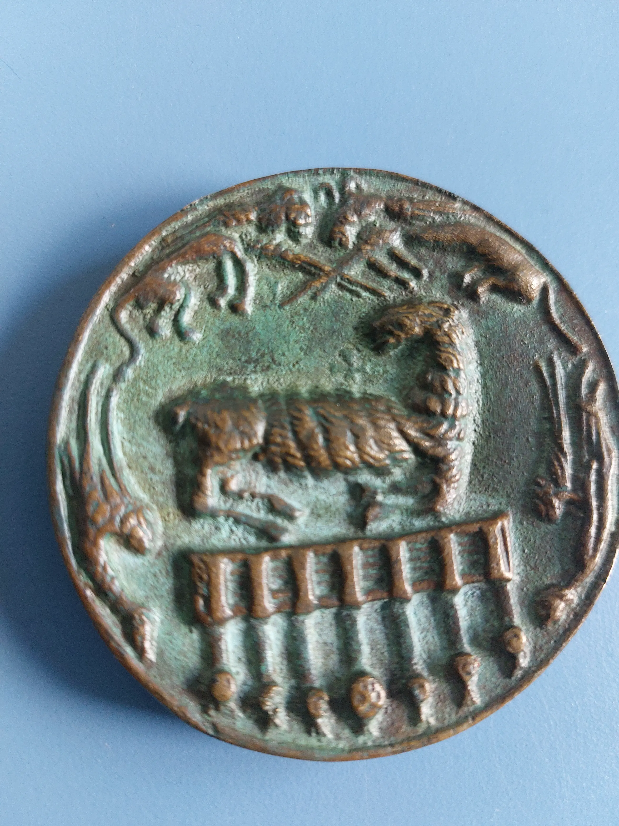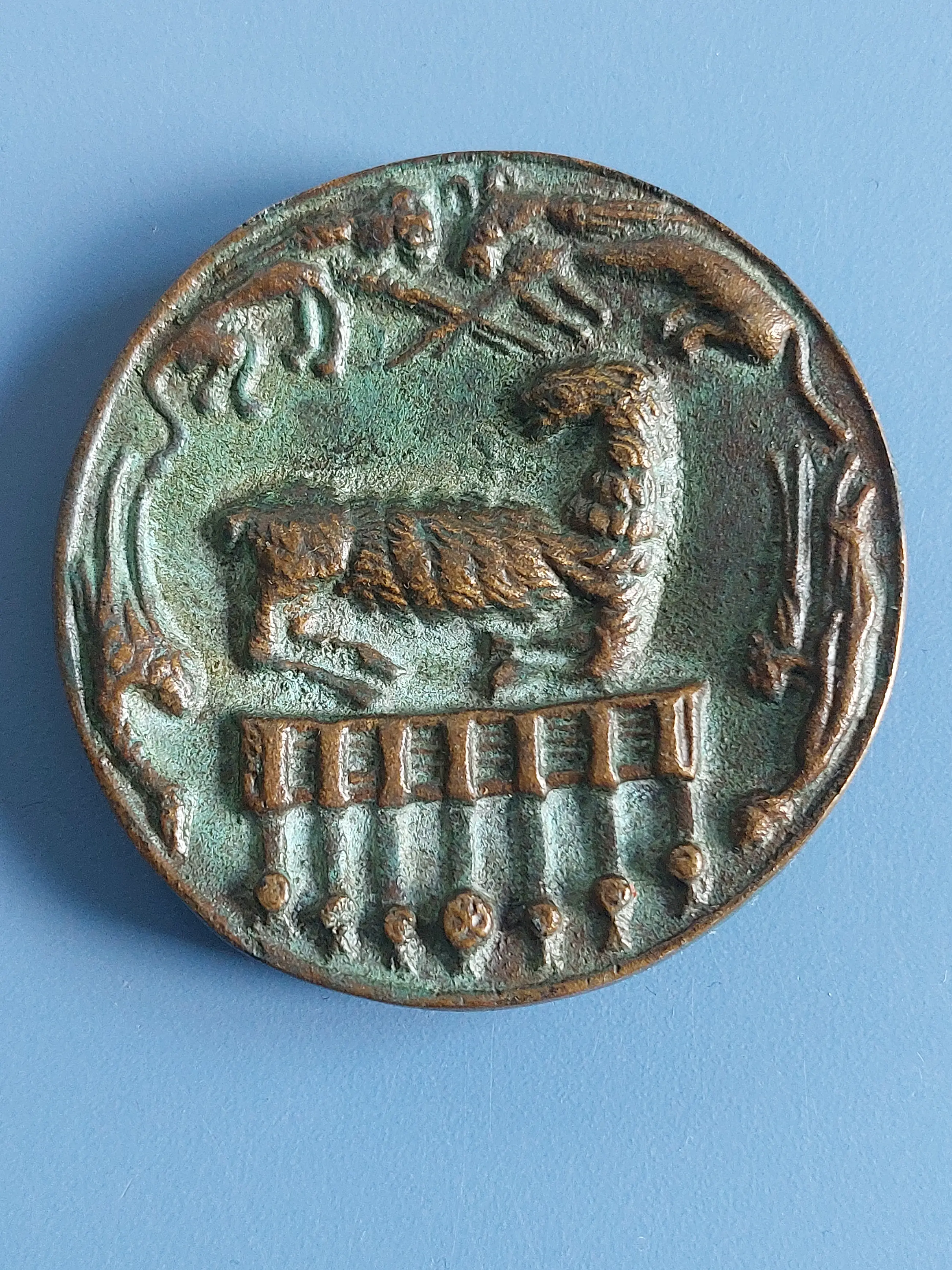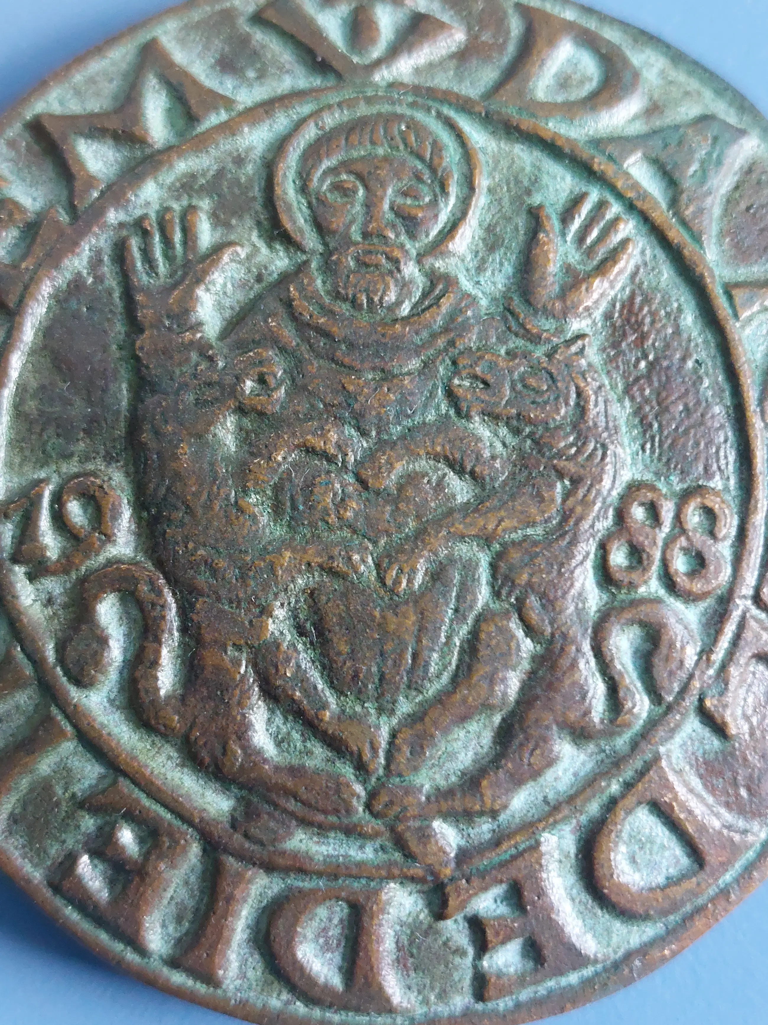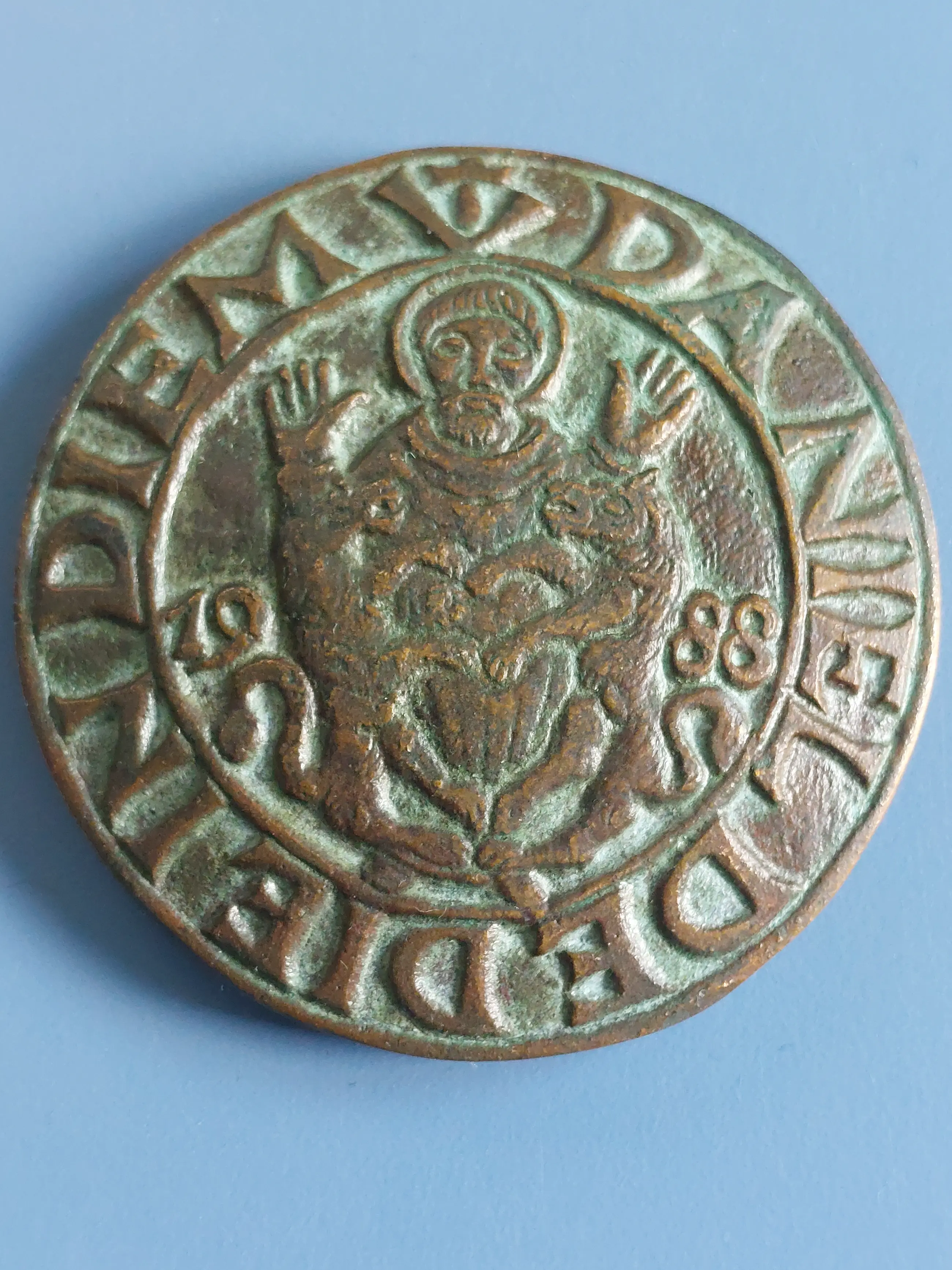 'Dankbaarheidspenning' 1988. Vz: Afbeelding van Daniel in de leeuwenkuil, geflankeerd door twee klimmende leeuwen; het jaartal 1988. Omschrift: 'Da Niel De Die In Diem' (Geef Niel dag op dag). Kz: Het Lam Gods op het Boek met de zeven zegels (Apocalyps), omringd door de symbolen van de vier evangelisten. Modelé: Niel Steenbergen (1911-1997). Brons, gegoten in schaalvorm (hol en bol), 63 mm. Op de rand gemerkt: 'PM'. (= Post Mortem). Persoonlijke uitgifte, postuum geslagen, Oplage 12 exemplaren. (Van de Kam, P 8801).