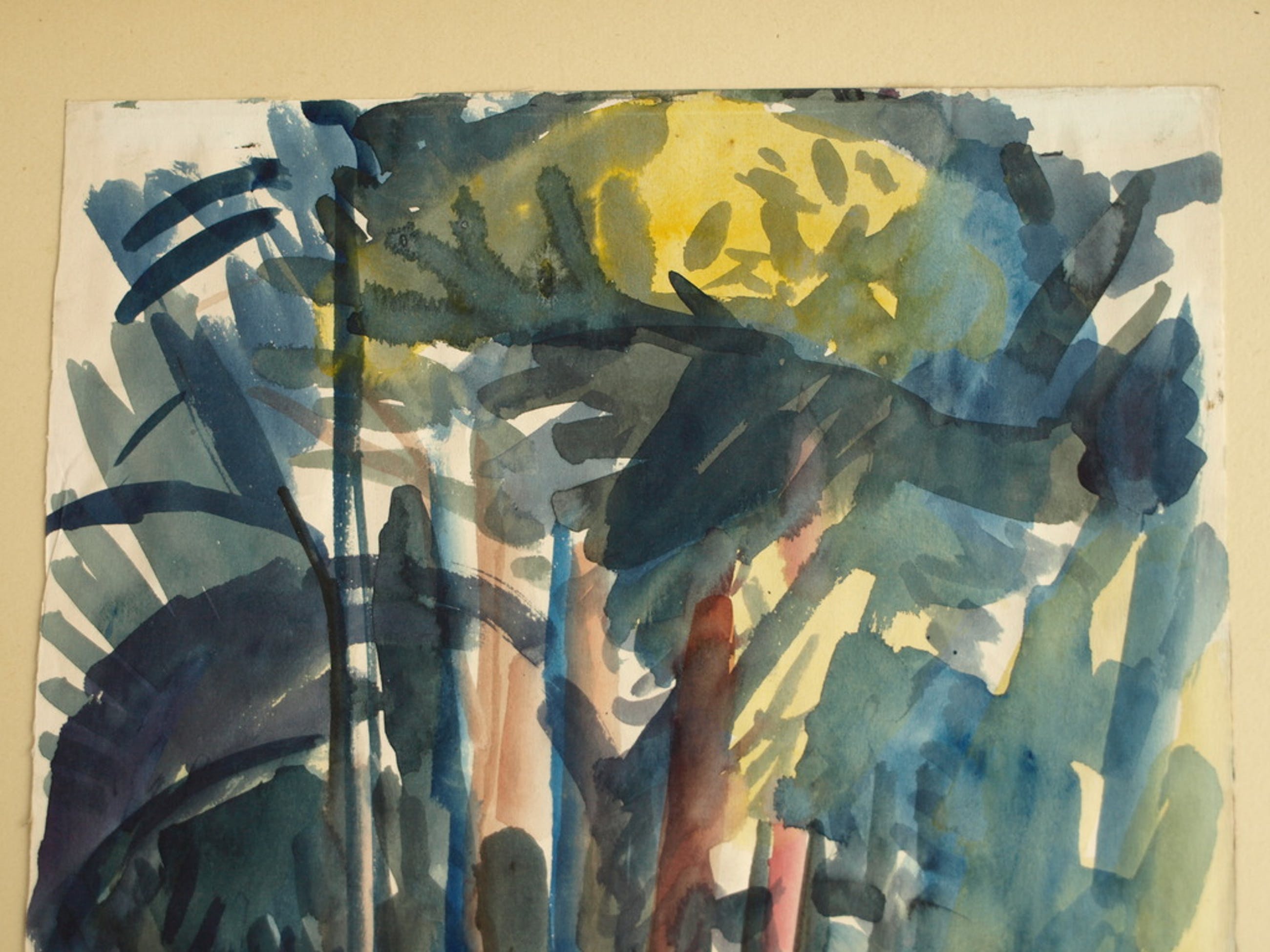 De aquarel is gesigneerd. Niet ingelijst, wel in een passe-partout. De aquarel is met 2 stukjes tape aan het passe-partout bevestigd.