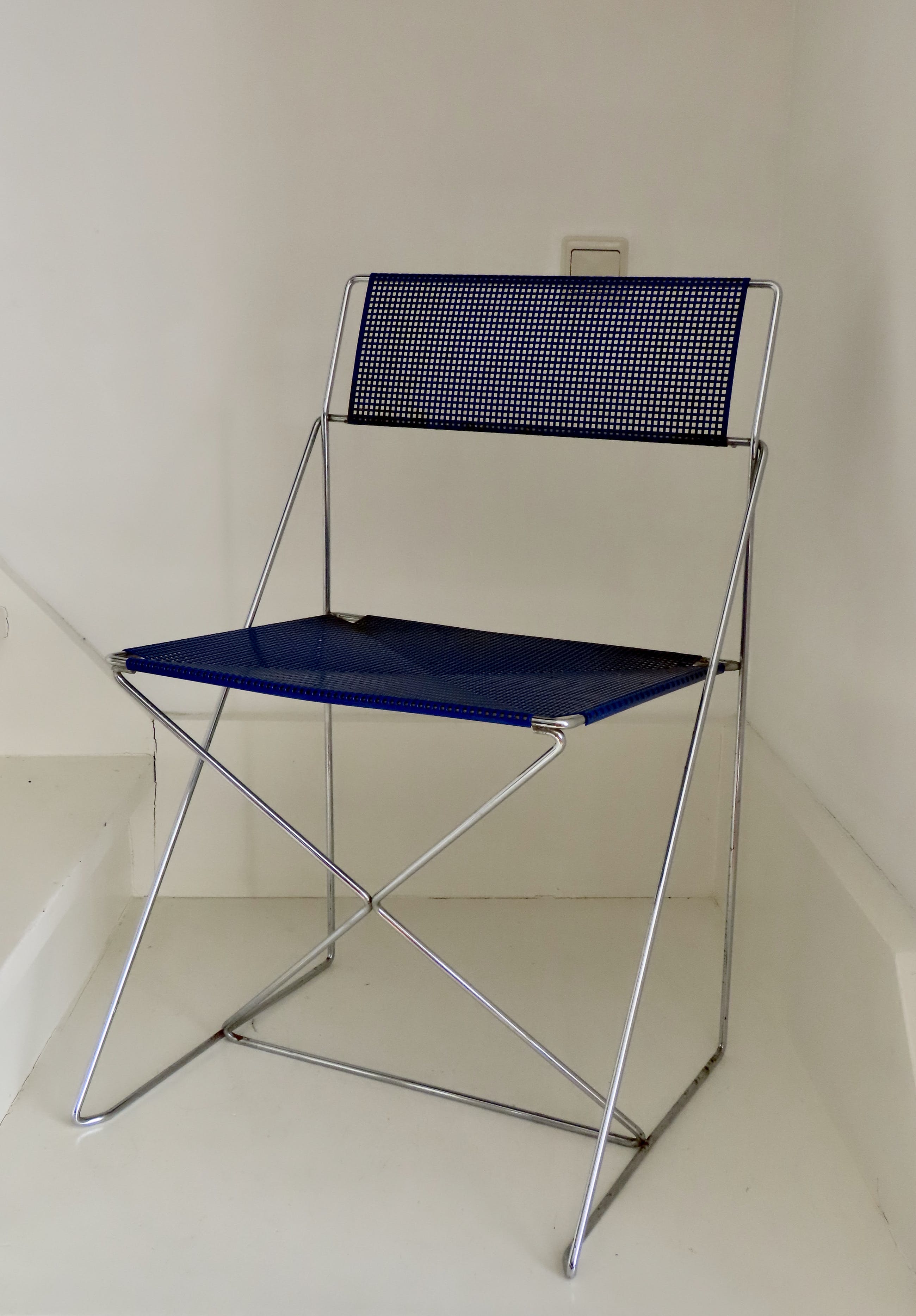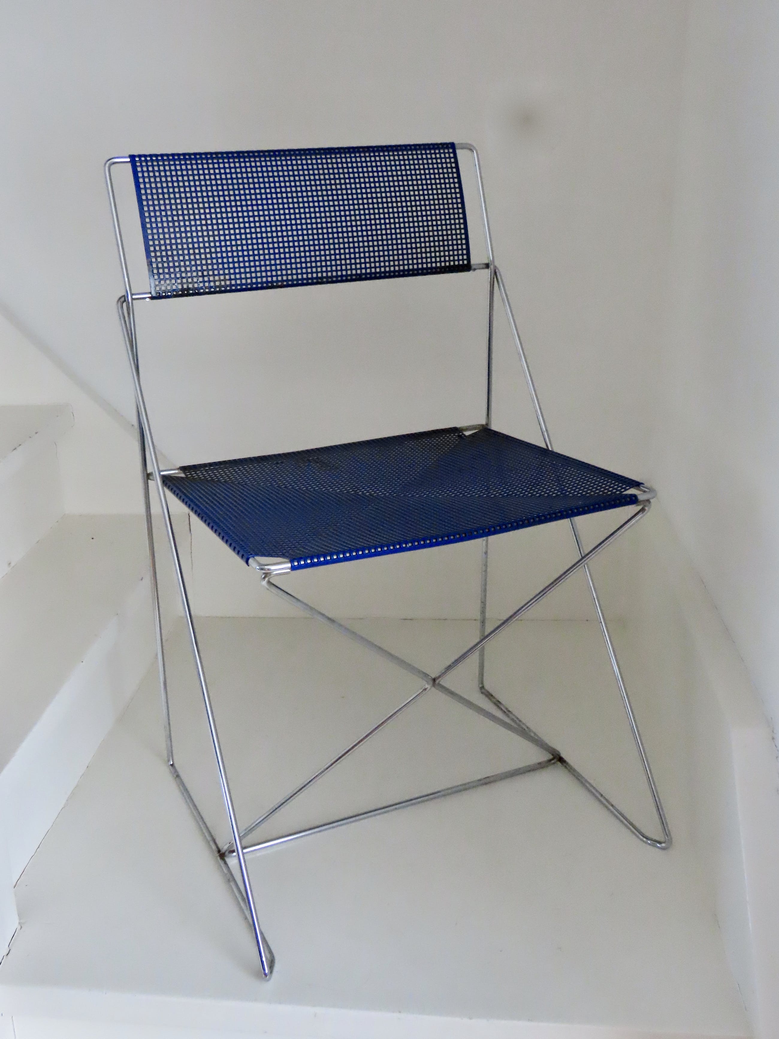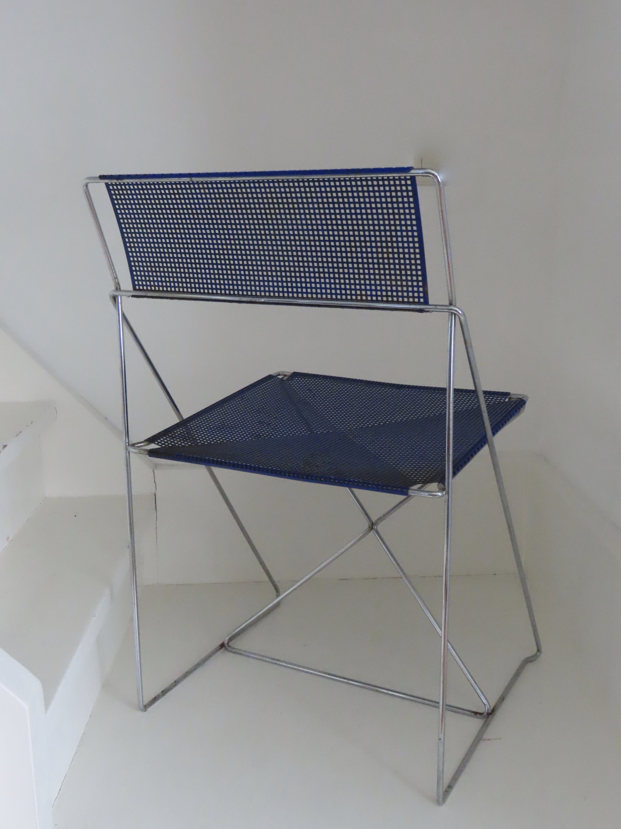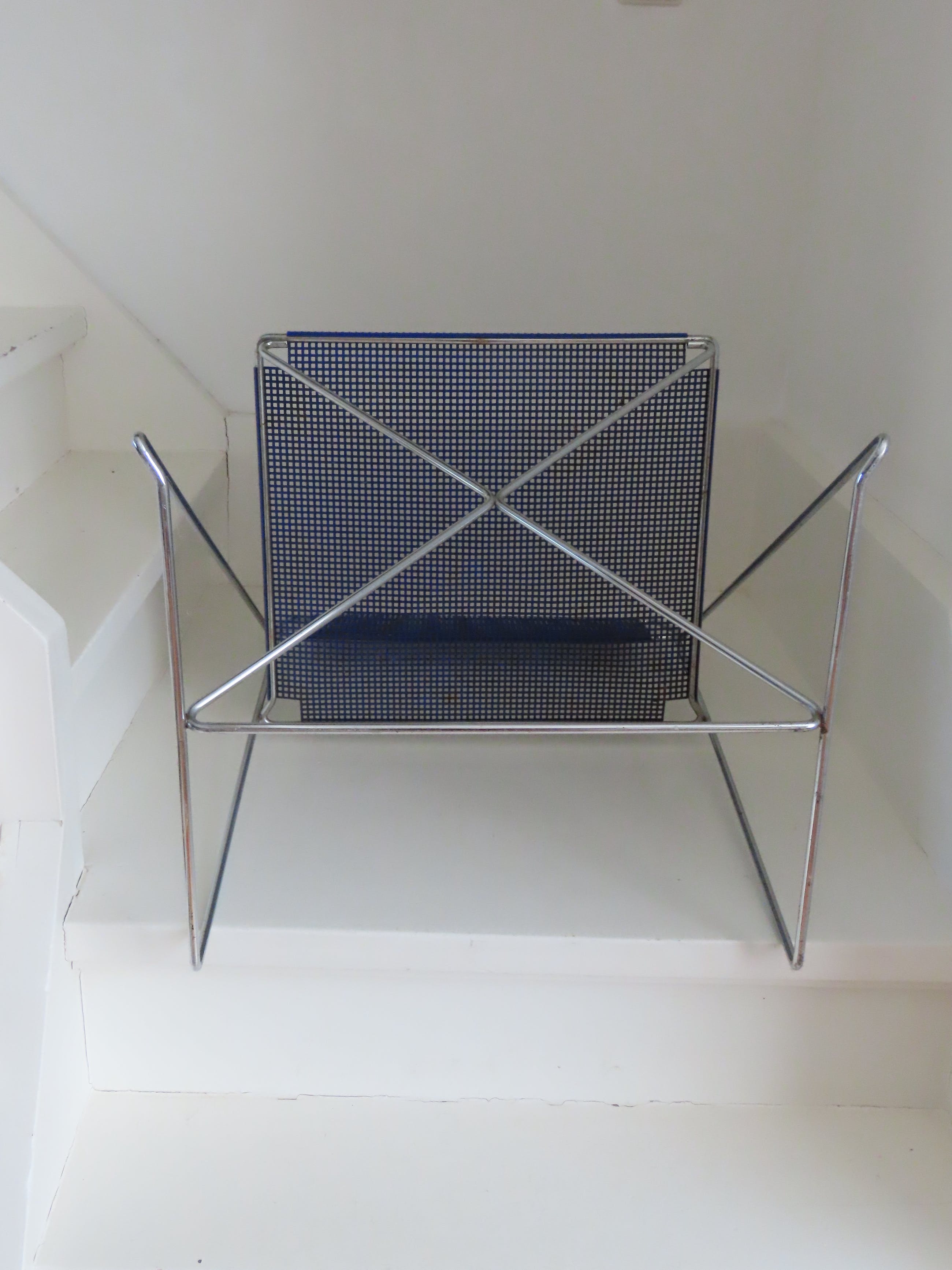 De diepblauwe stoel is is goede en gave staat, enige roestvorming hier en daar en de stoel moet schoongemaakt worden. De stoel zit overigens heerlijk en is een echte eyecatcher.