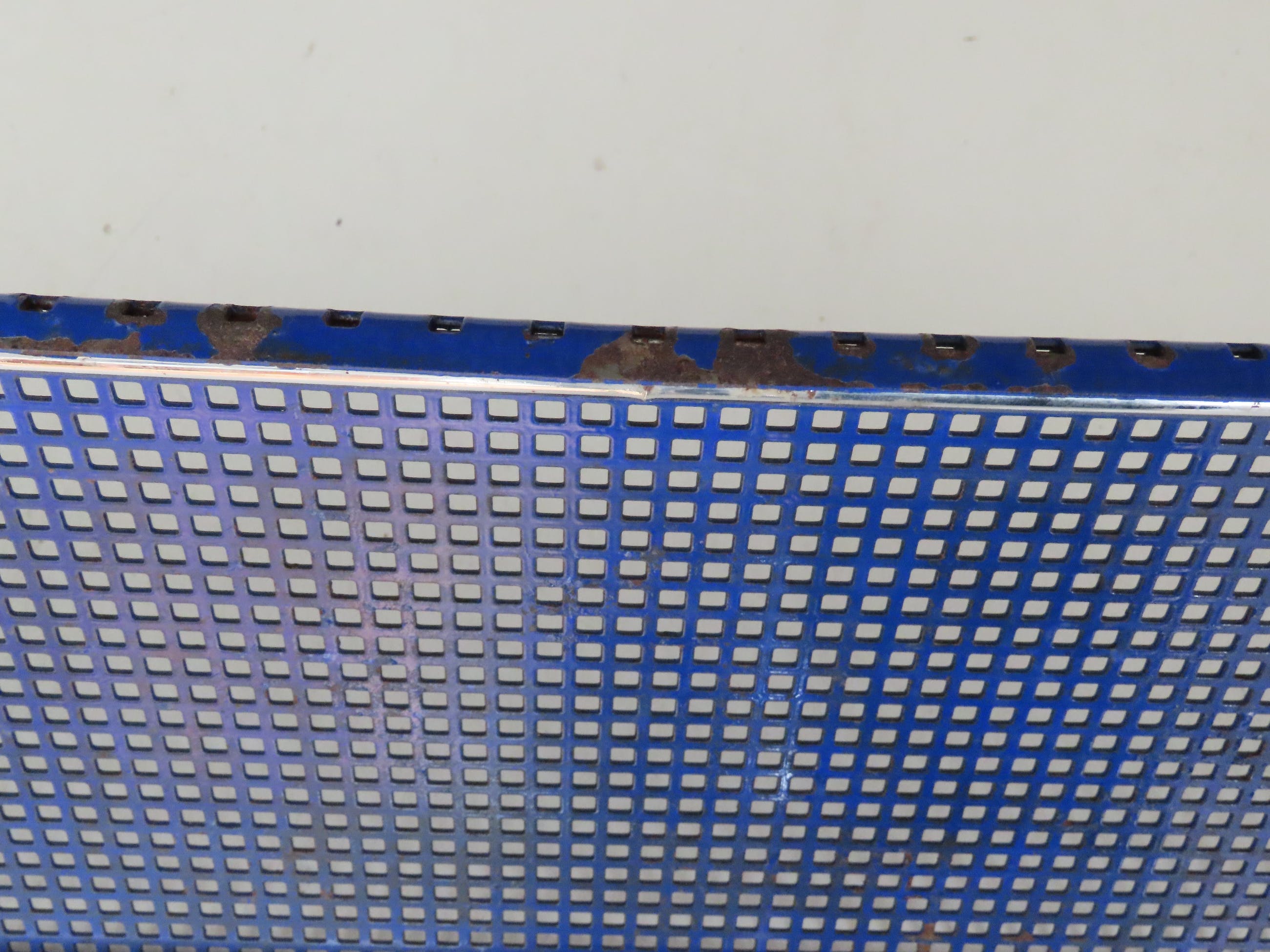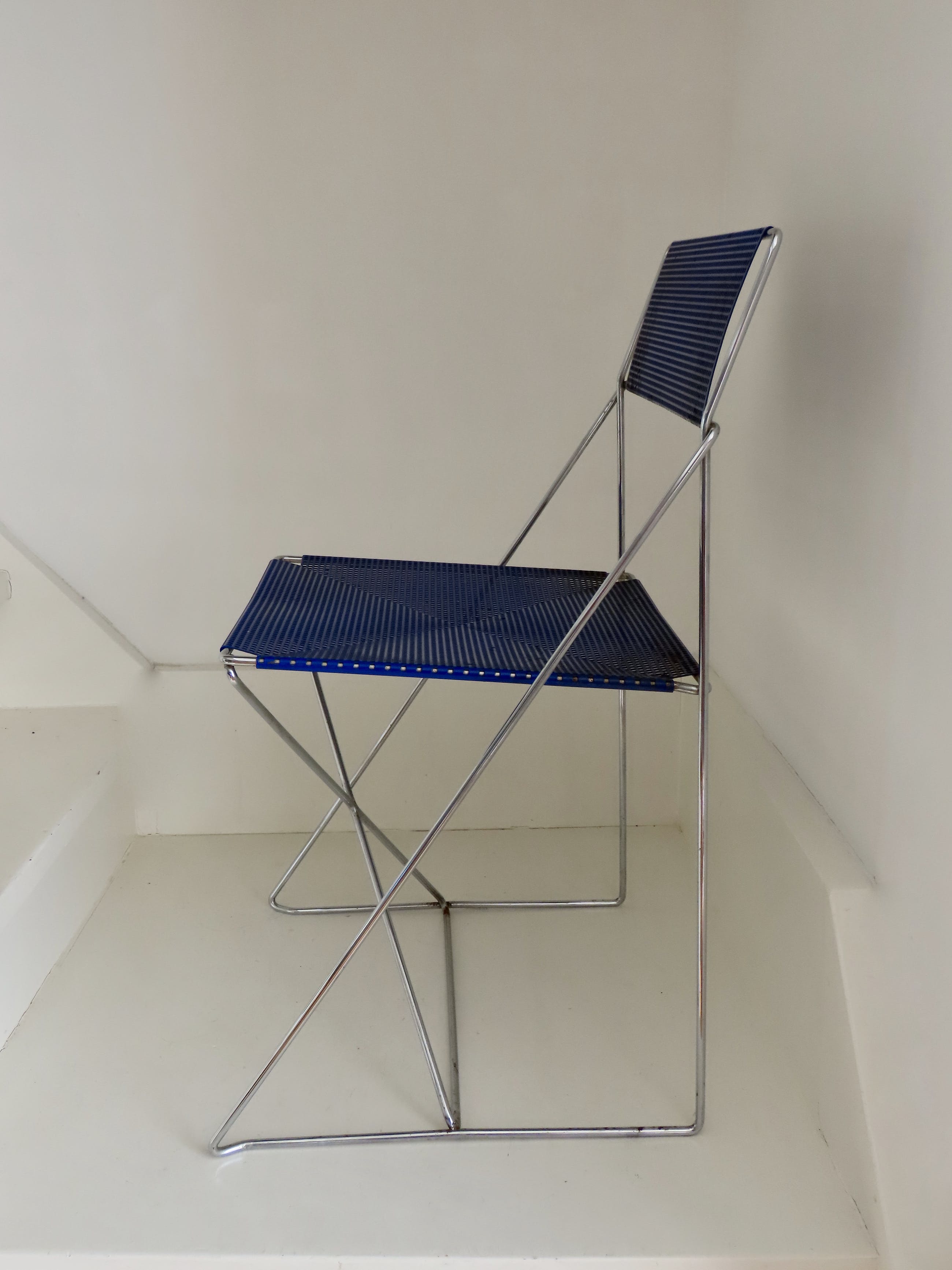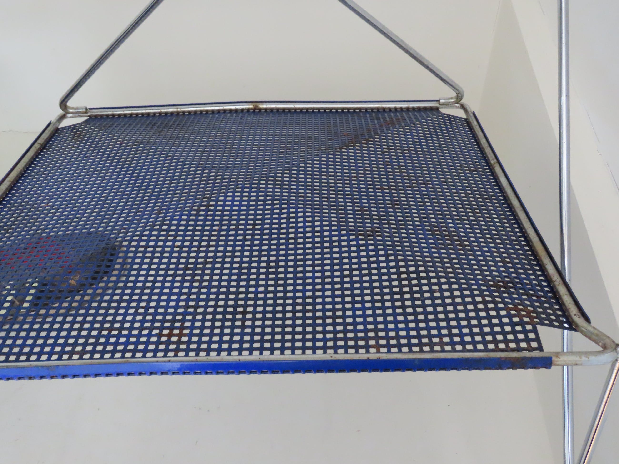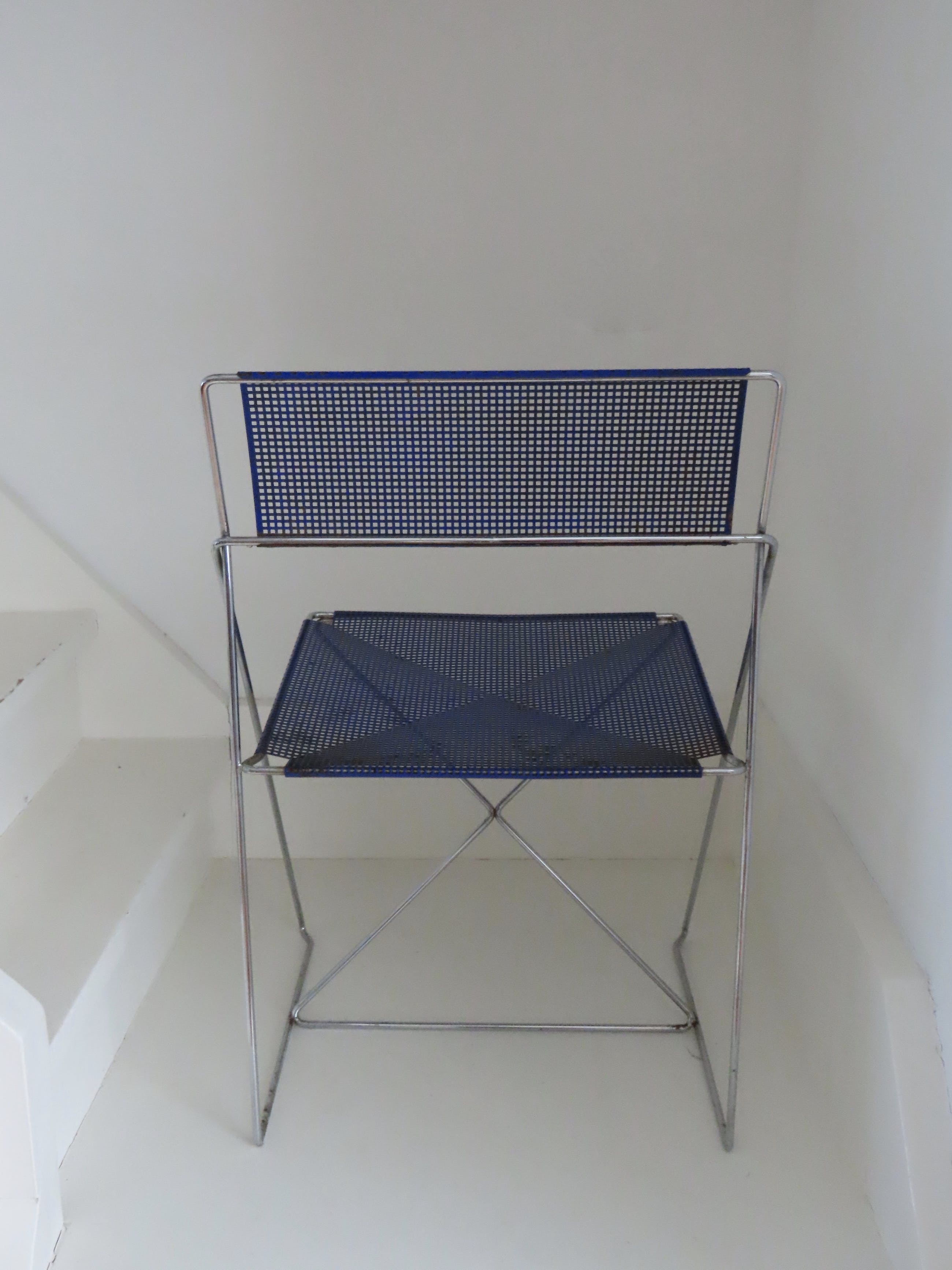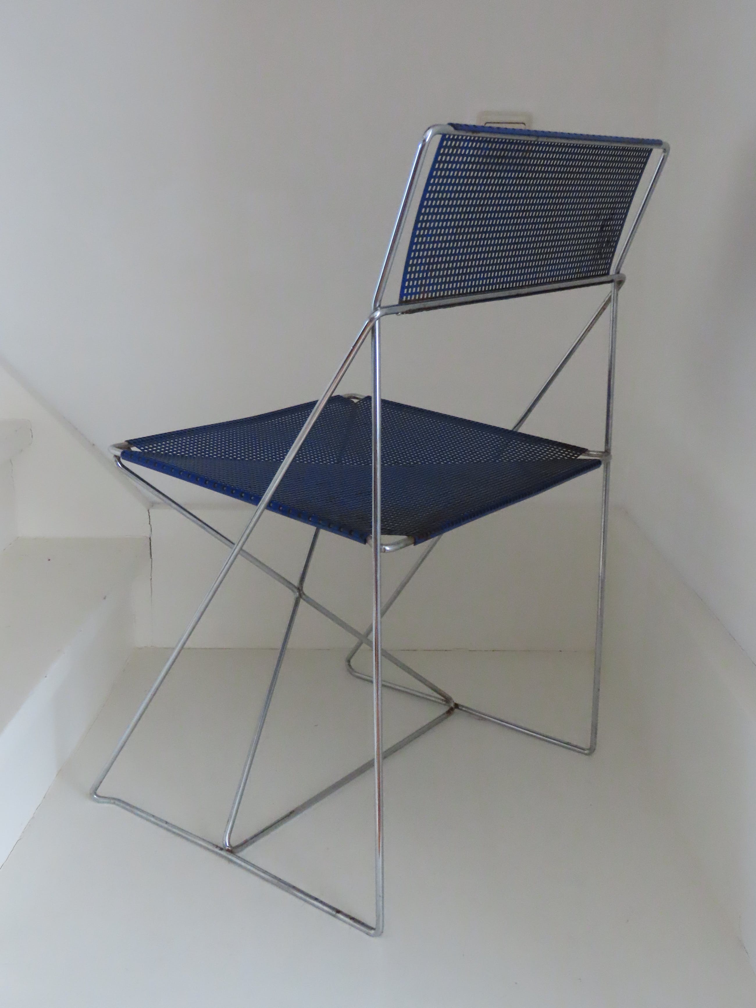 De diepblauwe stoel is is goede en gave staat, enige roestvorming hier en daar en de stoel moet schoongemaakt worden. De stoel zit overigens heerlijk en is een echte eyecatcher.