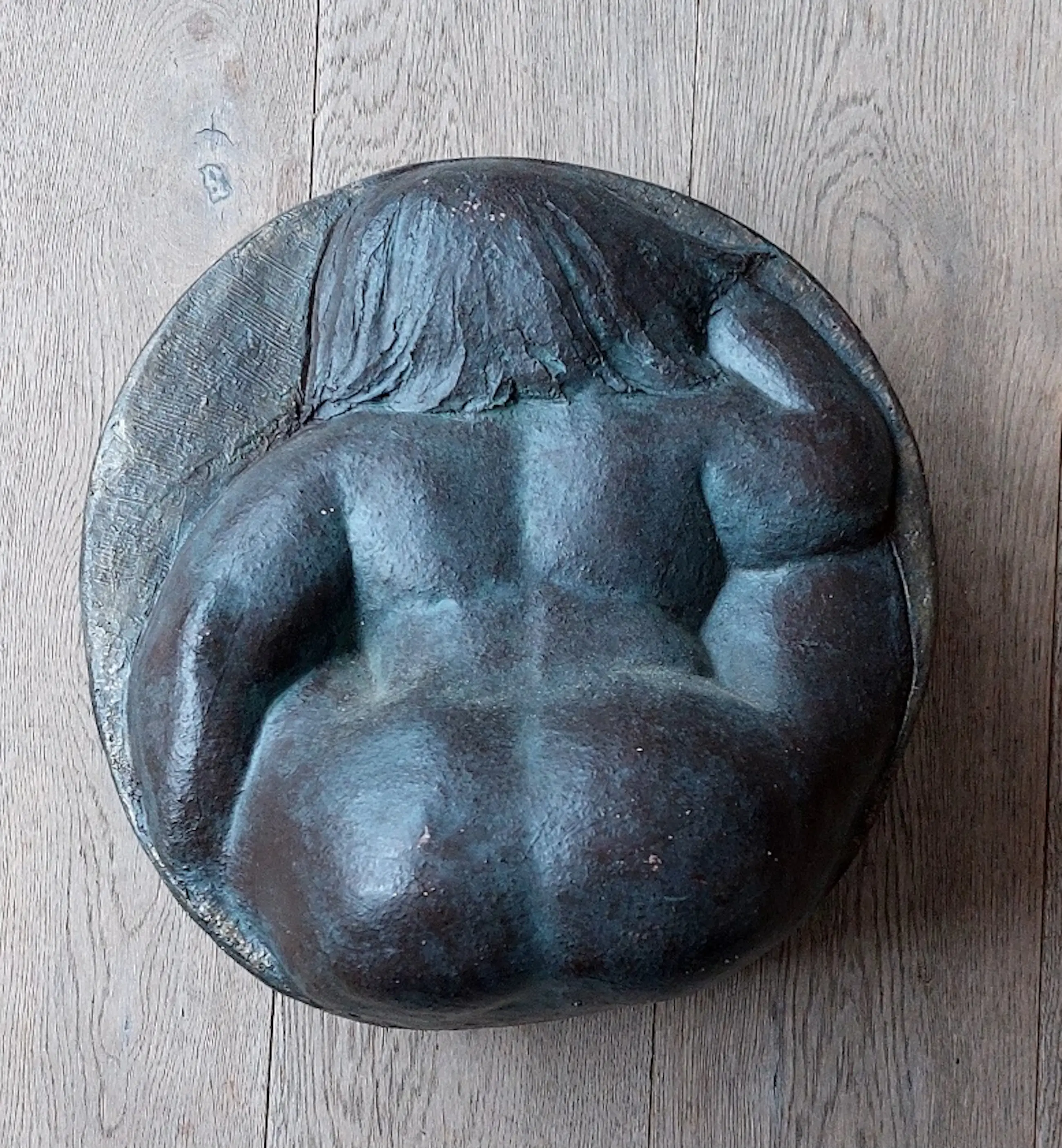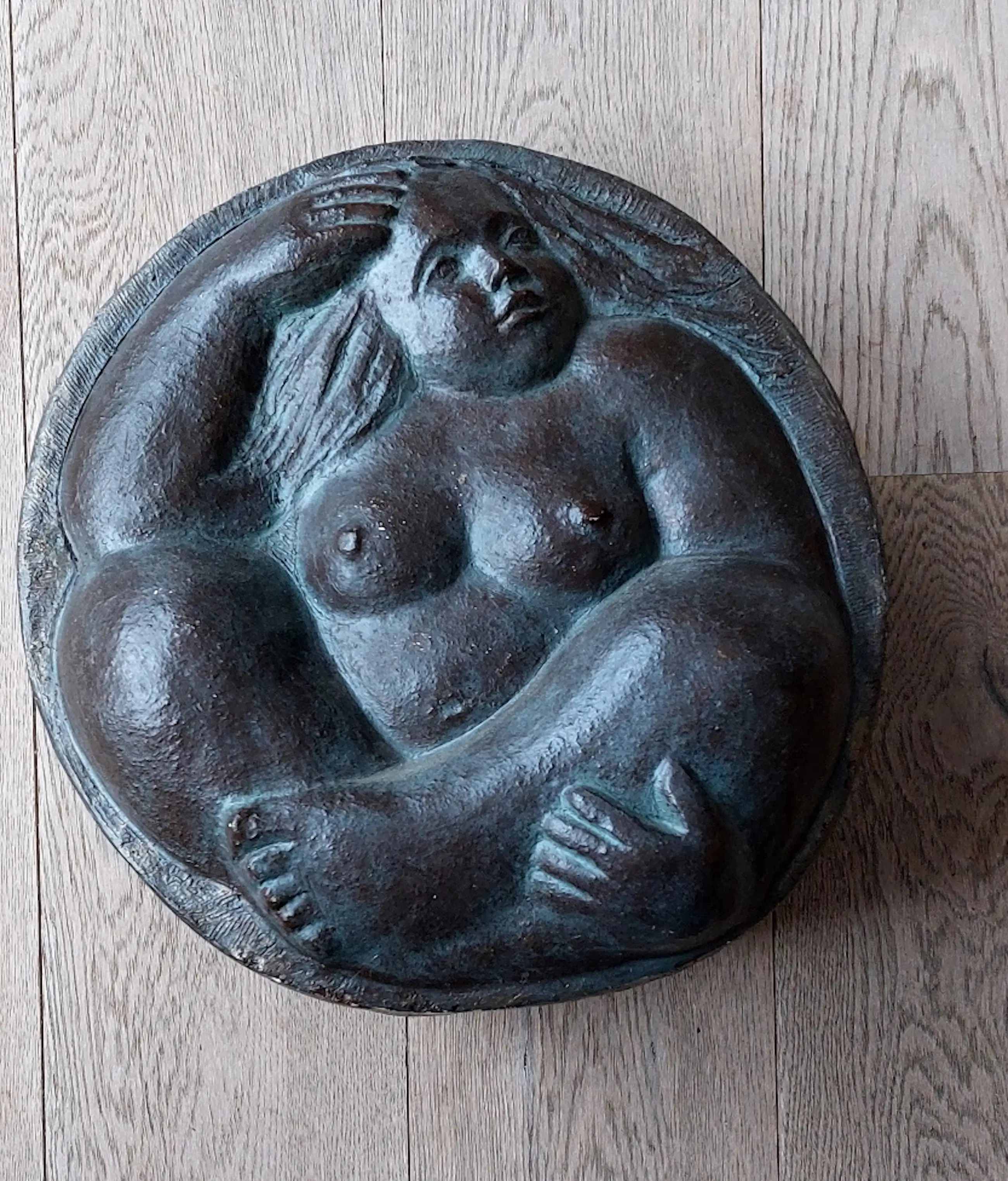 Dit mooie beeld is gemaakt uit brons gepatineerd gips. Beeldhouwgips, gesigneerd aan de onderzijde. Vrouwelijk zittend naakt.
