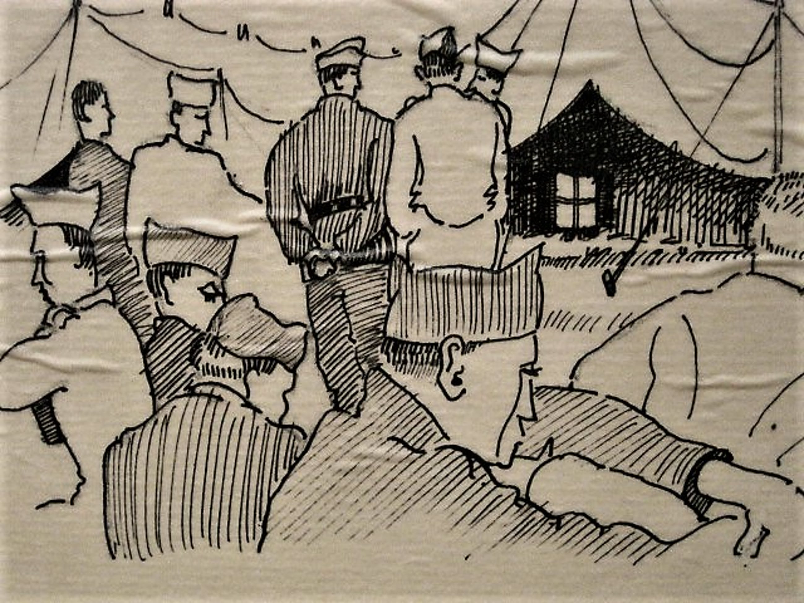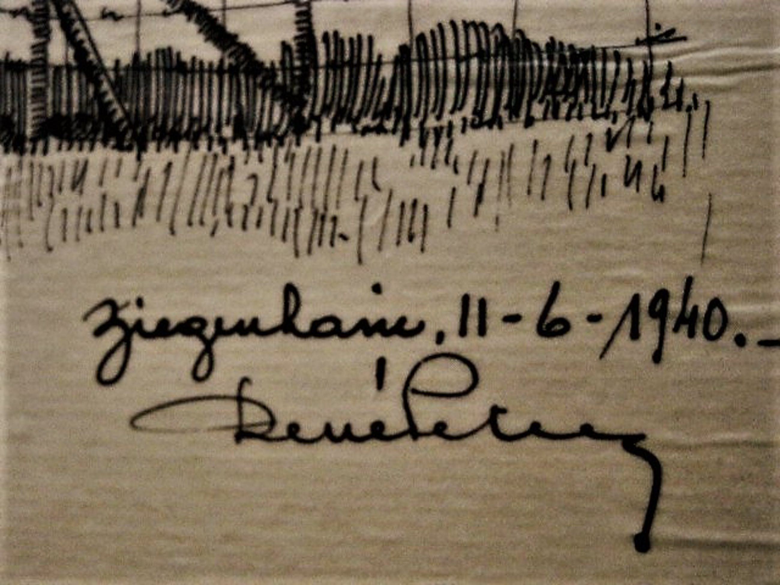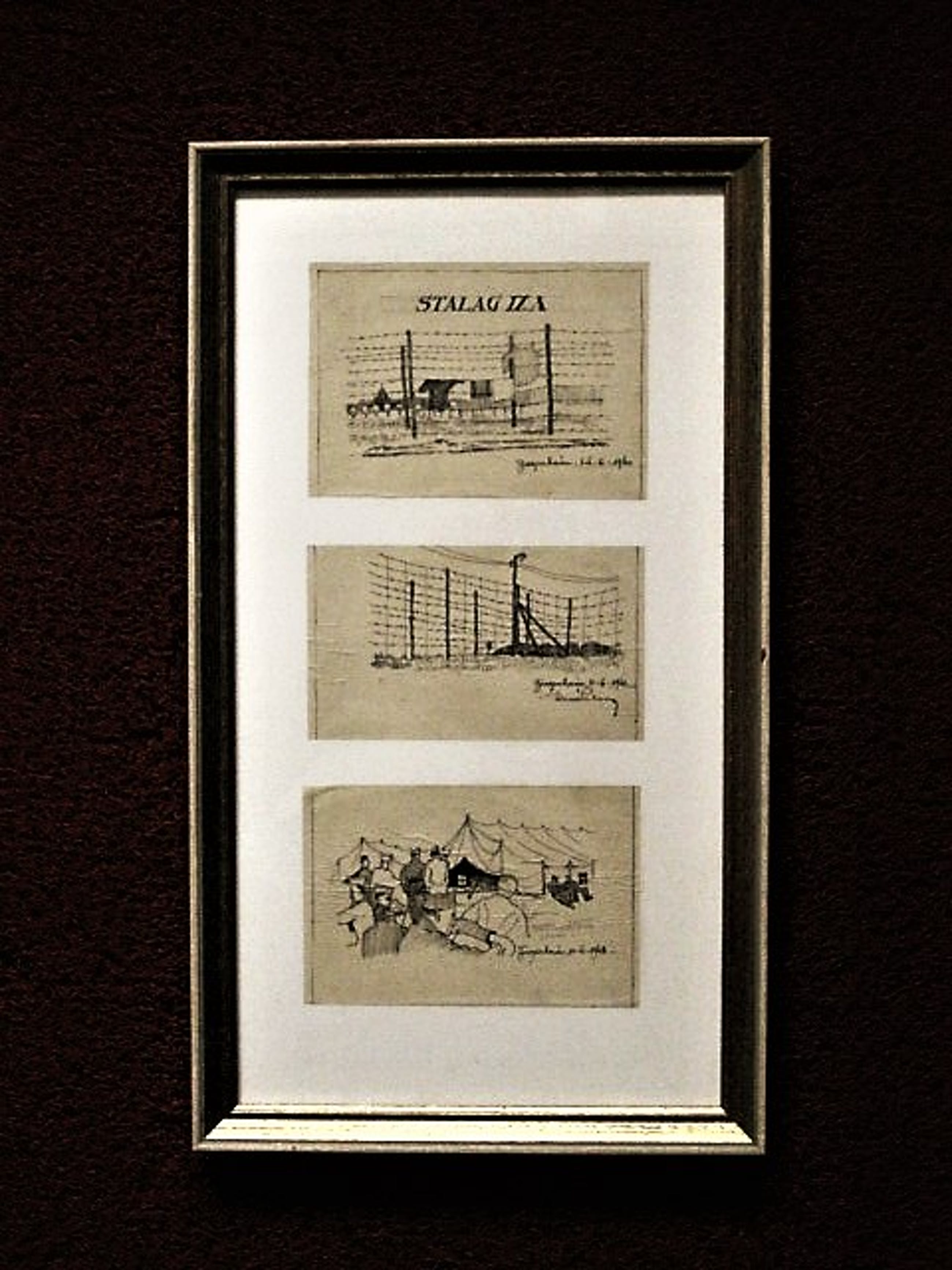 • Zeer zeldzaam en origineel! Drie (3) afzonderlijke zwarte inkt op papier uit 1940 Tekeningen / Studieschetsen van het leven in het STALAG (StammLager) 9A Ziegenhain Duitsland krijgsgevangenenkamp. Apart gesigneerd en gedateerd. Goede staat - enkele oude vouwsporen. Ingelijst in een dubbelglas lijst. Elke tekening meet 13 x 17 cm (5,2x7 ") Ingelijst zijn de afmetingen 30 x 53 cm (12 x 21,2").