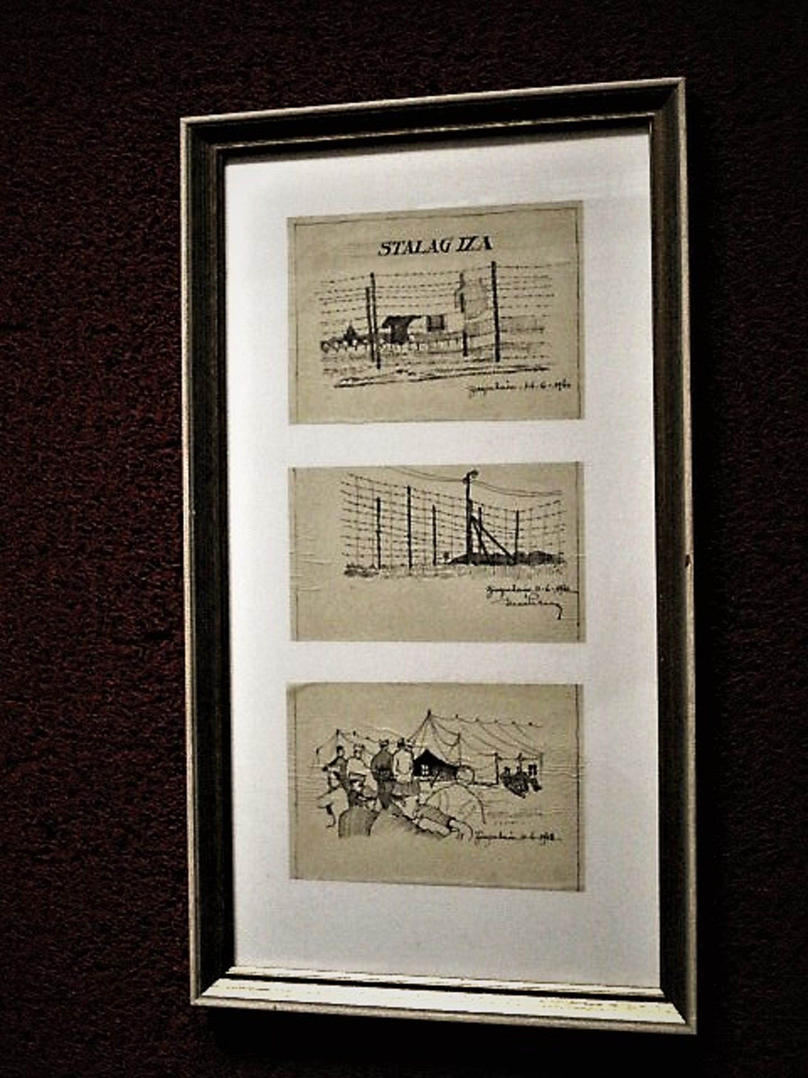 • Zeer zeldzaam en origineel! Drie (3) afzonderlijke zwarte inkt op papier uit 1940 Tekeningen / Studieschetsen van het leven in het STALAG (StammLager) 9A Ziegenhain Duitsland krijgsgevangenenkamp. Apart gesigneerd en gedateerd. Goede staat - enkele oude vouwsporen. Ingelijst in een dubbelglas lijst. Elke tekening meet 13 x 17 cm (5,2x7 ") Ingelijst zijn de afmetingen 30 x 53 cm (12 x 21,2").