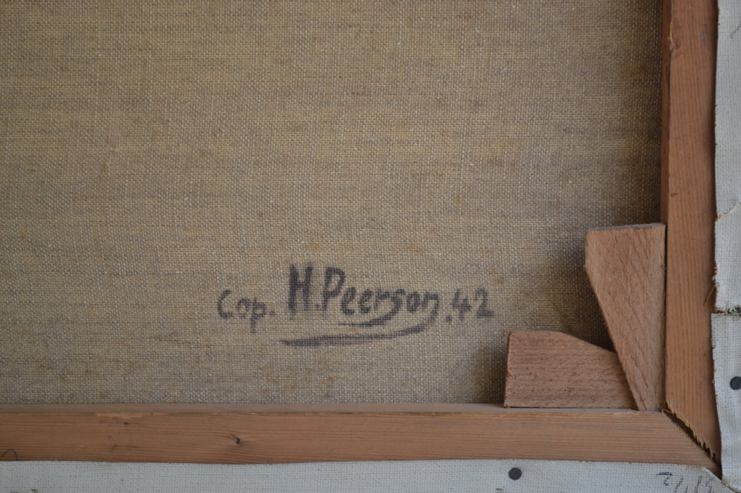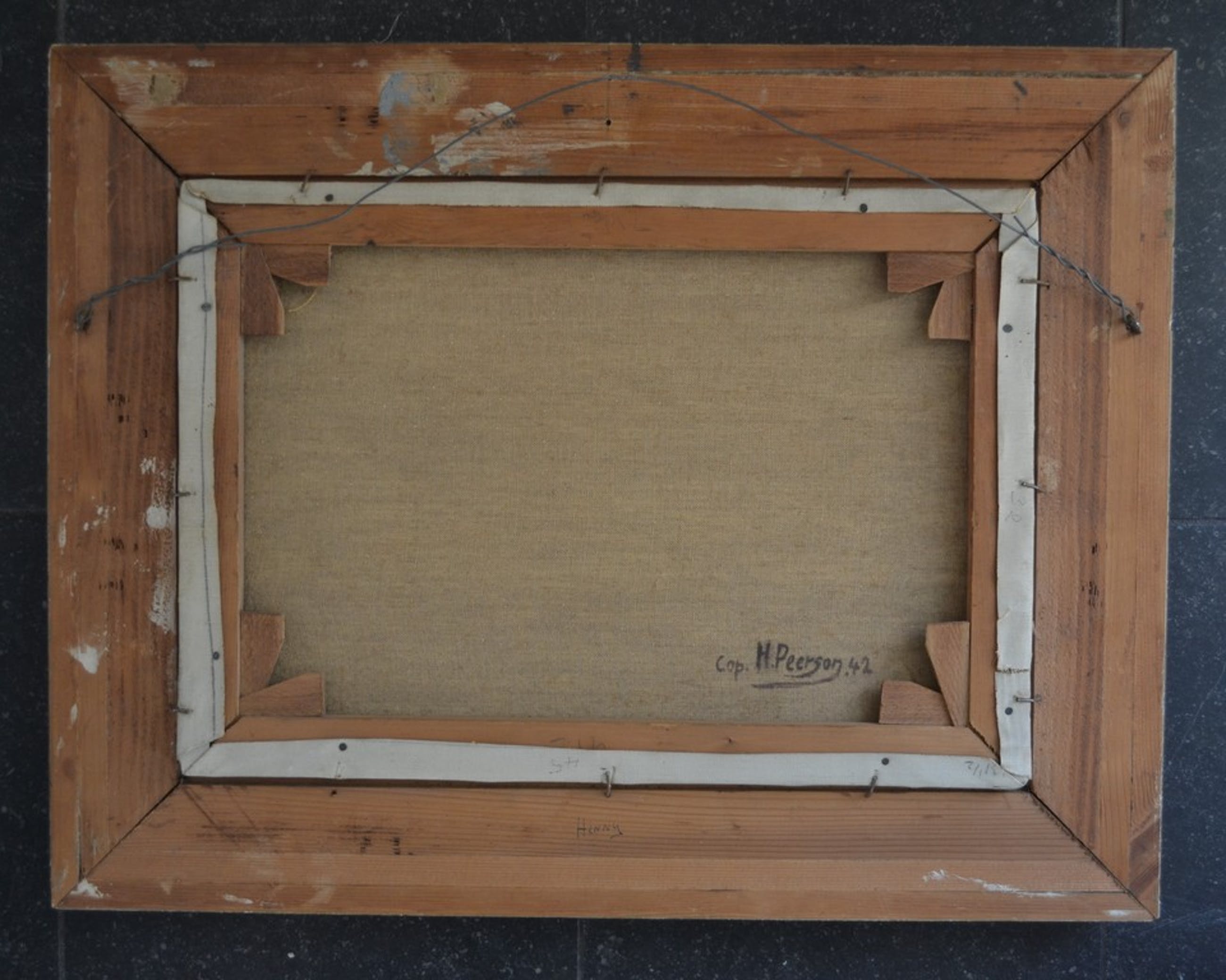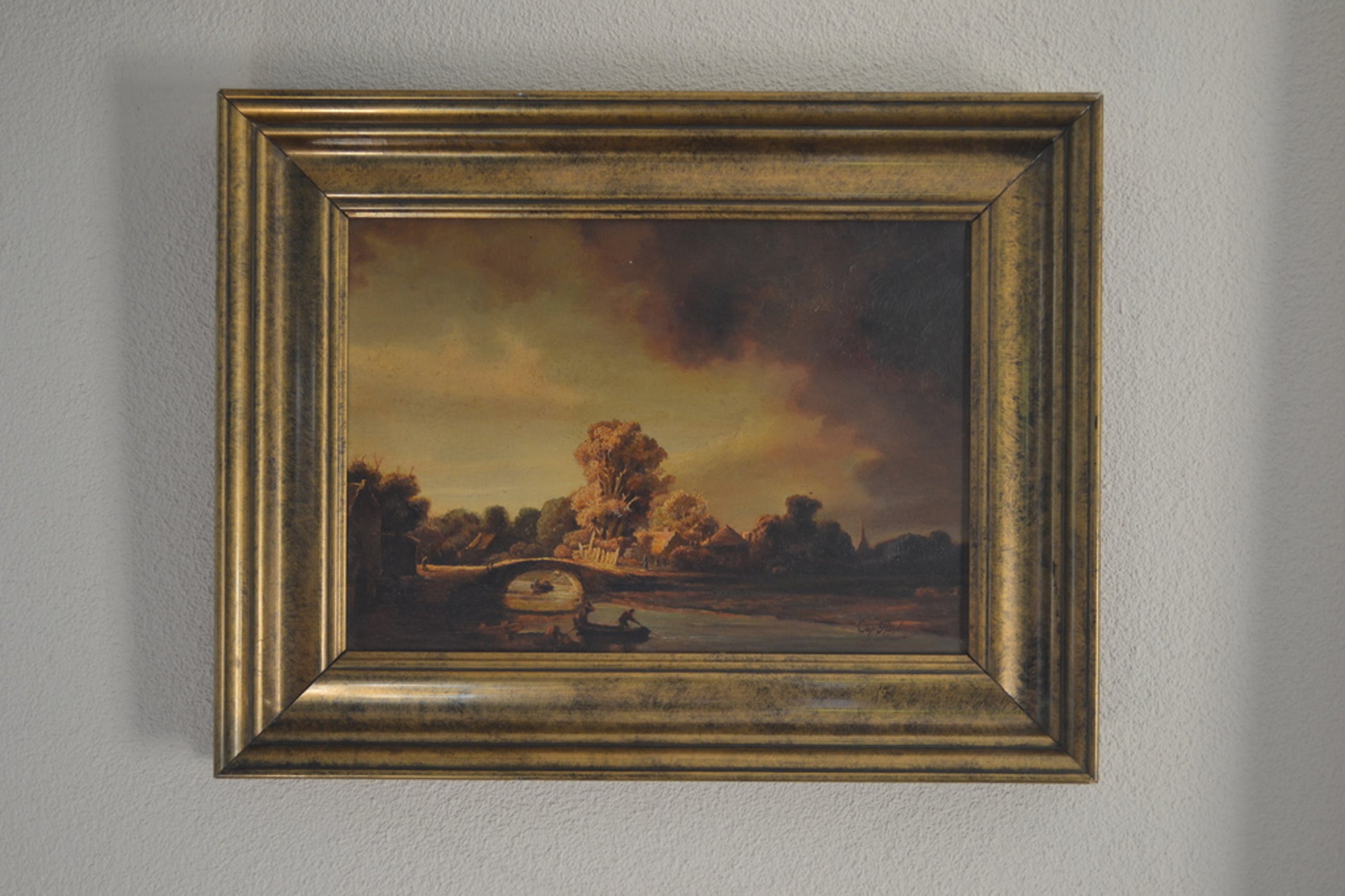 Fraai werk naar het schilderij "Landschap met stenen brug" van Rembrandt. Rechtsonder voorzien van de tekst "Copy Rembrandt" en verso voorzien van de tekst "cop. H. Peerson 42".