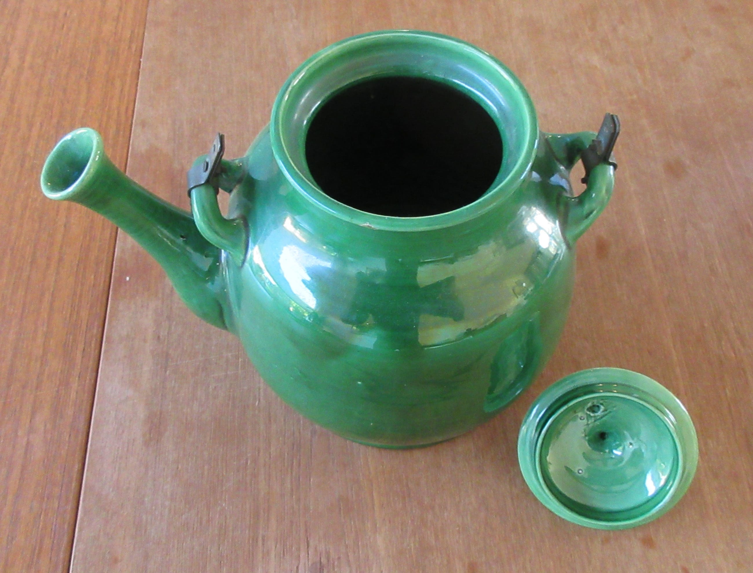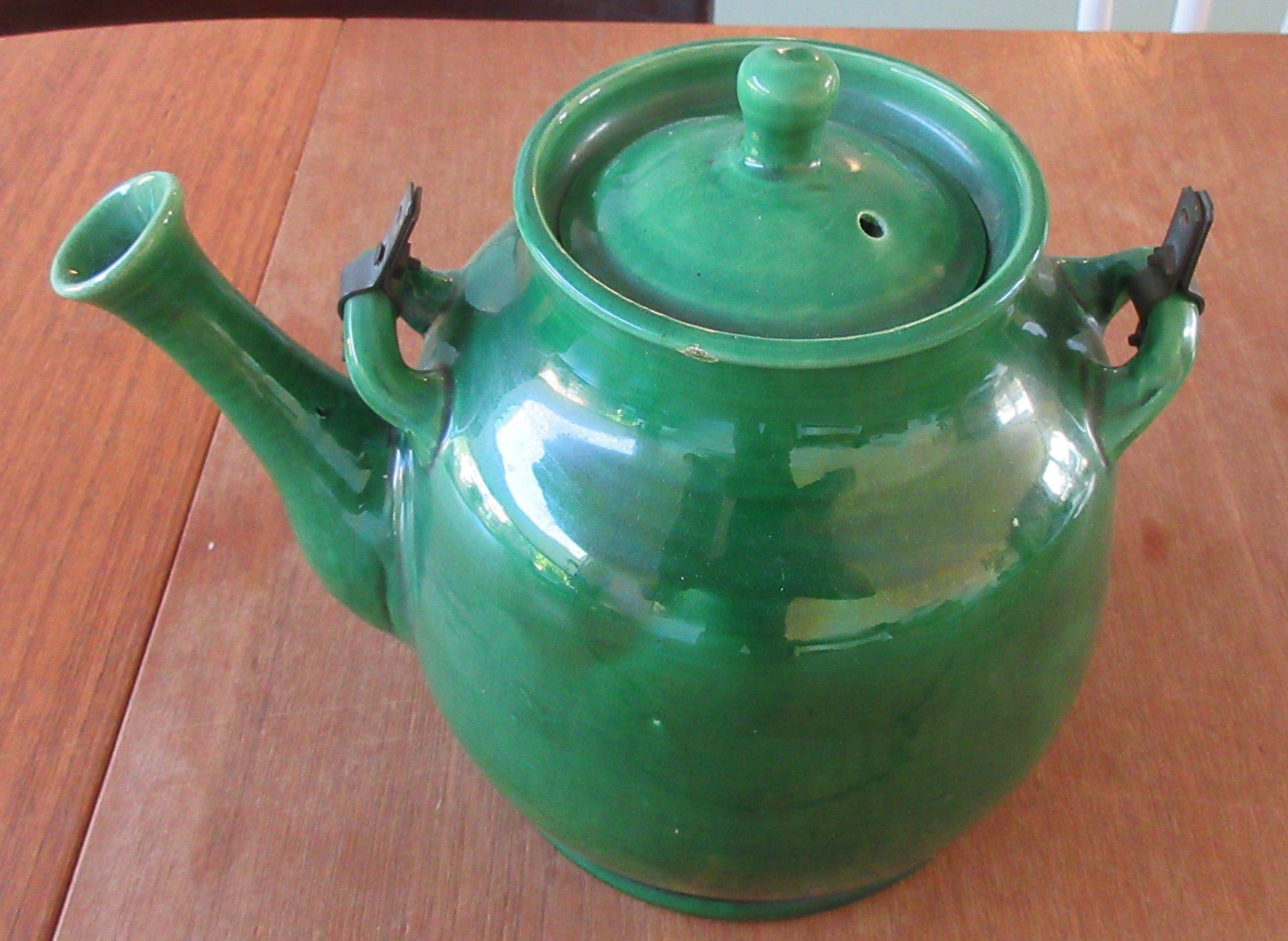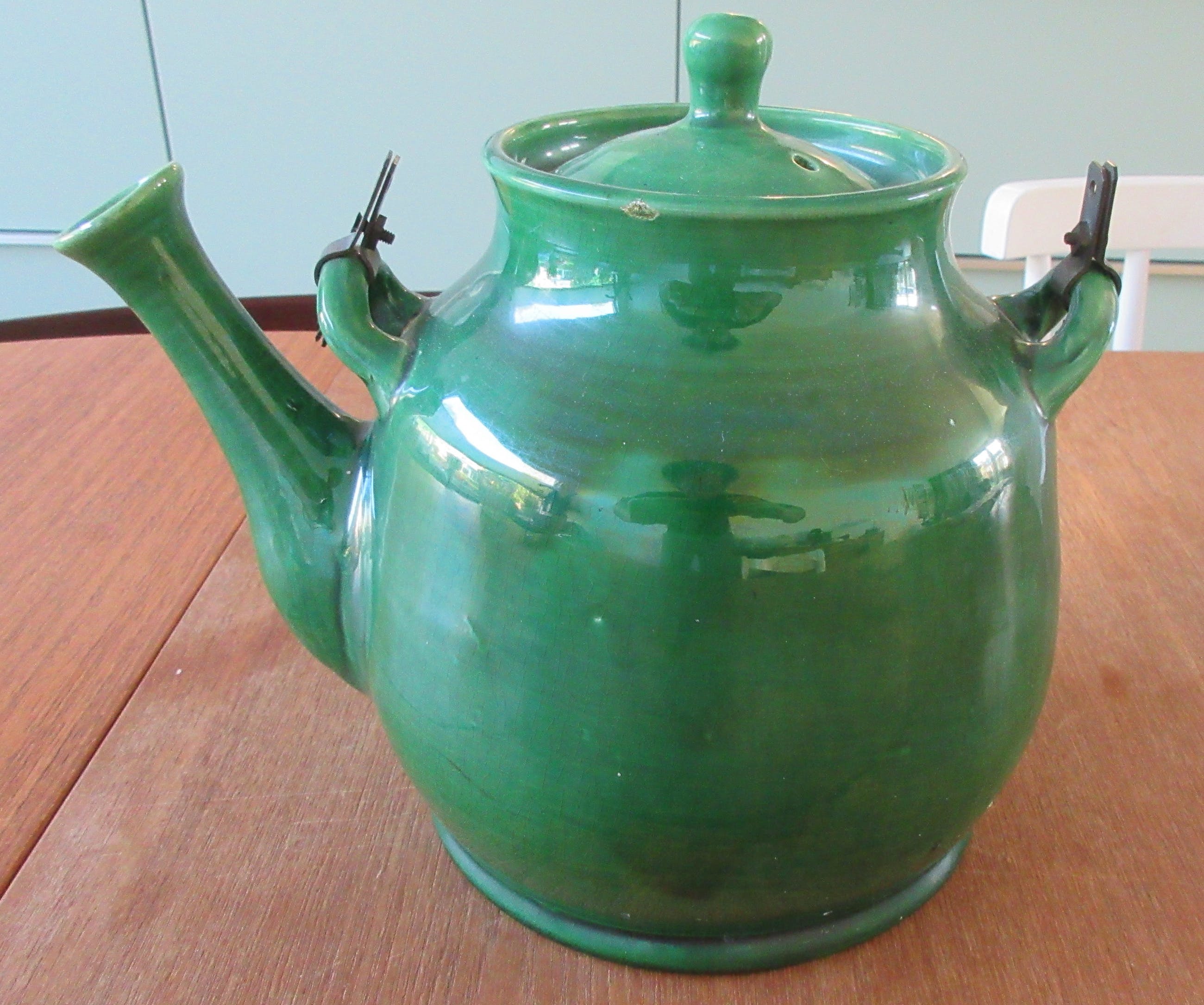 19e eeuwse groene tinglazuren volksaardewerken theepot. In prima conditie. in Nederland gemaakt, maar fabriek of stad onbekend mogelijk Gouda. Heeft twee chipjes en mist zijn (rieten)hengsel.