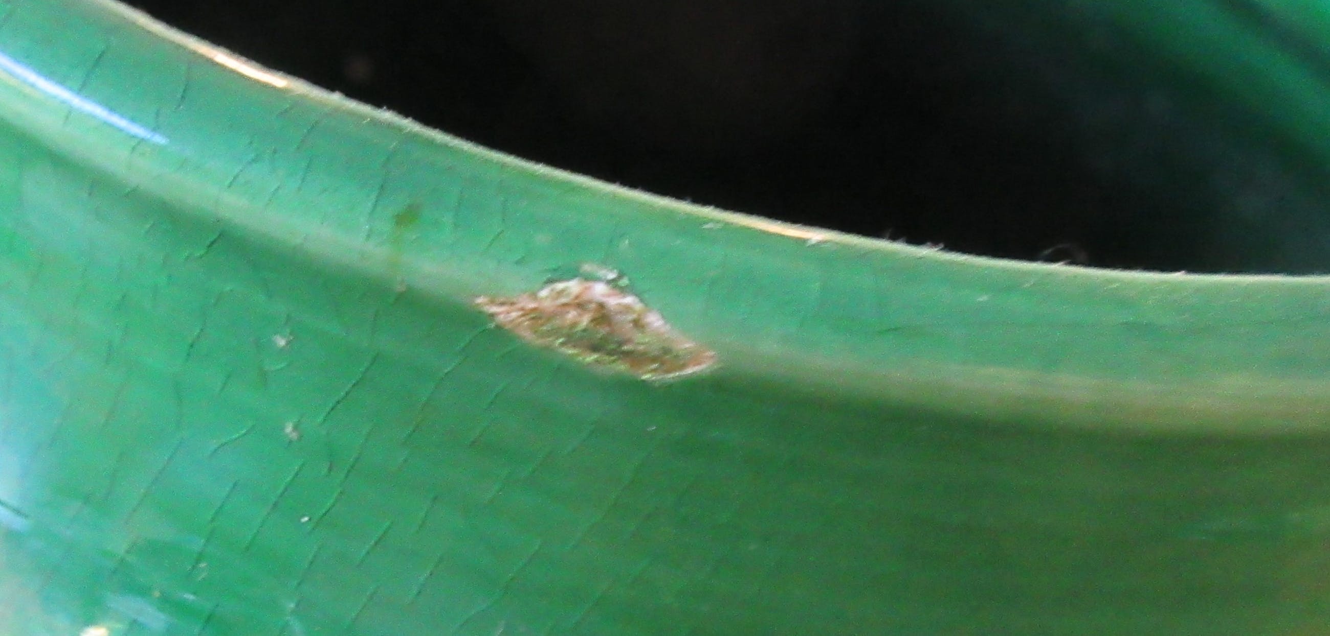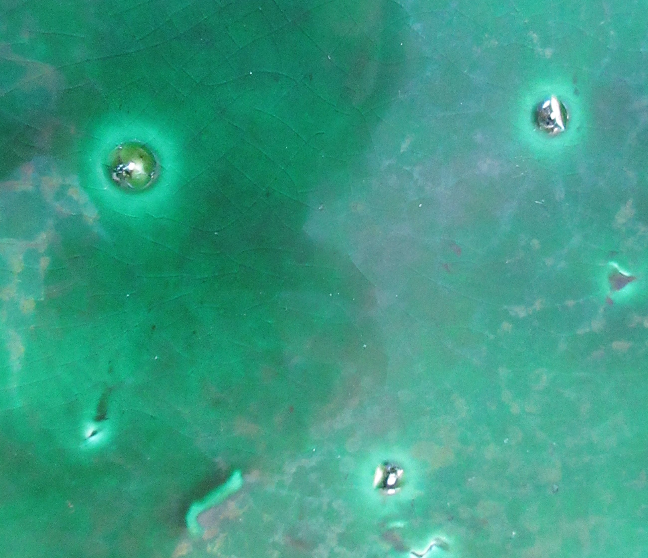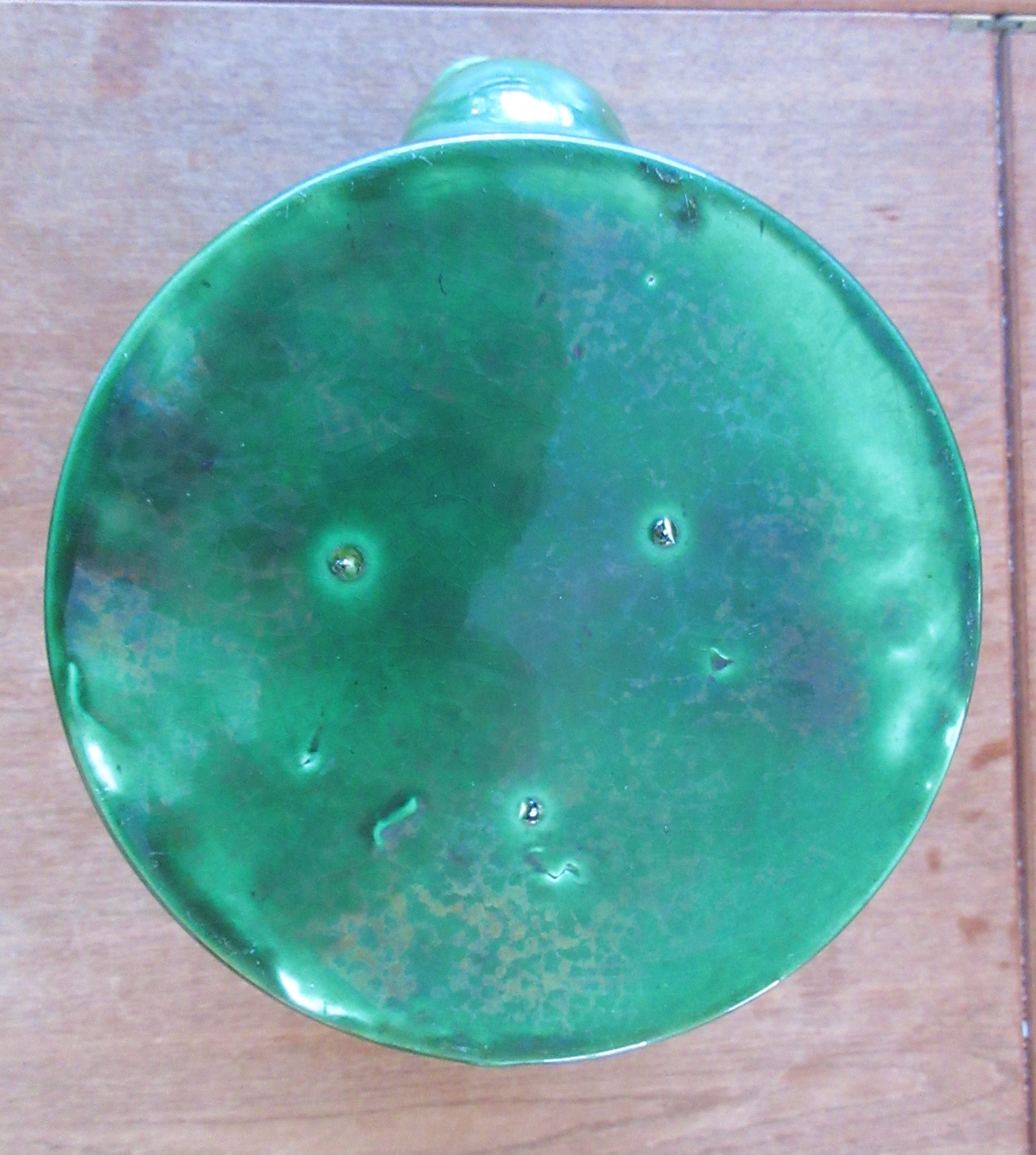 19e eeuwse groene tinglazuren volksaardewerken theepot. In prima conditie. in Nederland gemaakt, maar fabriek of stad onbekend mogelijk Gouda. Heeft twee chipjes en mist zijn (rieten)hengsel.