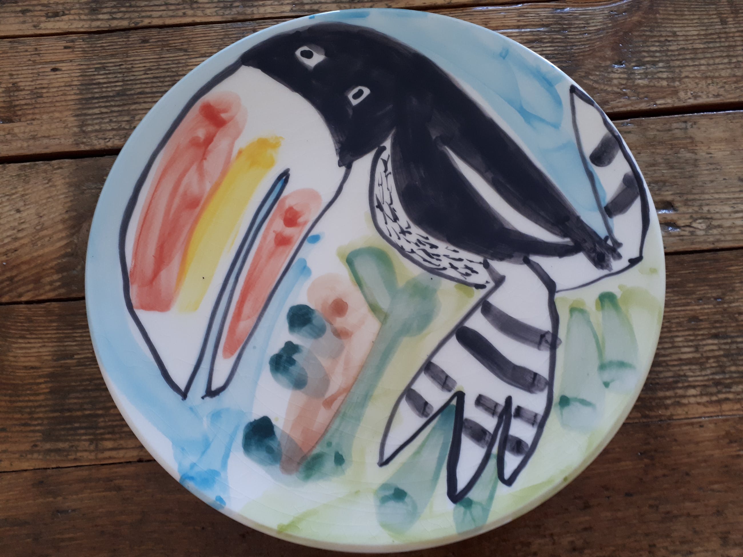 2 borden met vogelmotief in nieuwstaat (met uitsparing om op te hangen).