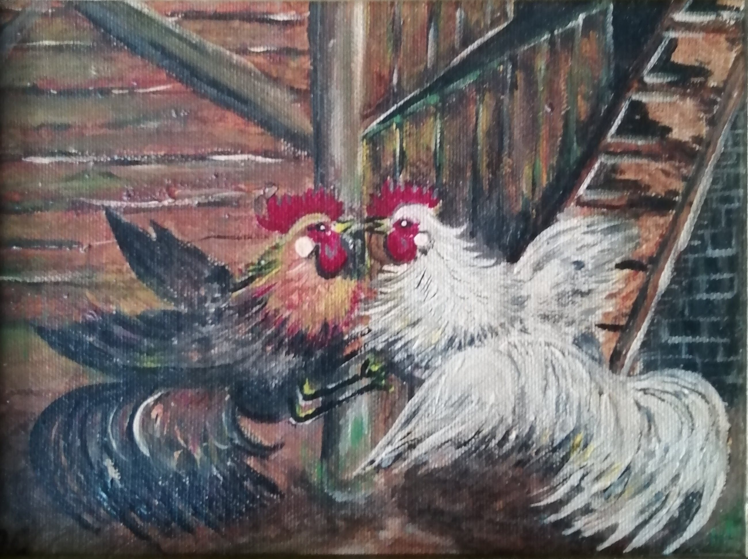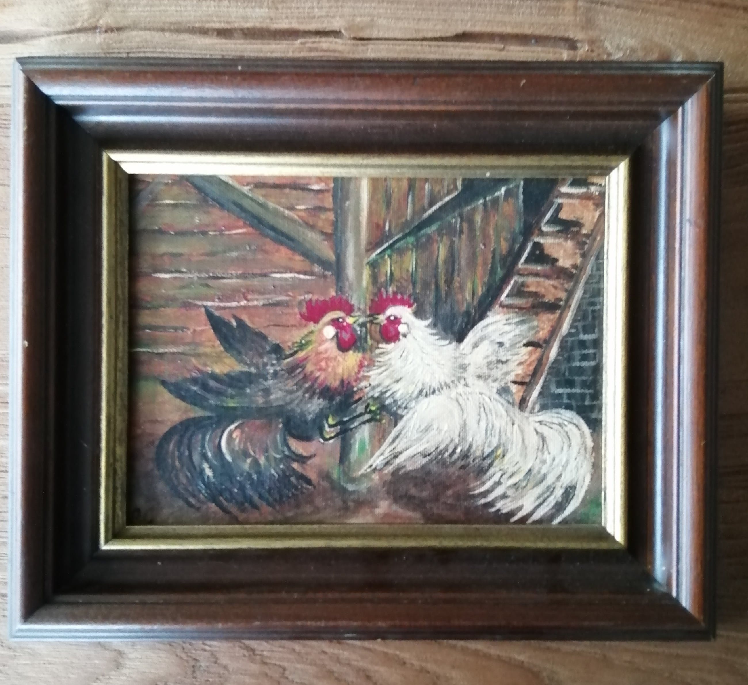 Pracht tafereel van 2 kemphanen in de naïeve kunststroming, begin 20e eeuw.