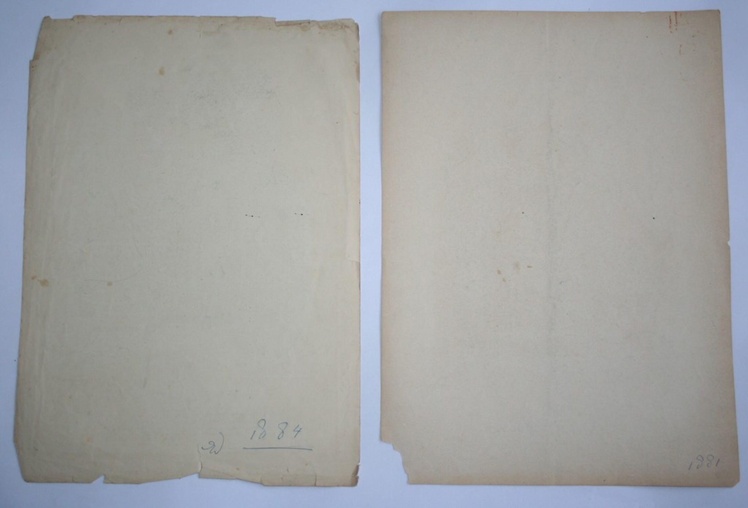 Deze twee lithografieen hebben kreukjes, een vouw in het midden en bij een schade aan de onderzijde, in de marge. Lithografische afdrukken uit modebladen. Afmeting 37 x 26 cm.