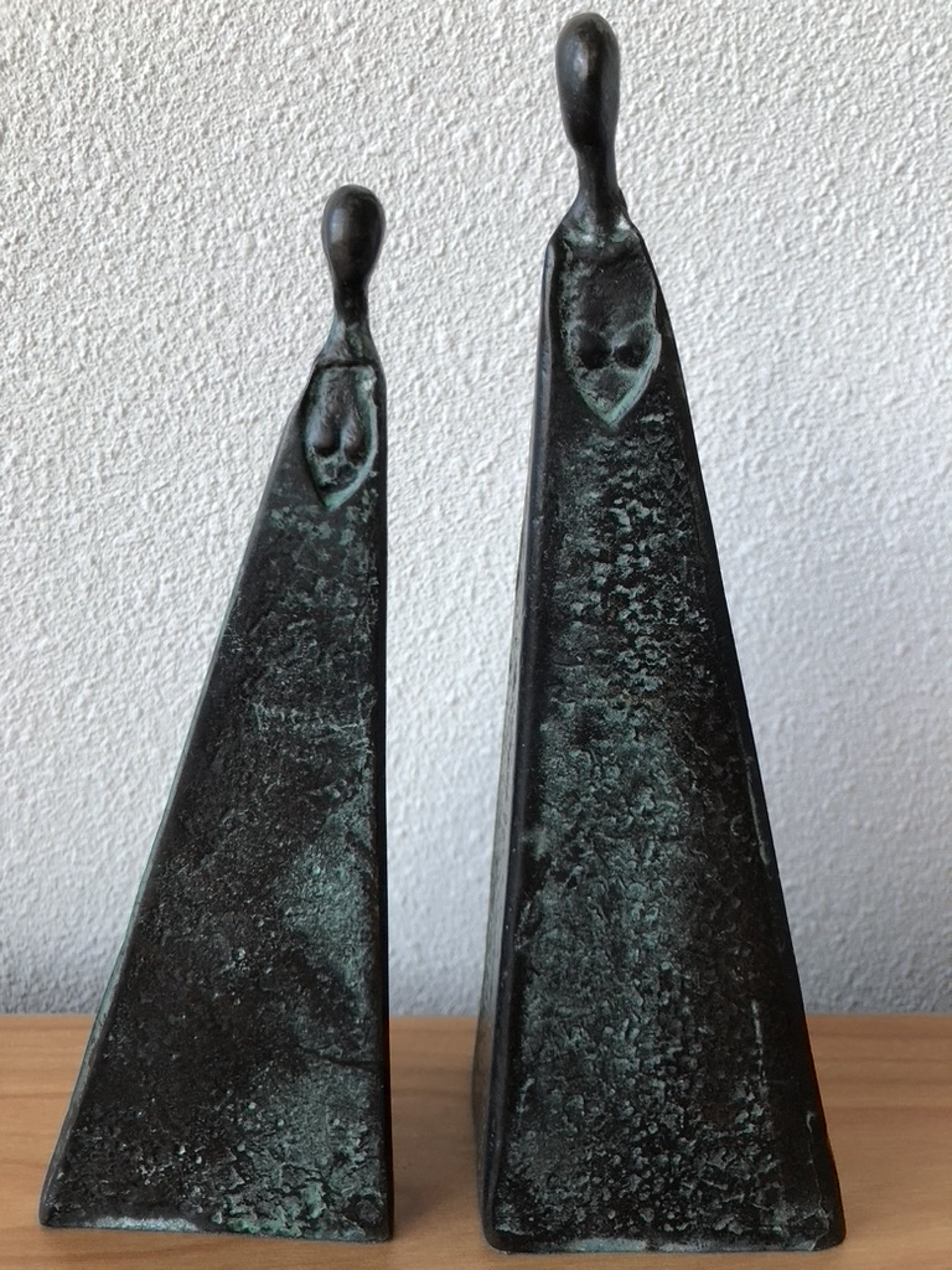 Het ene beeldje is 22 cm en het andere 19,5 cm hoog.