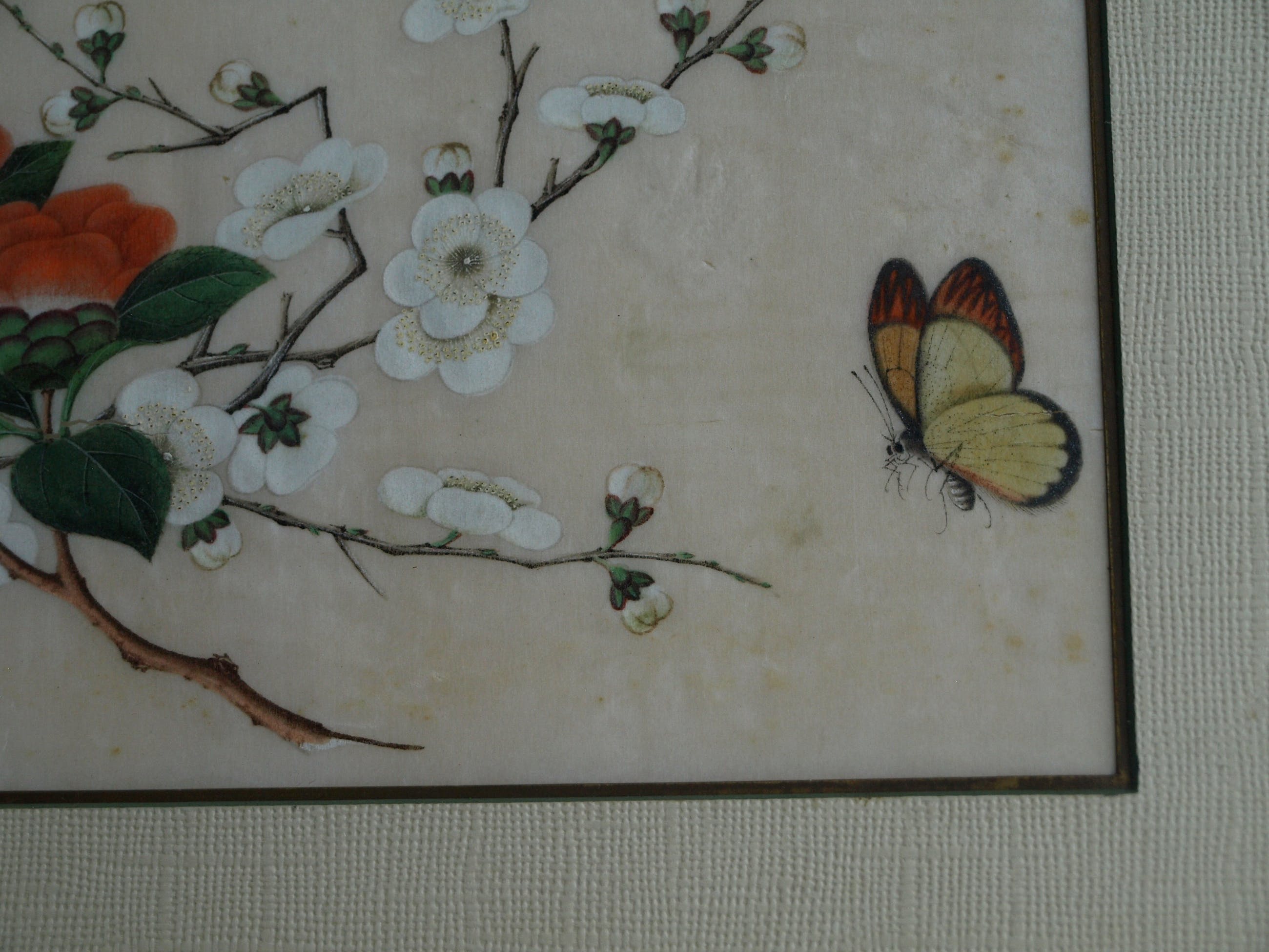 -Conditie: In redelijke staat. Het werk met de blauwe vlinder heeft een horizontale scheur en ‘zuurvlekjes’ in het papier en het passe-partout heeft vochtvlekken en is ‘vergeeld’. Het werk met de 2 vlinders heeft een scheur in het midden en een gaatje middenboven in het papier. De lijsten hebben slijtplekjes.
