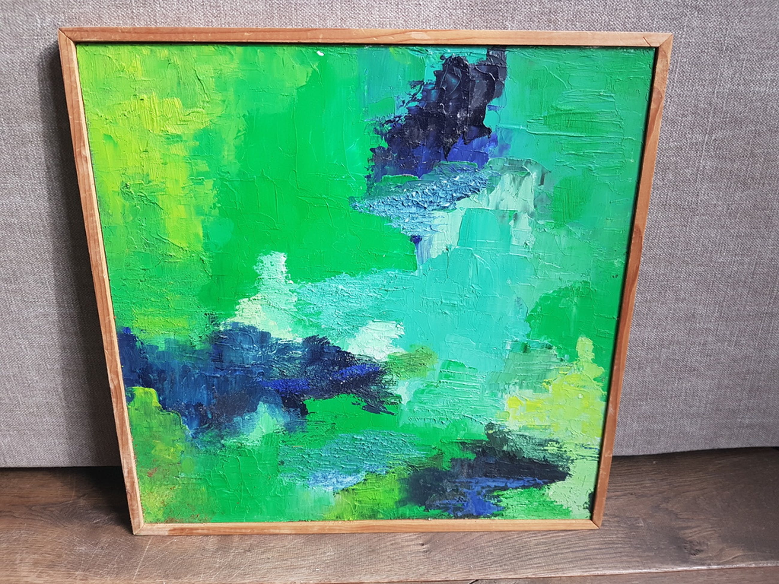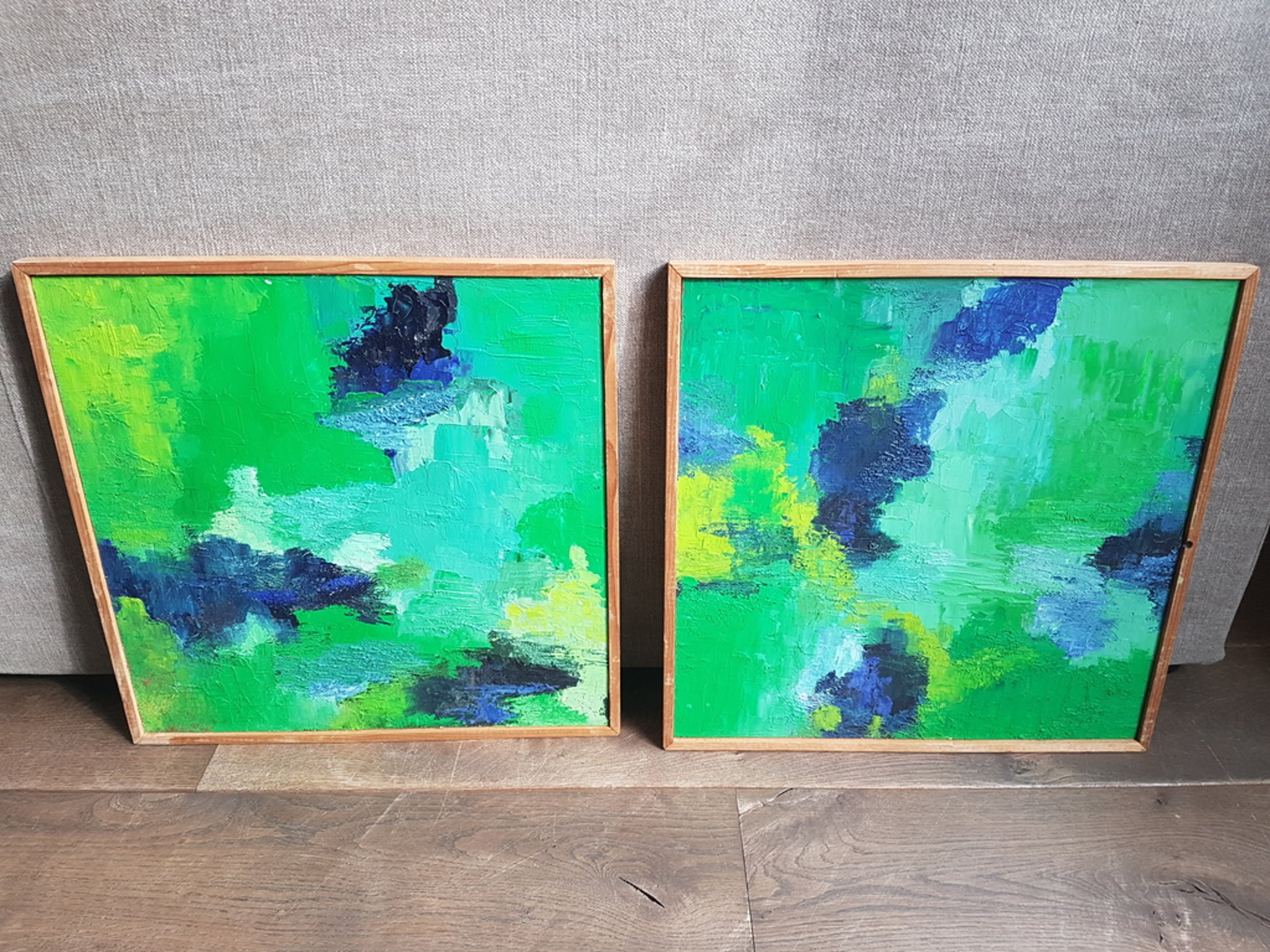 Set van twee mooie abstracte schilderijen, olieverf op board, aan de achterzijde onduidelijk gesigneerd met pen (zie foto's).