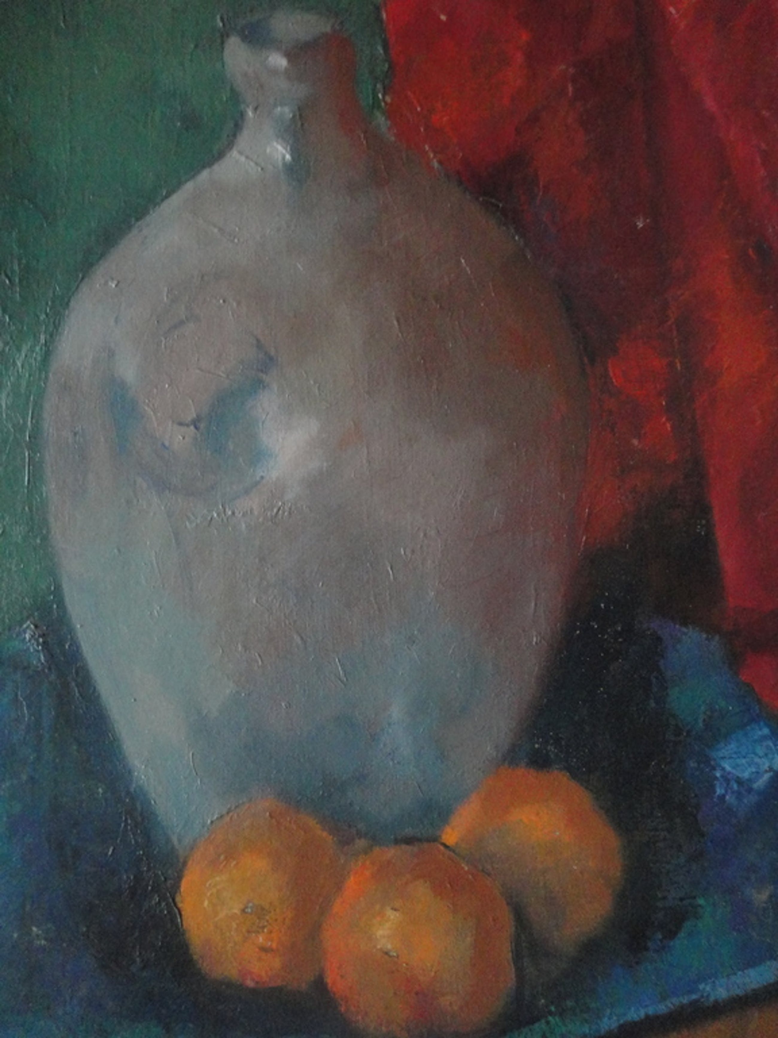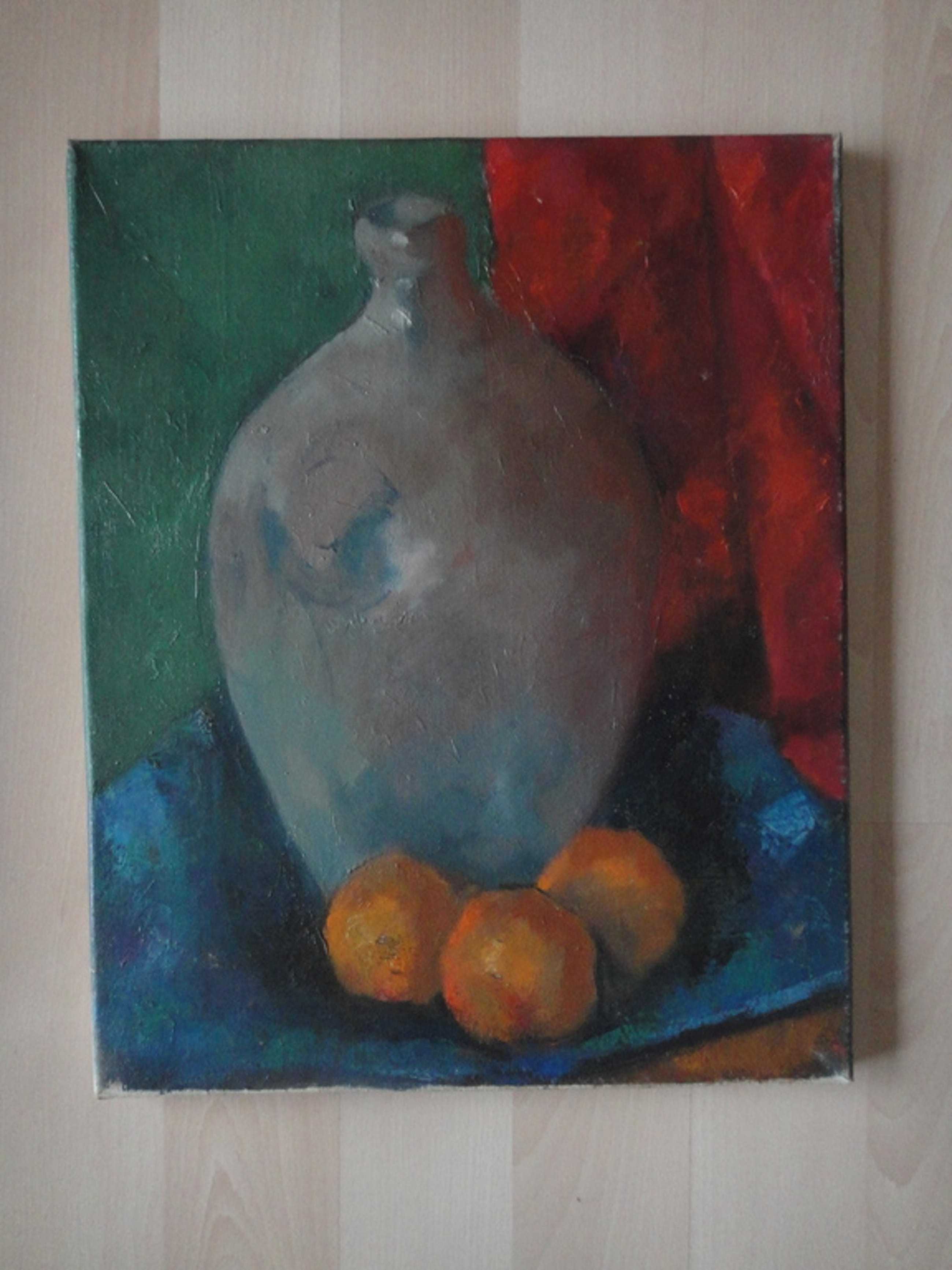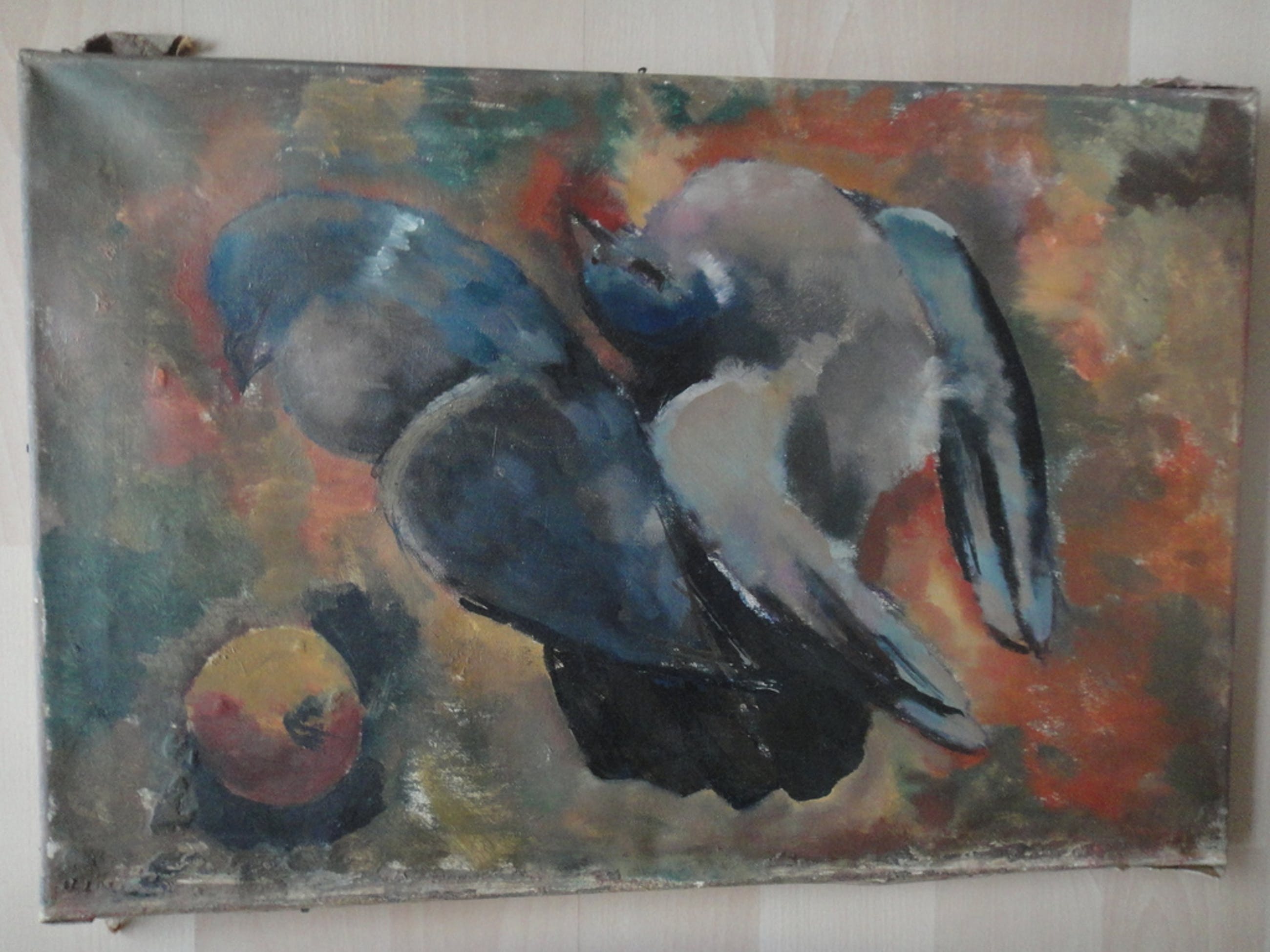 Eénmaal 40 x 50 cm: stilleven met aarderwerk kruik en éénmaal 40 x 60 cm: stilleven met duif.
