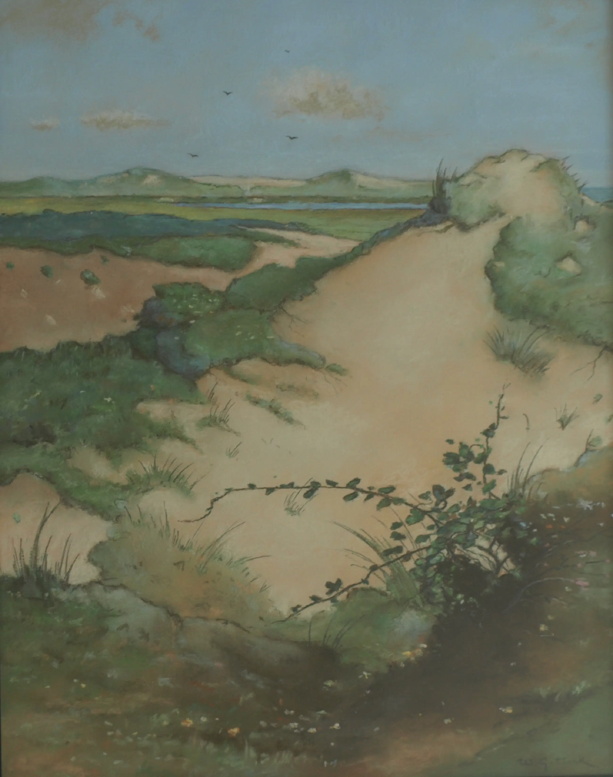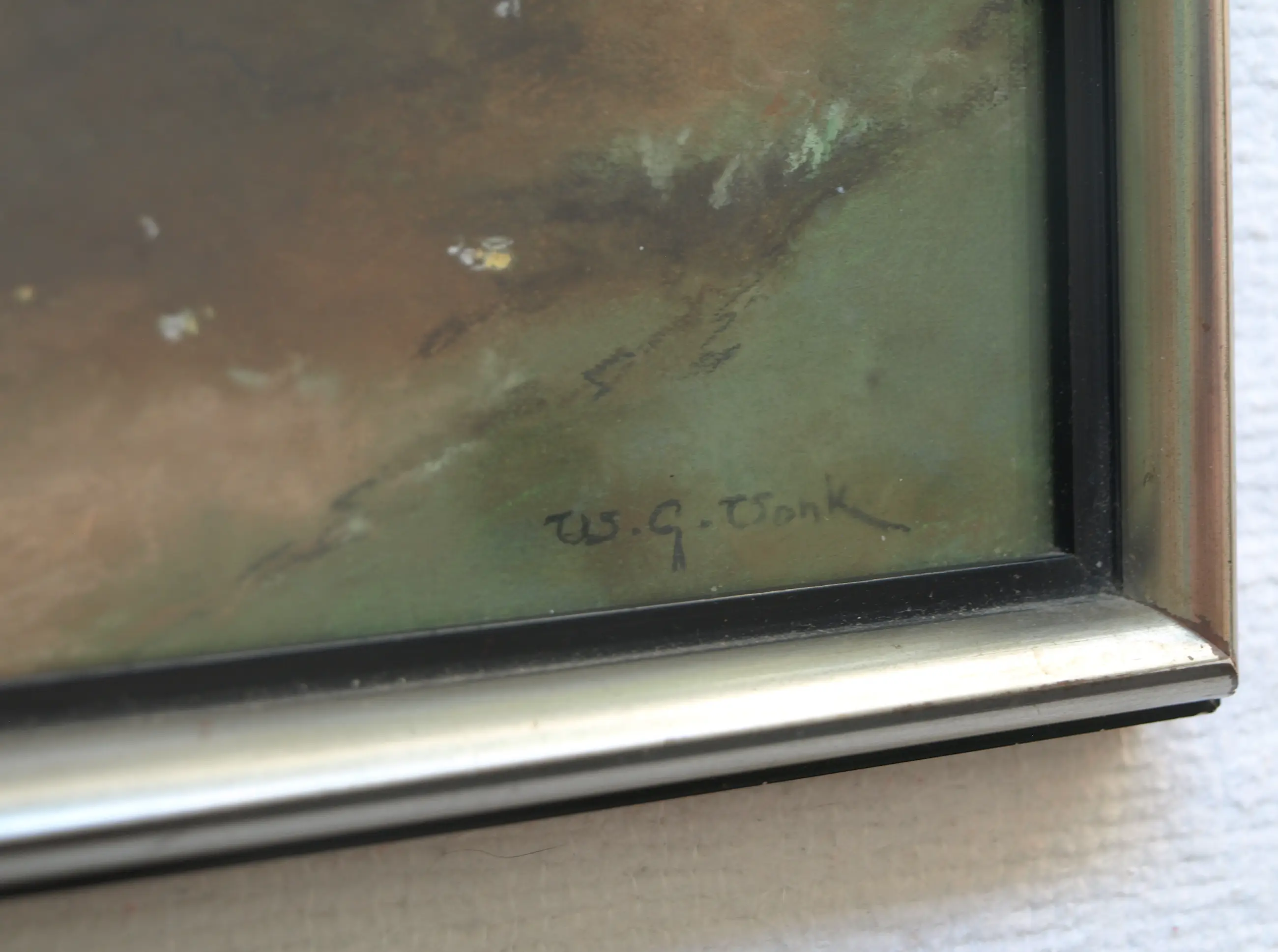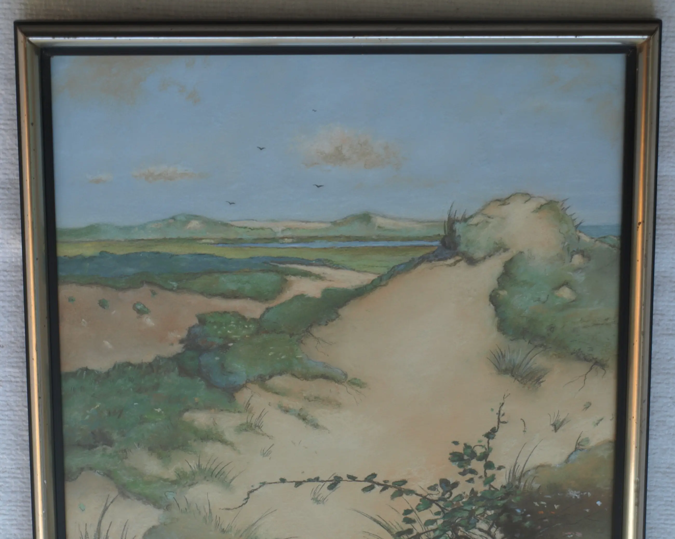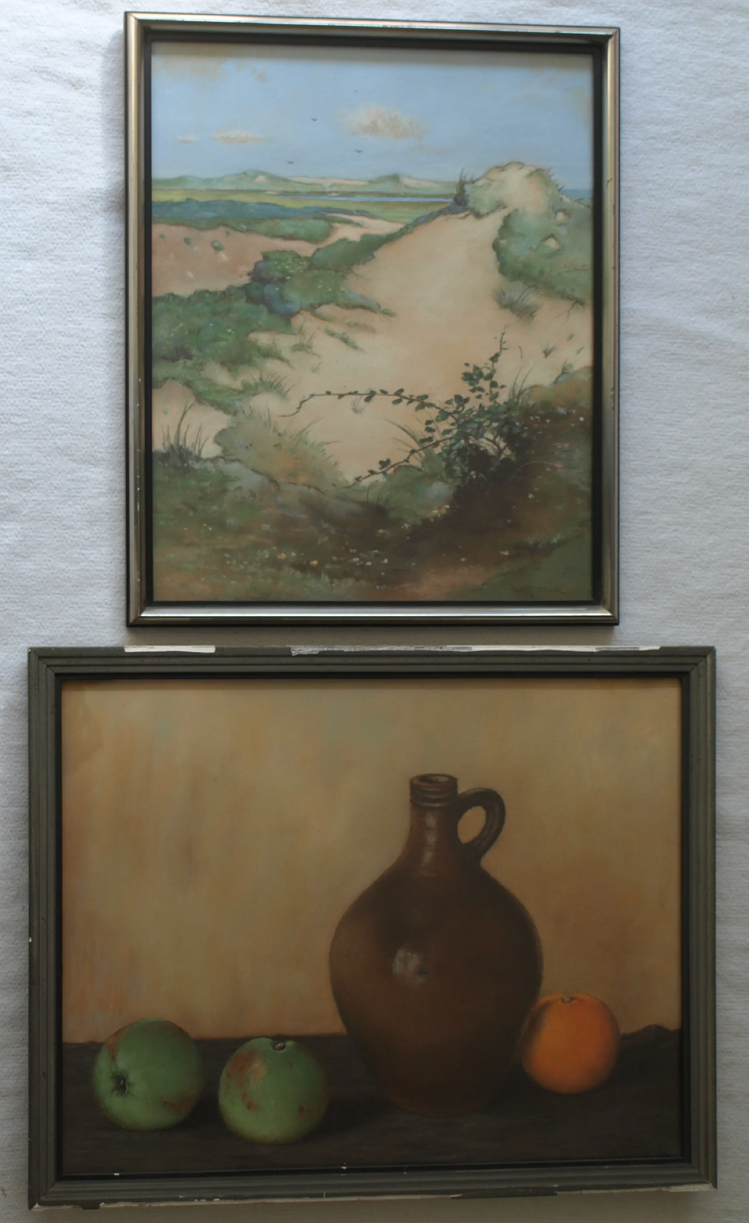 2 Pasteltekeningen van een ons onbekende kunstenaar. -Beide tekeningen zijn gesigneerd rechtsonder. Jaartal onbekend. -Beide tekeningen zijn ingelijst in een houten lijst met glasplaat. -Afmetingen: Lijsten, 38½ x 31½ cm (Duinlandschap) en 34½ x 43½ cm (Stilleven). Beeld, 34½ x 28 cm en 31 x 40 cm. -Herkomst: Uit een inboedel. Conditie: Beide pasteltekeningen zijn in goede staat. De lijst van het duinlandschap heeft slijtplekjes. De lijst van het stilleven heeft beschadigingen aan de randen. Zie ook de foto’s voor een eigen indruk.