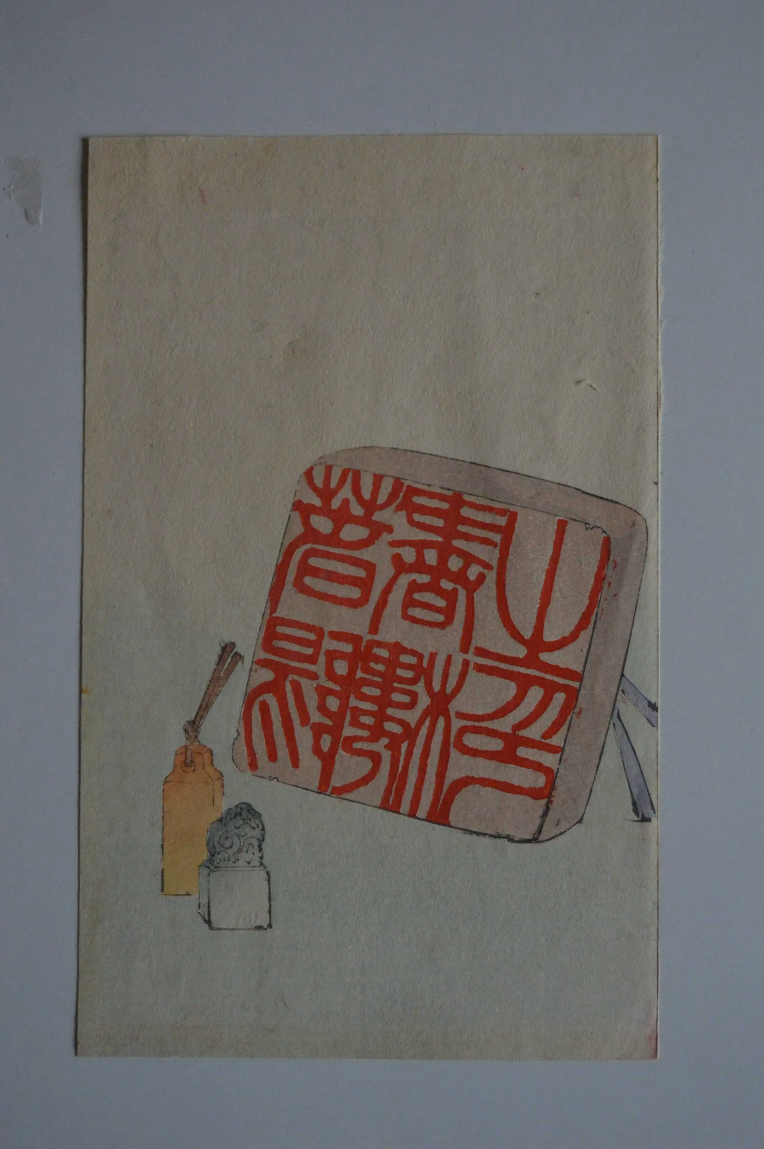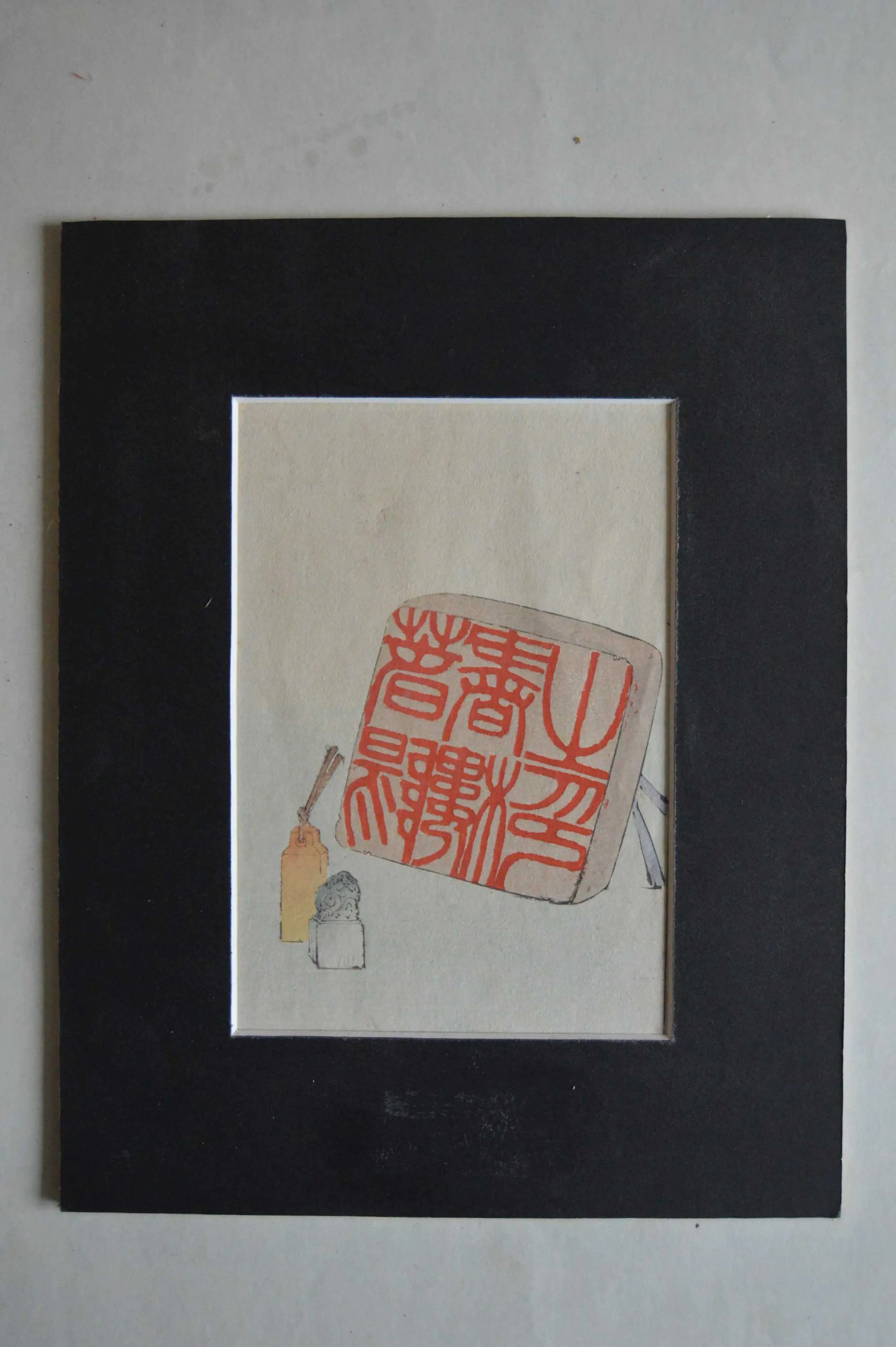 1. Schildersgereedschap van kunstenaar. in PP. Afmetingen 35 x 25 cm. incl. PP. Gesigneerd. 2. Stilleven. Afmetingen 25 x 20 cm. incl.PP zwart. 3. Boer met koe in landschap. Afmetingen 23 x 16 cm. Incl zijden PP. Gesigneerd.