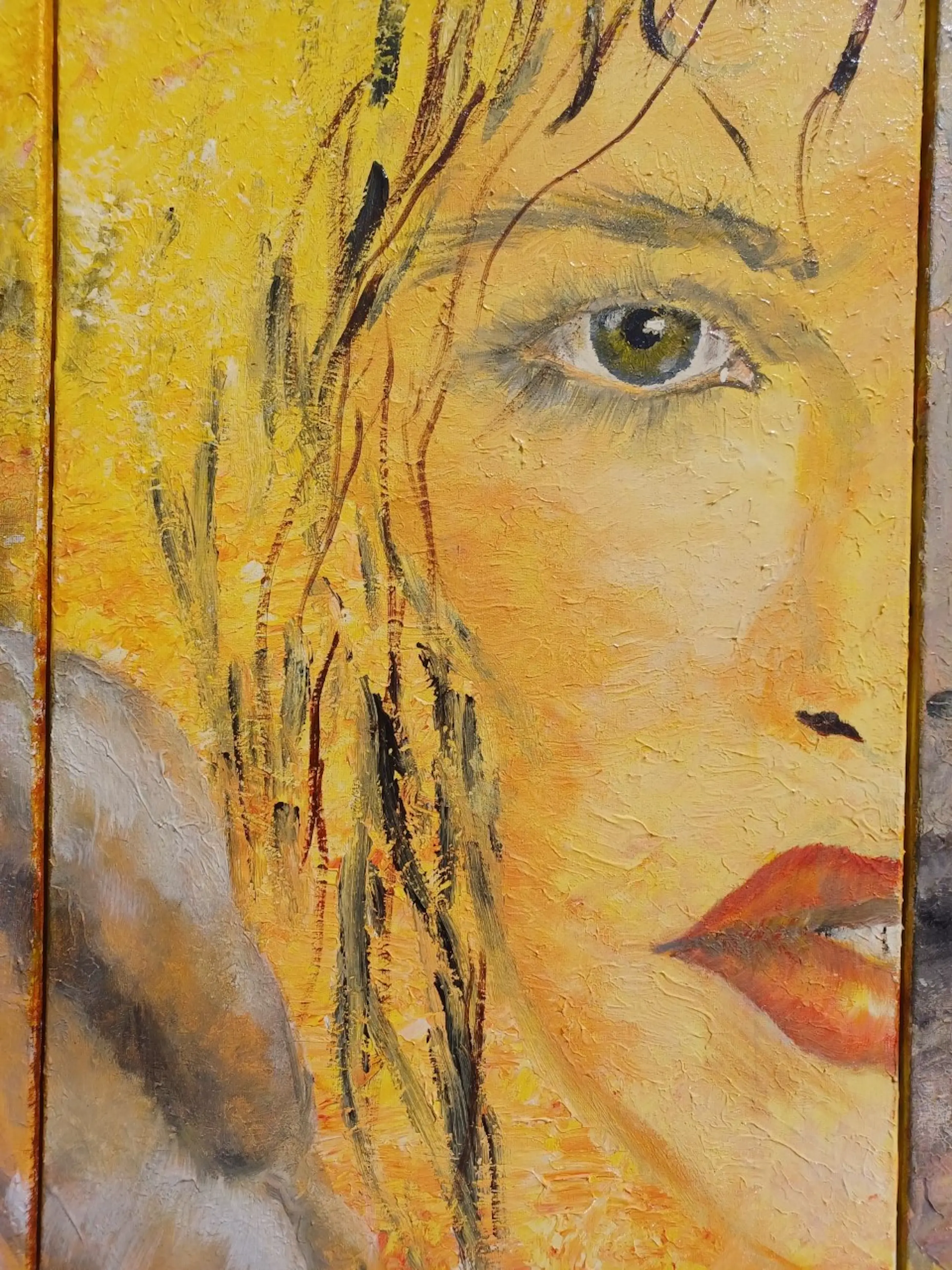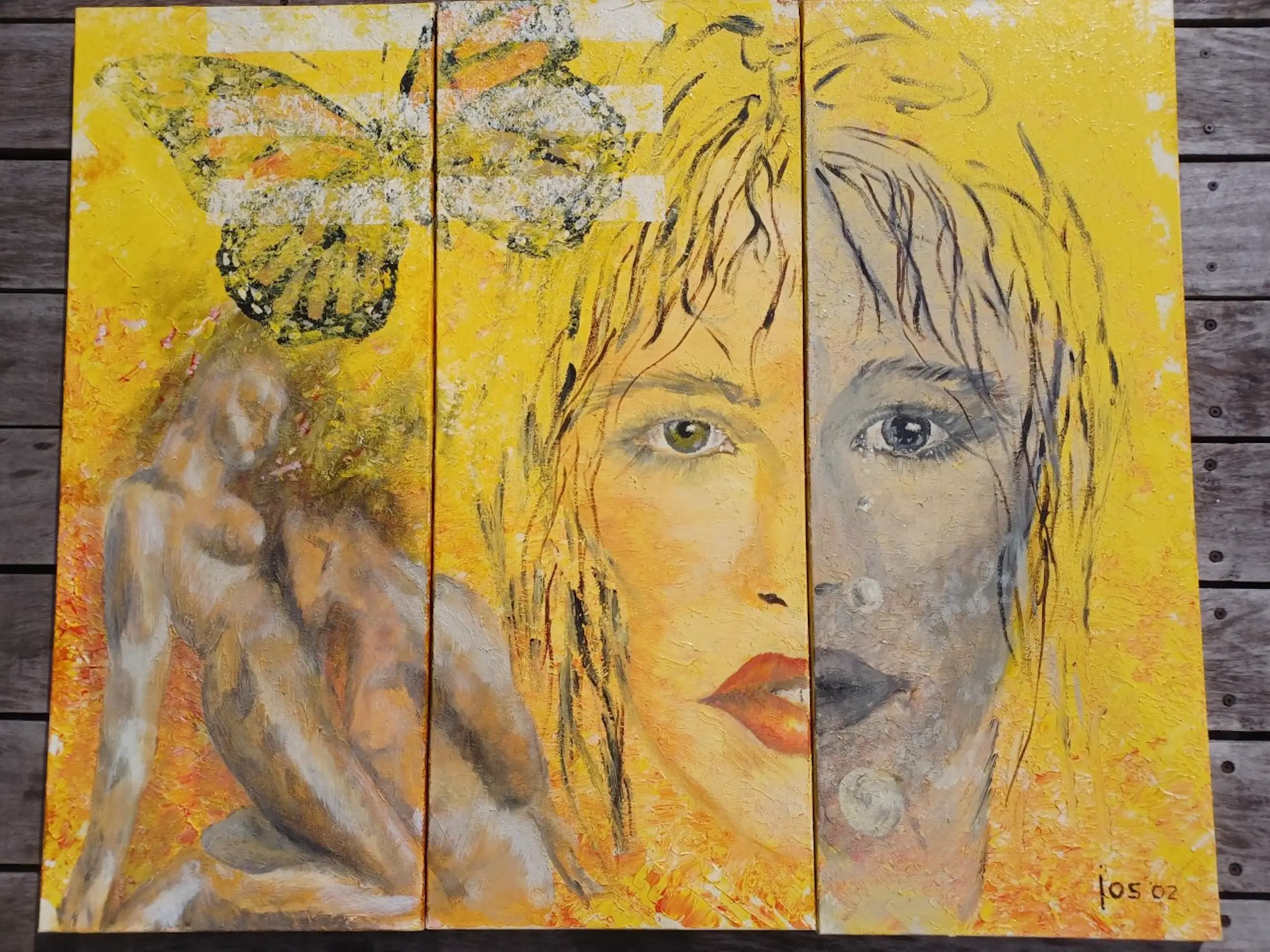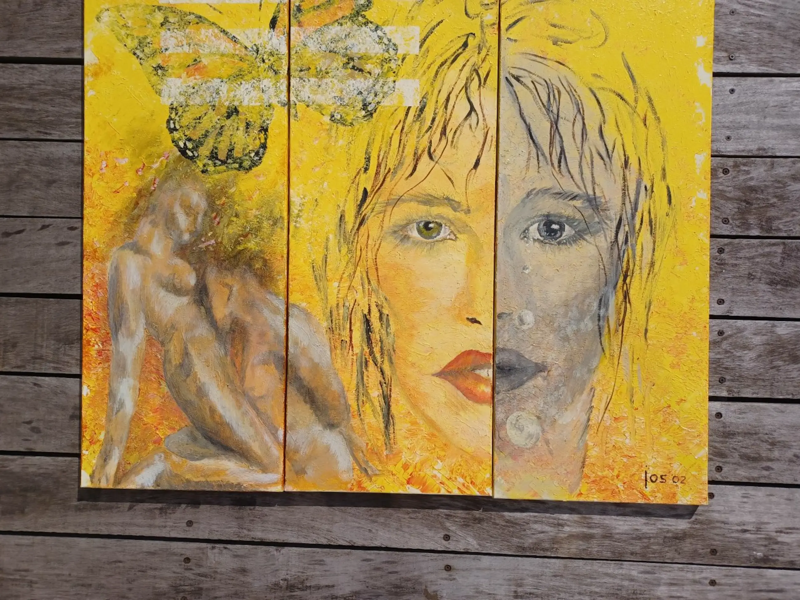 Groot kleurrijk 3 luik. Gesigneerd met "Jos 2002". 3 delen van 40 breed en een meter hoog. Zijkanten zijn mee geschilderd.