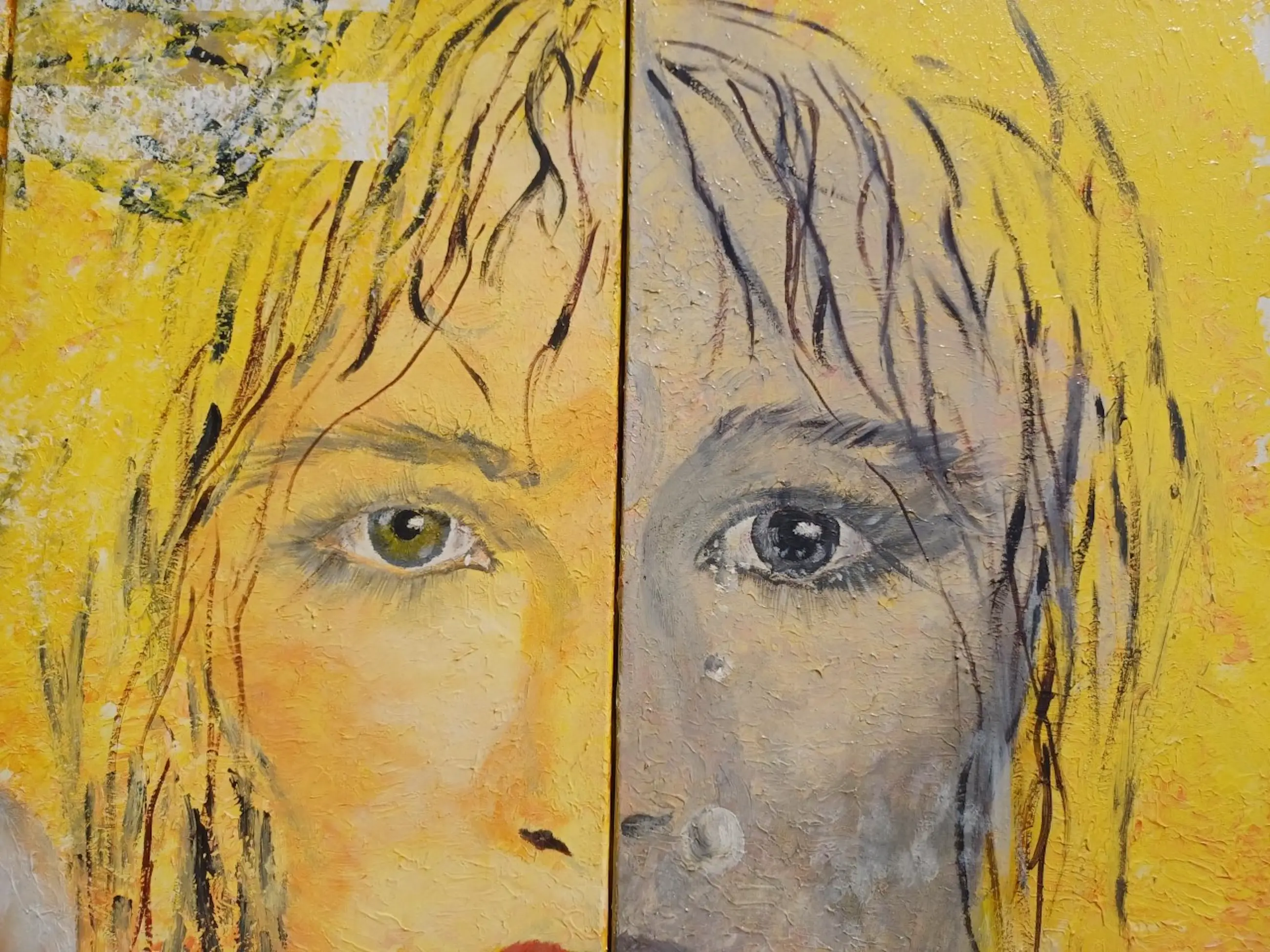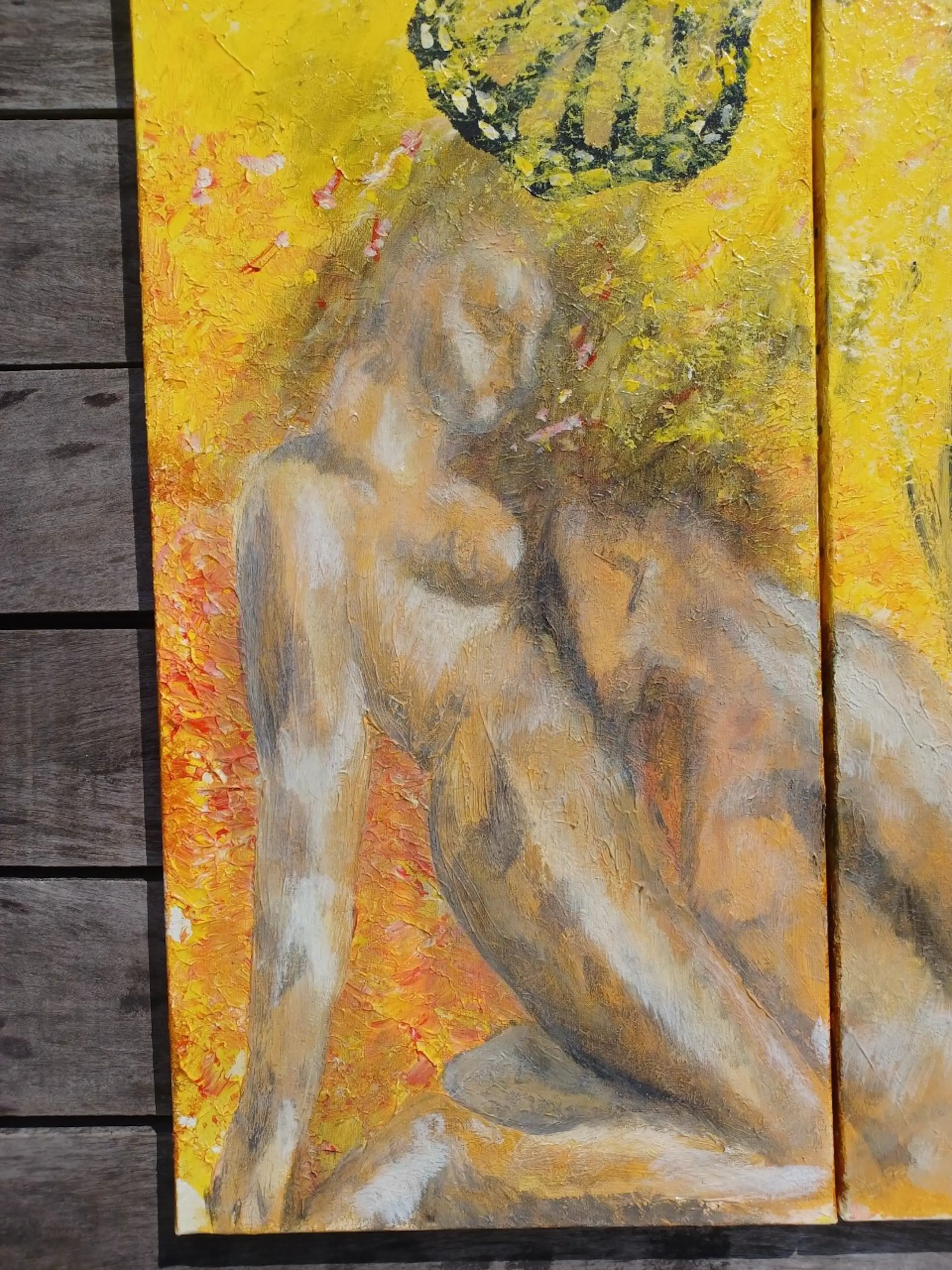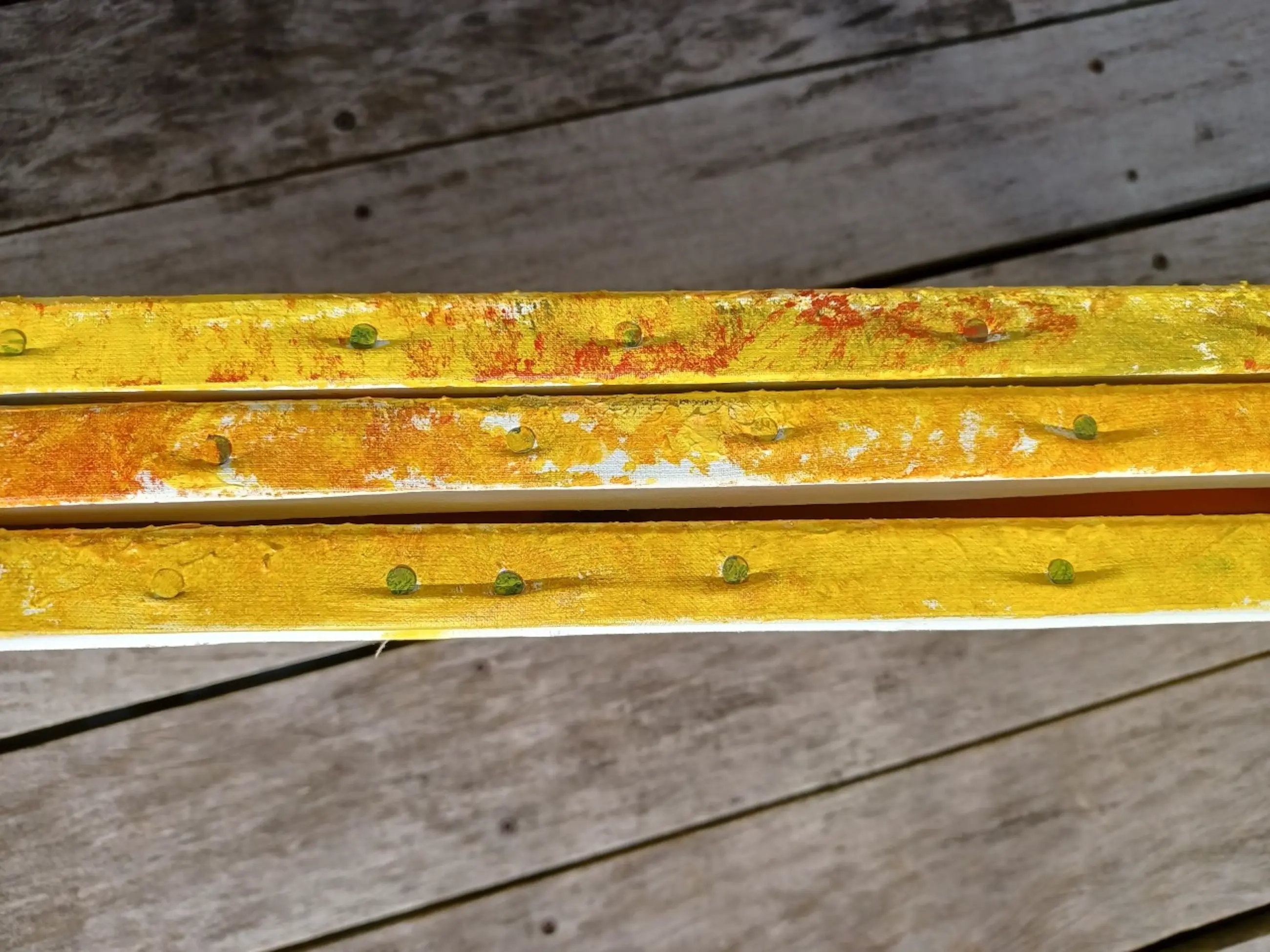 Groot kleurrijk 3 luik. Gesigneerd met "Jos 2002". 3 delen van 40 breed en een meter hoog. Zijkanten zijn mee geschilderd.
