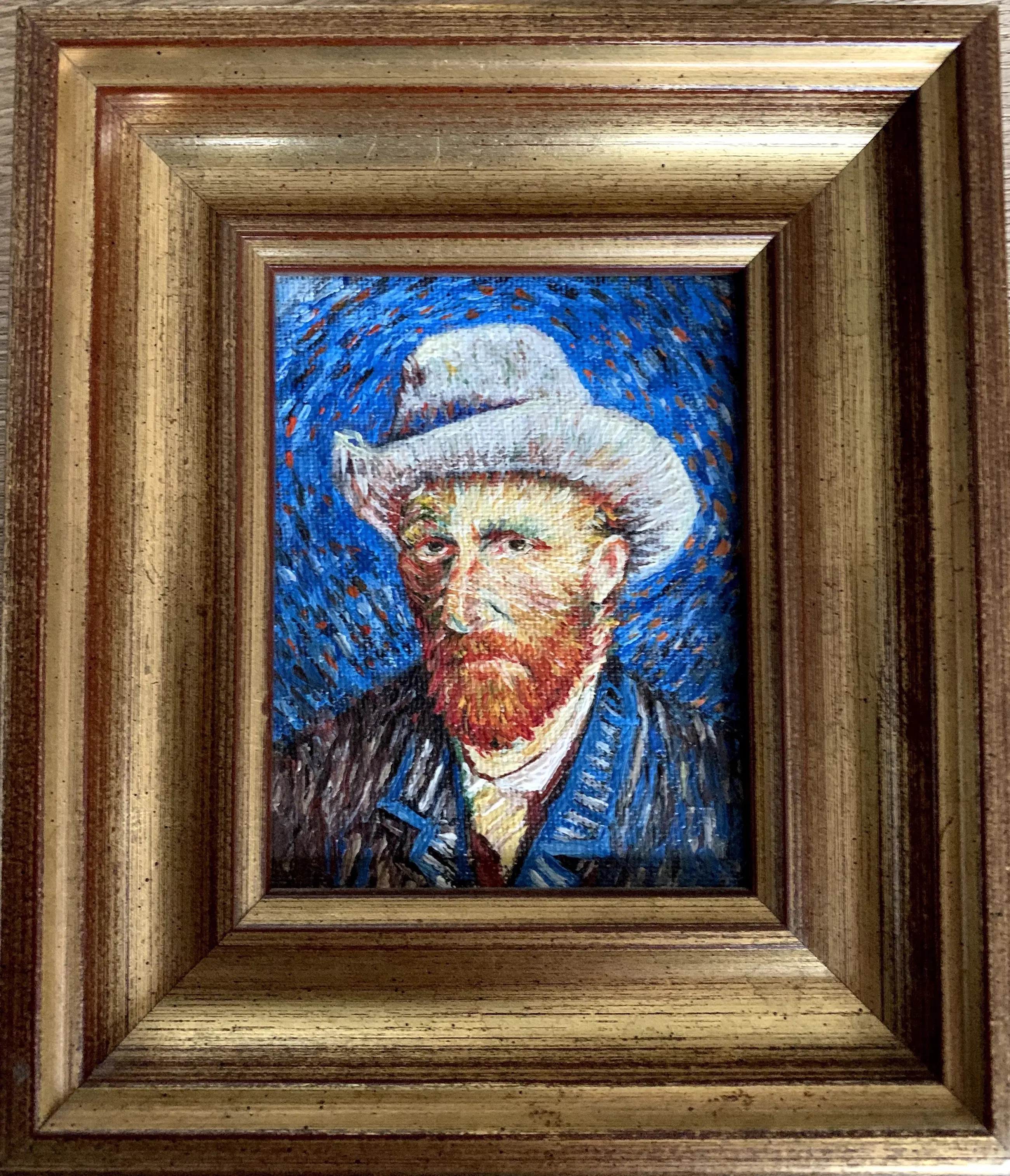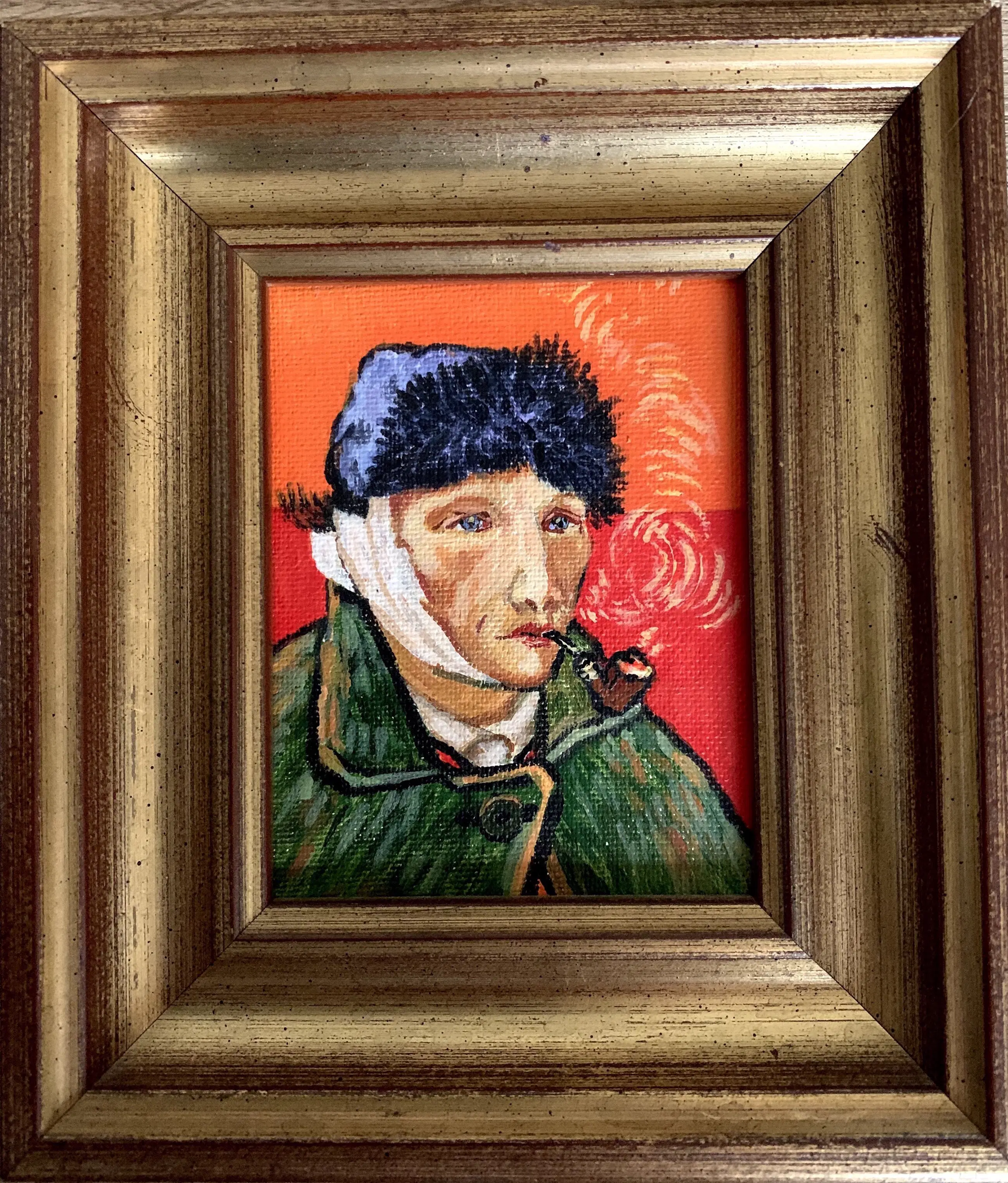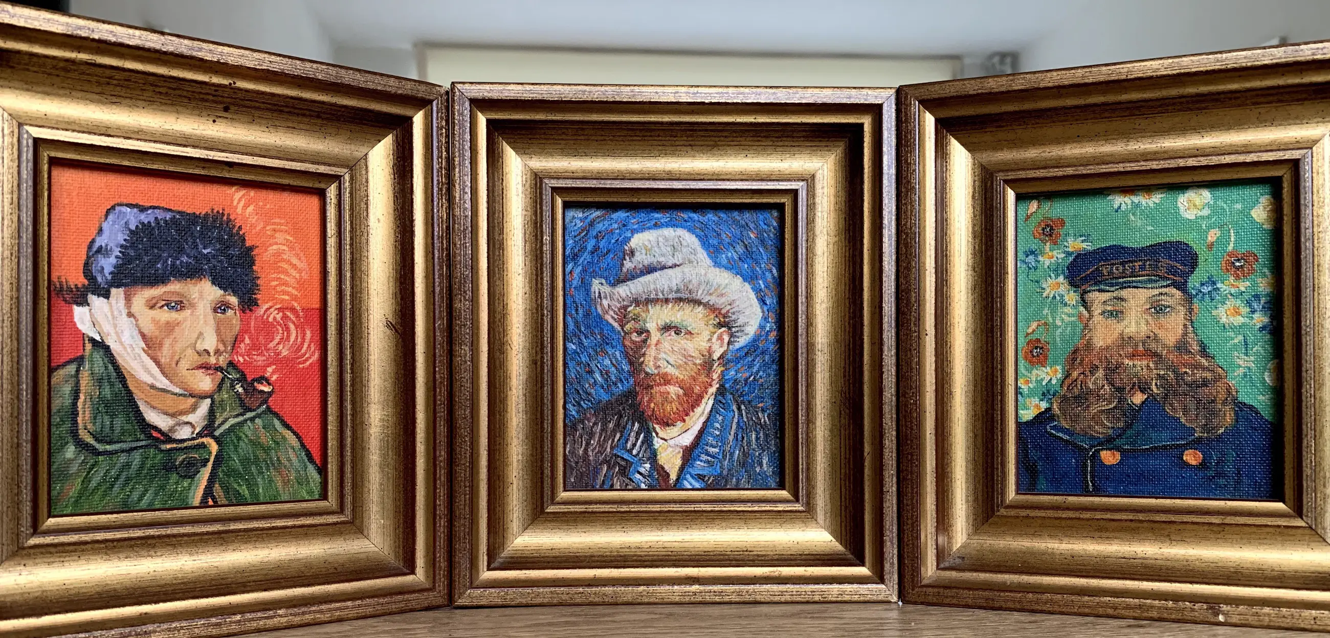 3 kleine olieverf op canvas schilderijtjes met portretten gemaakt naar Vincent Van Gogh schilderijen. Lijstjes zijn op sommige hoeken licht beschadigd. De werken zijn in de jaren 80 gemaakt en komen uit een familie collectie van schilderijen.