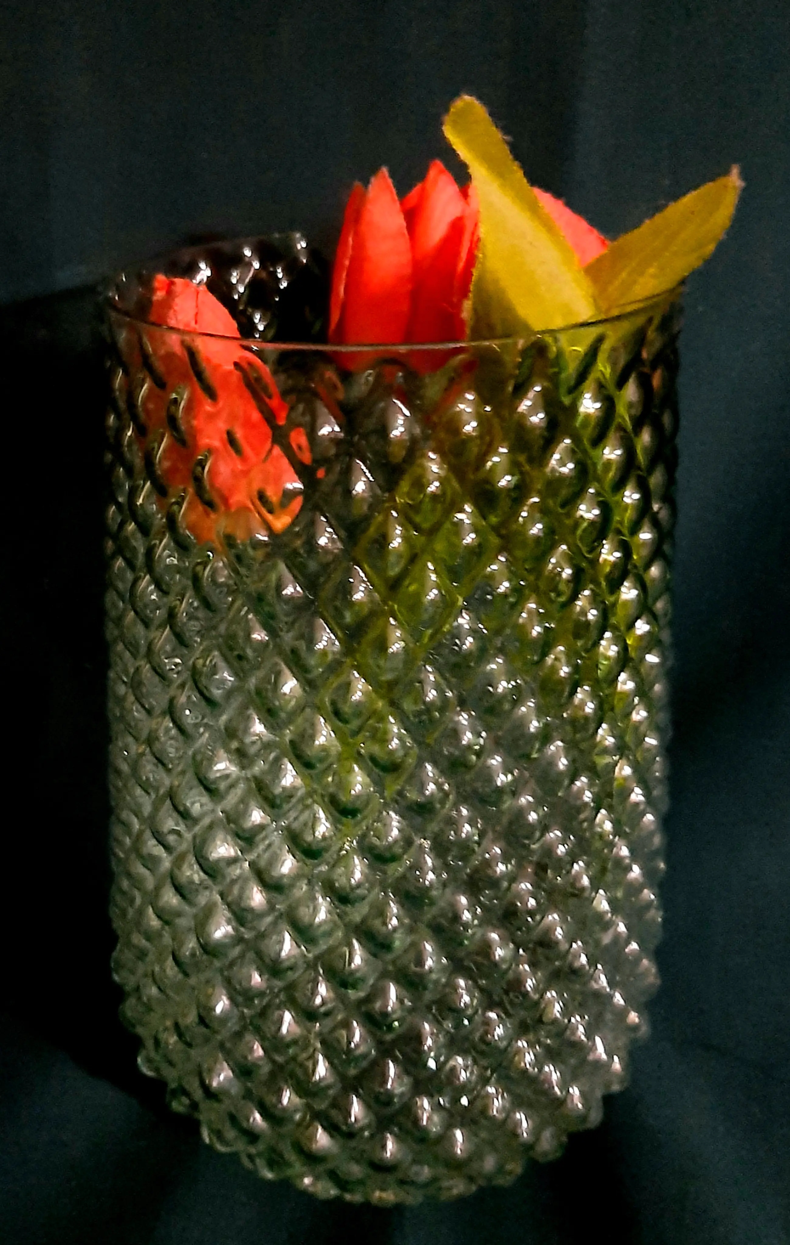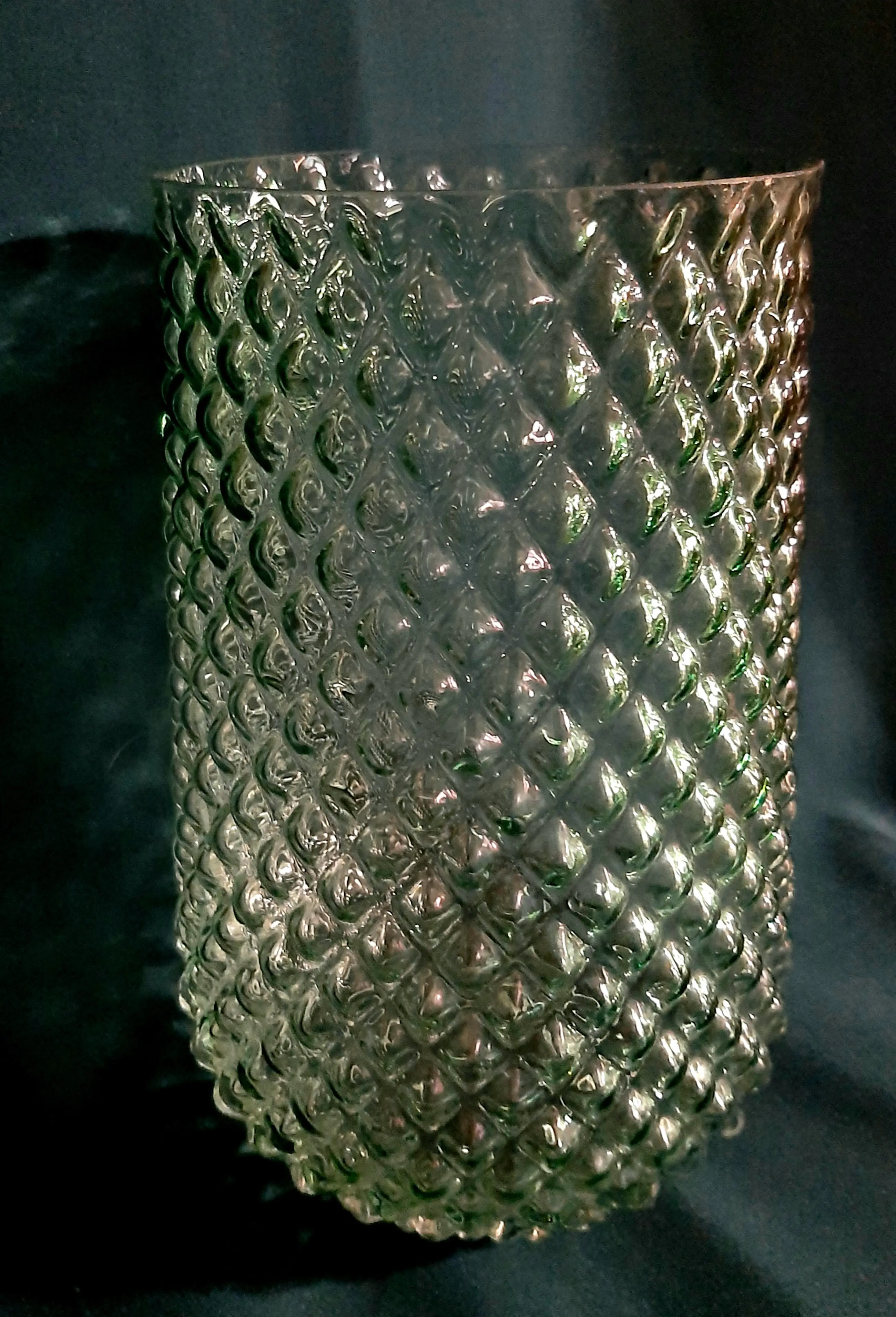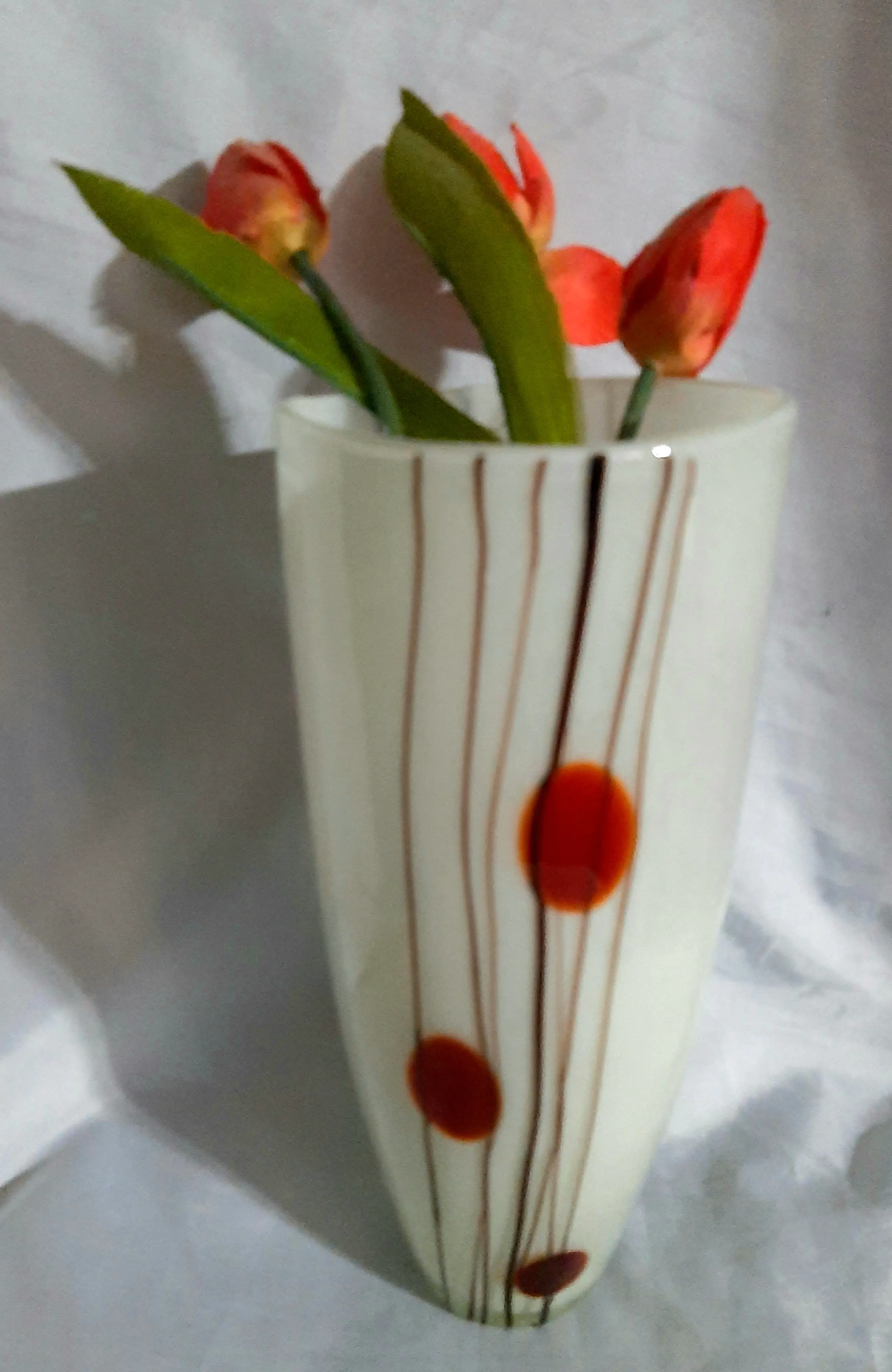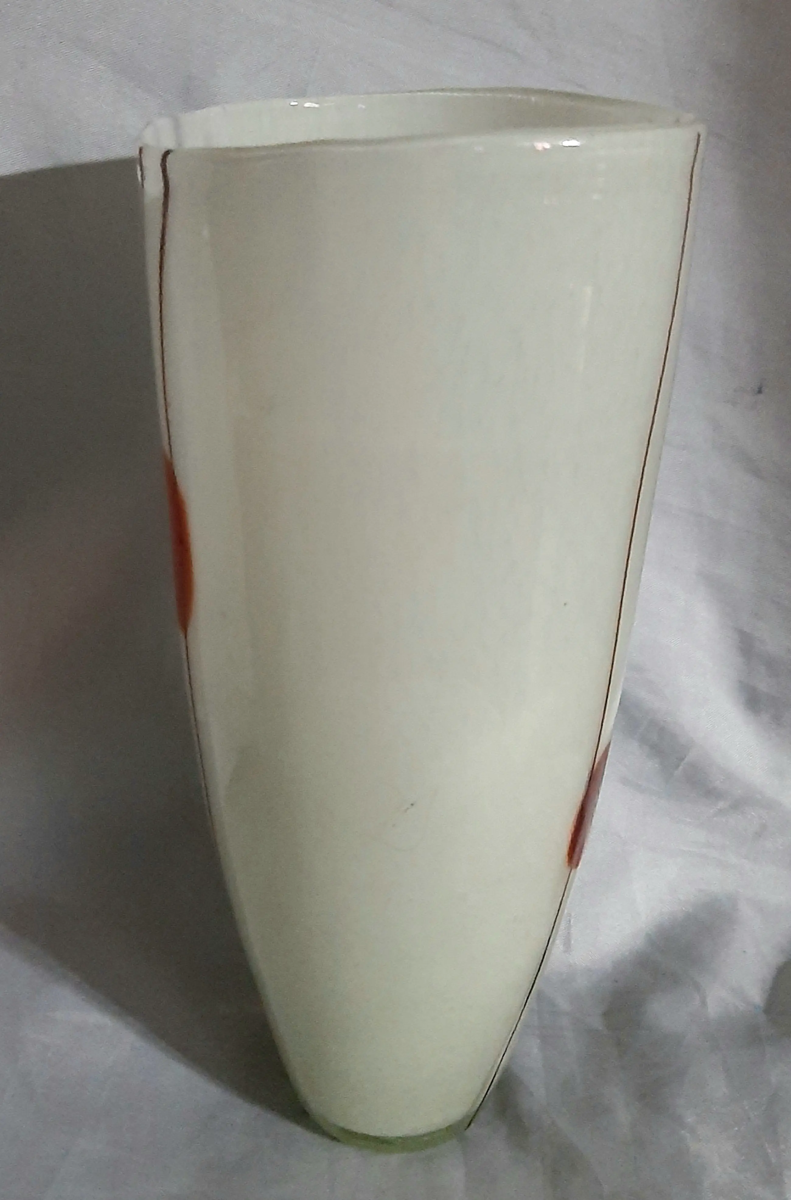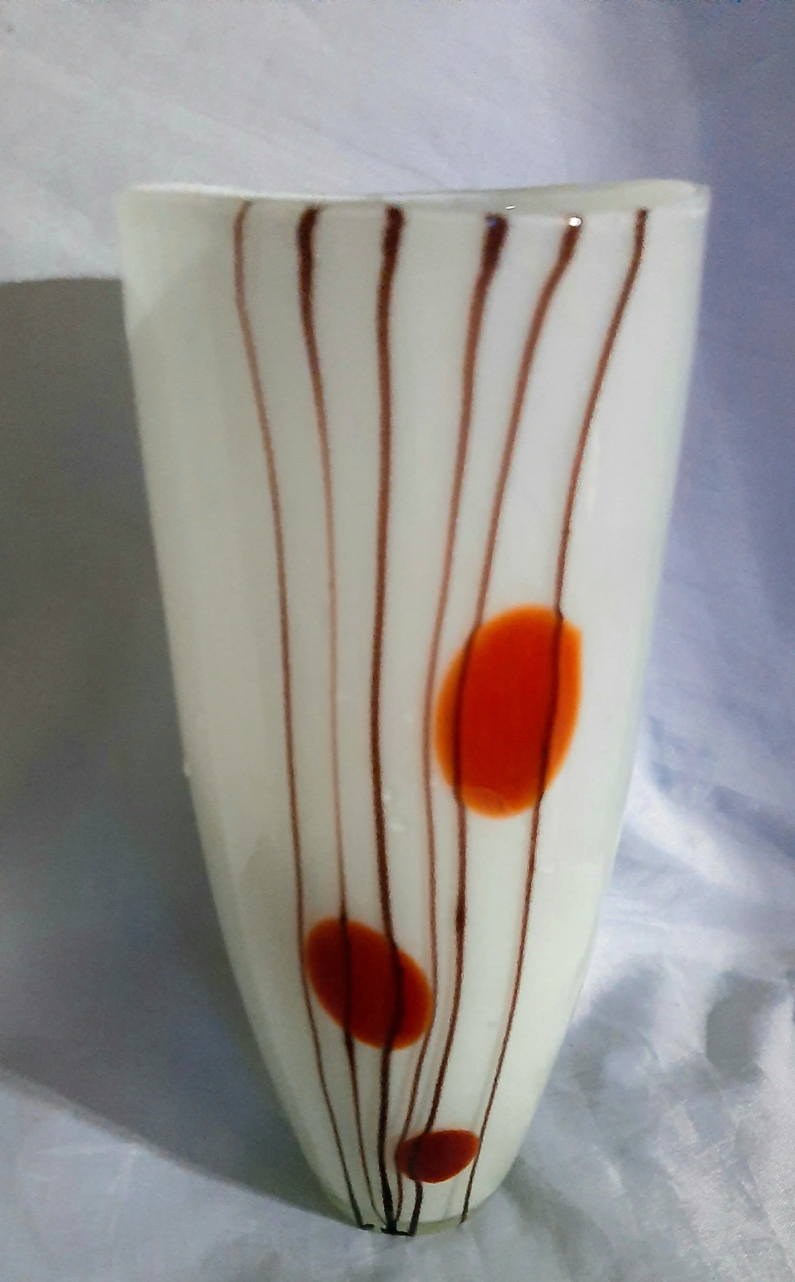 Een oude unieke decoratieve vasen uit Duitse Democratische Republiek. Erg mooie glas kleuren. Jaren 70. 1.Witte vaas met decoratie 26 cm hoog, Diameter bovenkant 11 cm 2.Groene vaas met bolvormig ruitvormig decor 22 cm hoog , Diameter boven 12 cm 3.Gele vaas voor één bloem met bol decor 26 cm hoog, Diameter boven 2 cm, beneden 22 cm