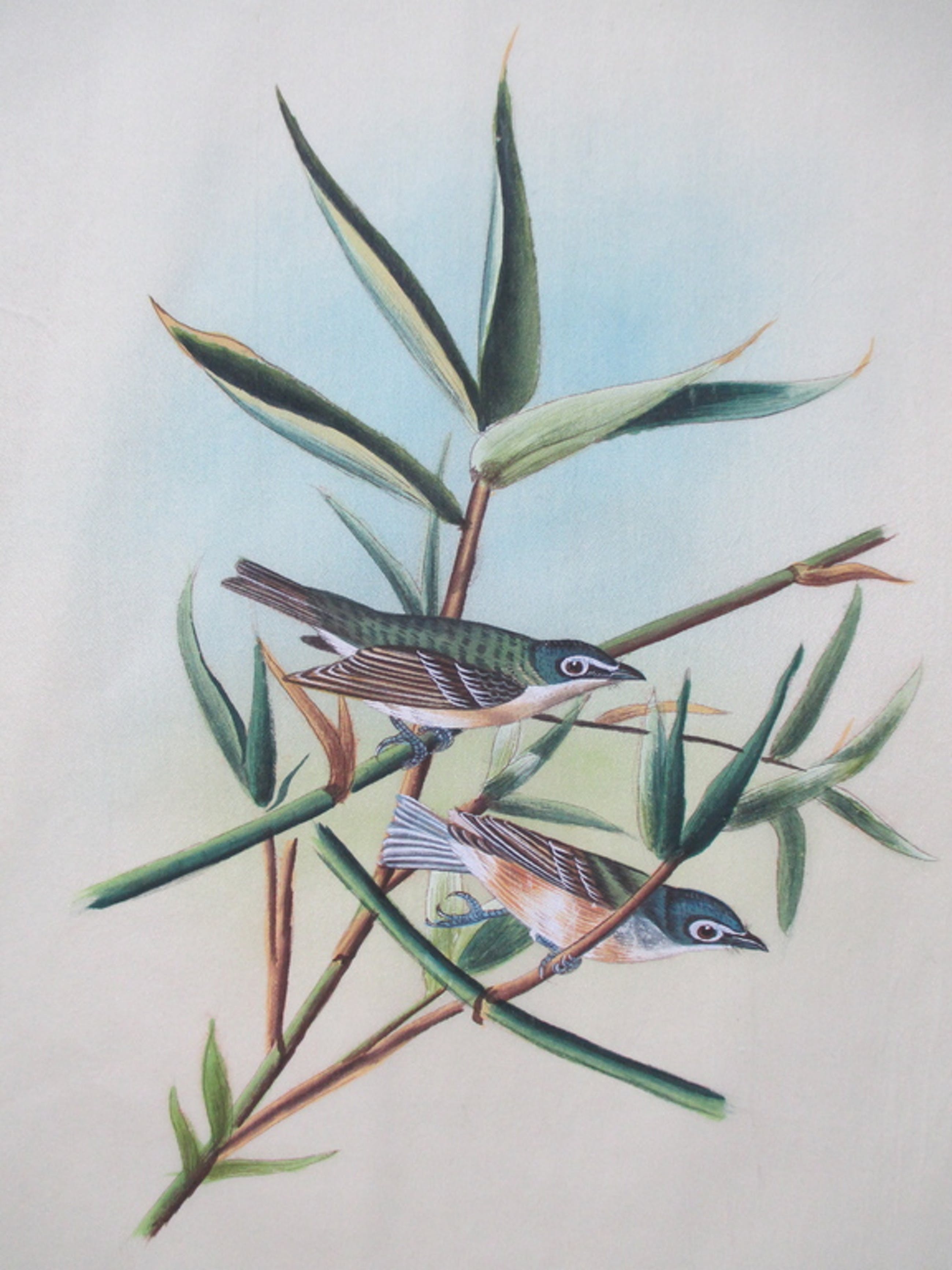 4 handbeschilderde dunne zijden doeken met voorstellingen van vogels; afmetingen doek ca 35x27. Kunstenaar onbekend.