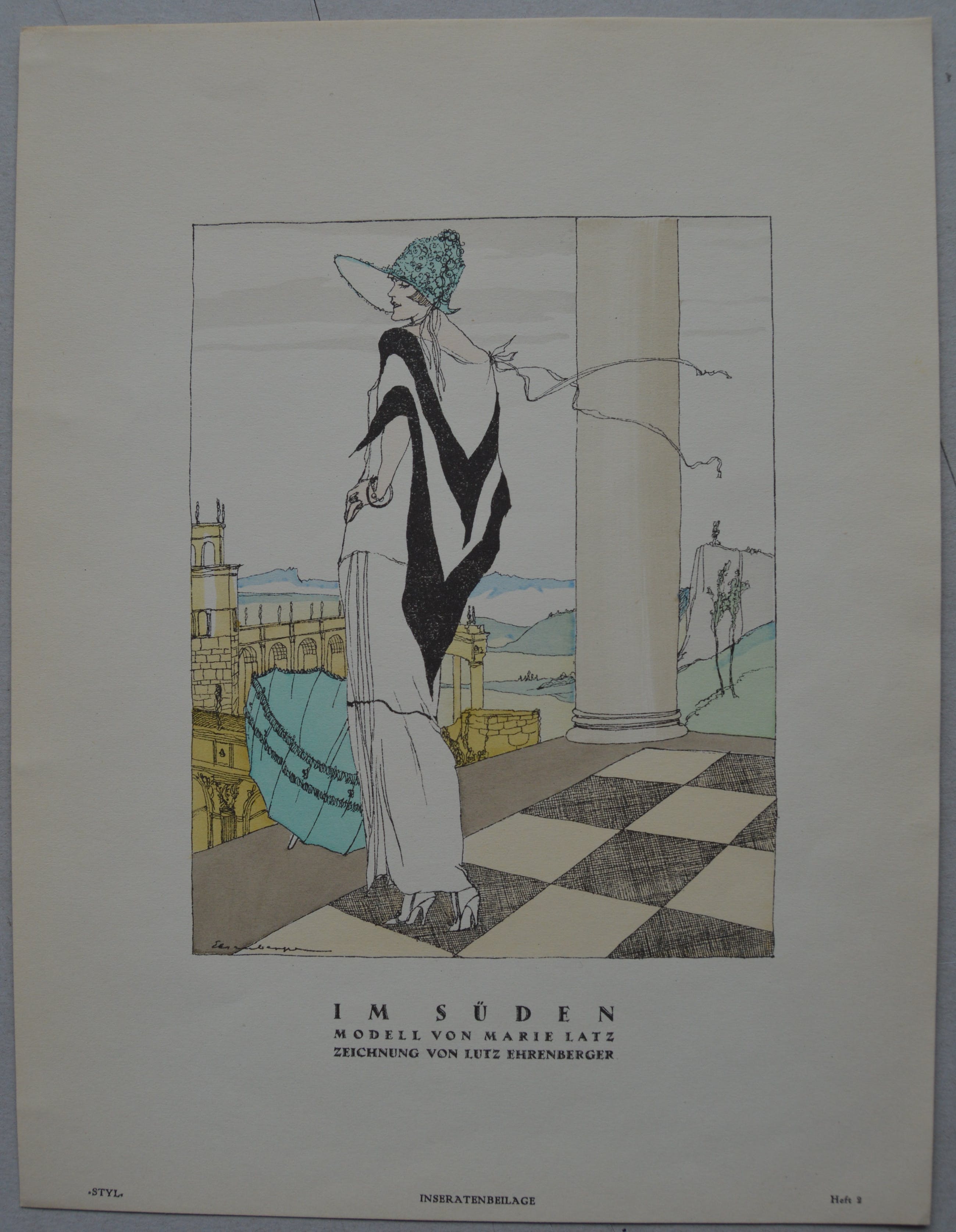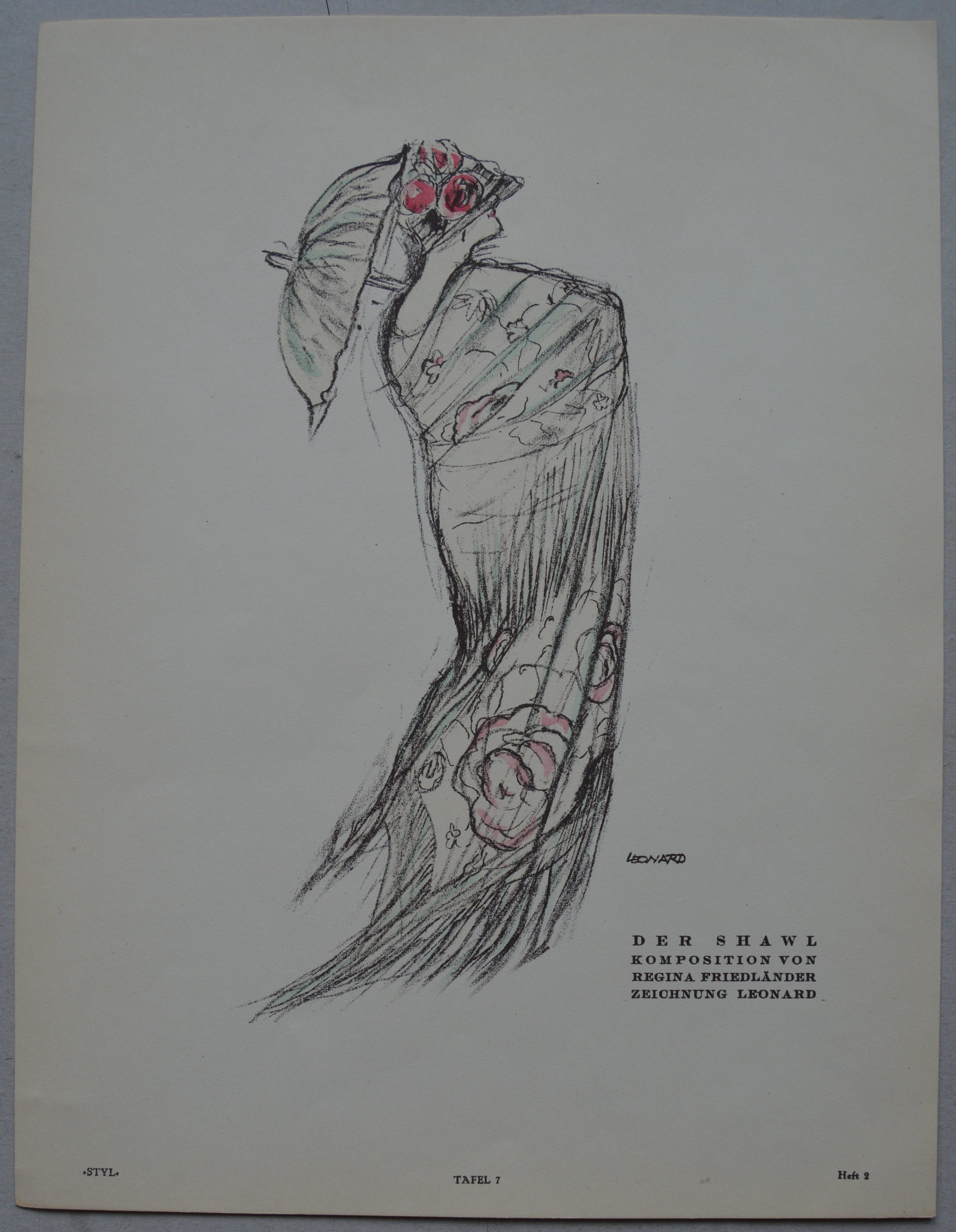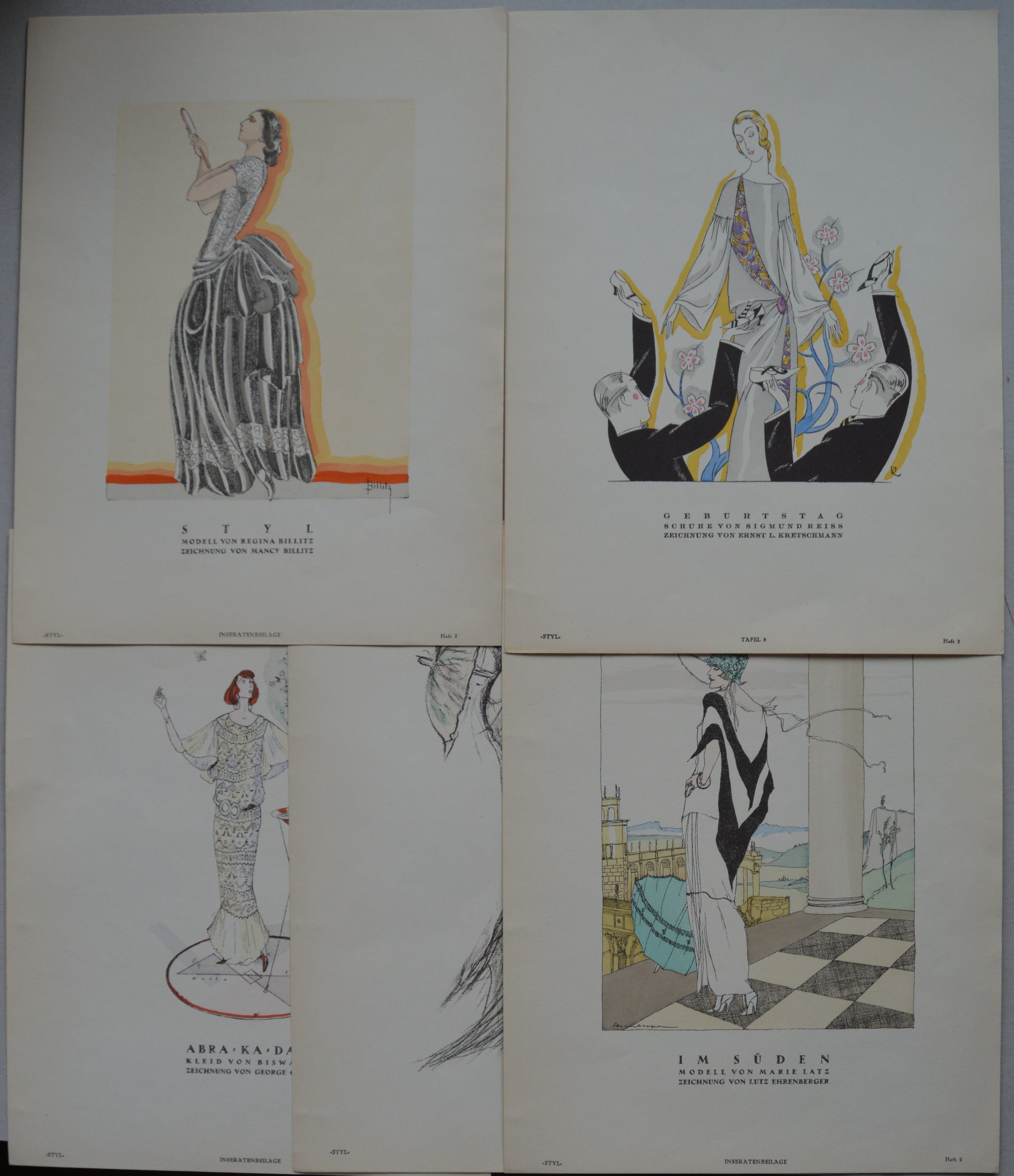 Pochoirs; Geburtstag; tekening van Ernst L. Kretschmann. Modell Regina Billitz, tekening Mancy Billitz. Abra-ka-dabra, tekening Georg G. Kobbe. Im Suden, tekening Lutz Ehrenberger. Der shawl, tekening Leonard. Alle in de druk gesigneerd. Verzending aangetekend.