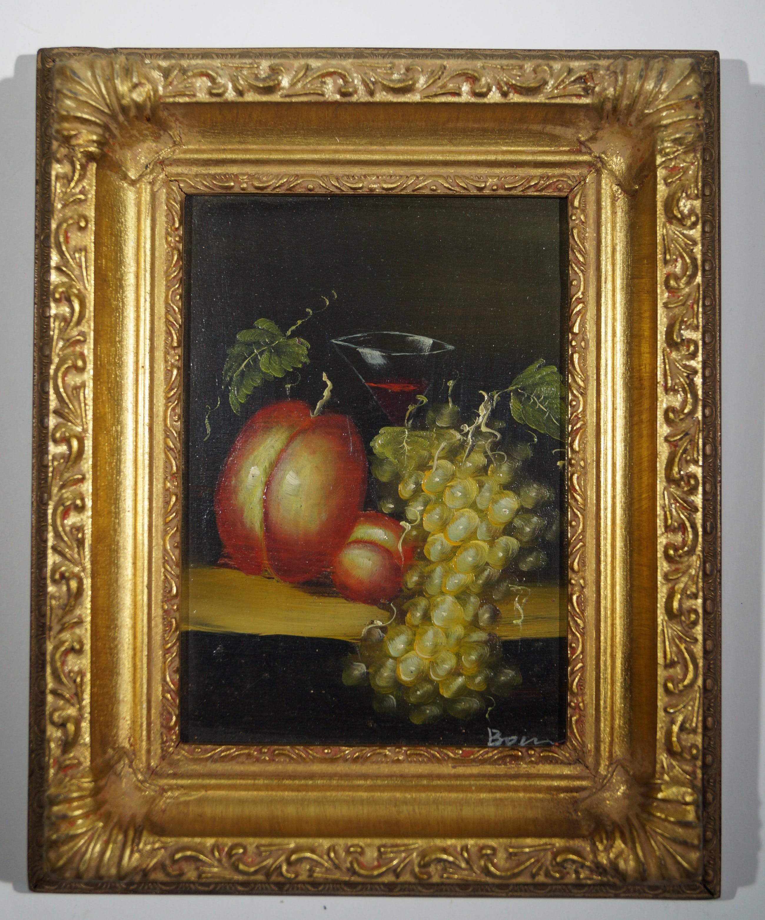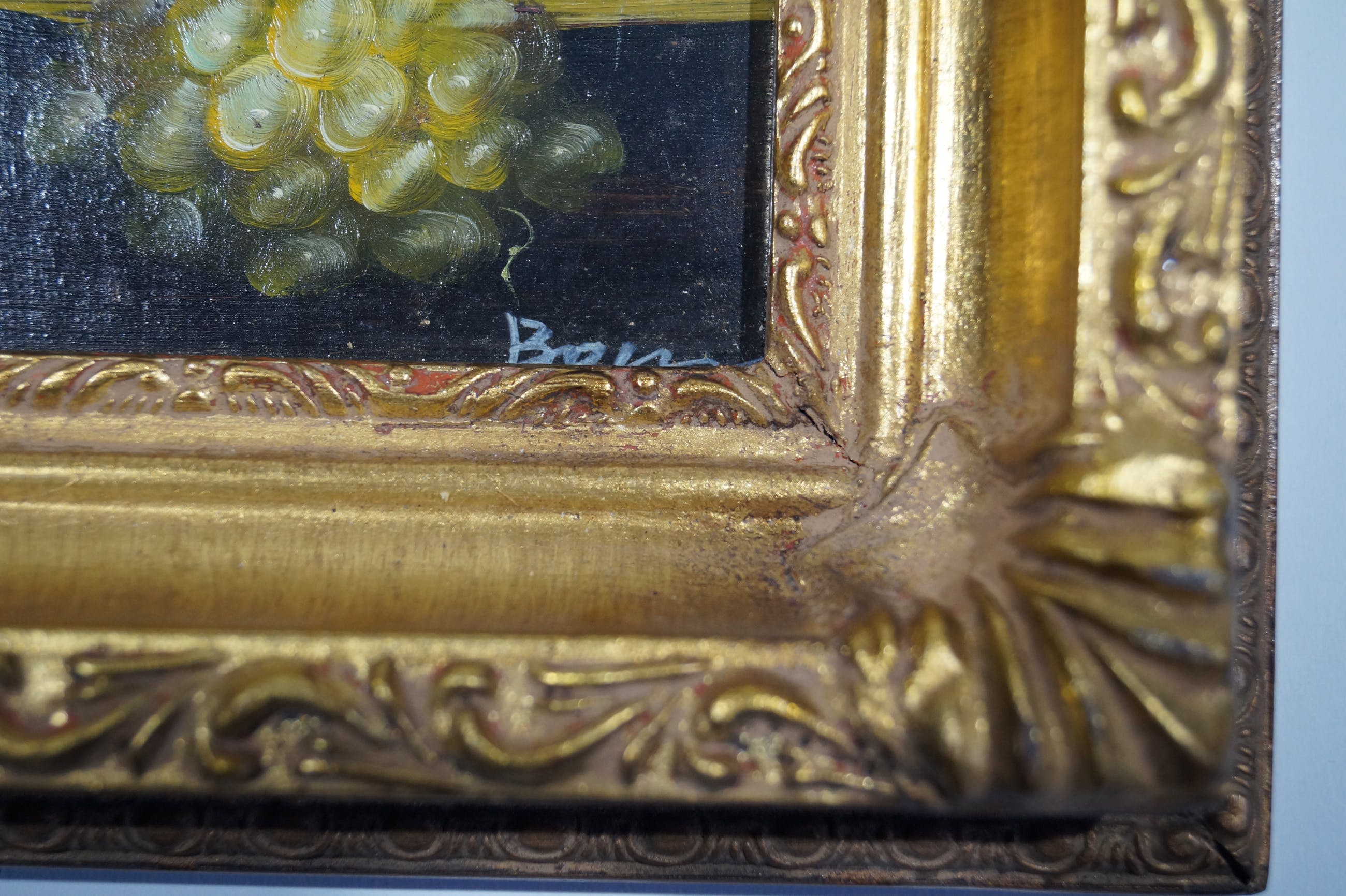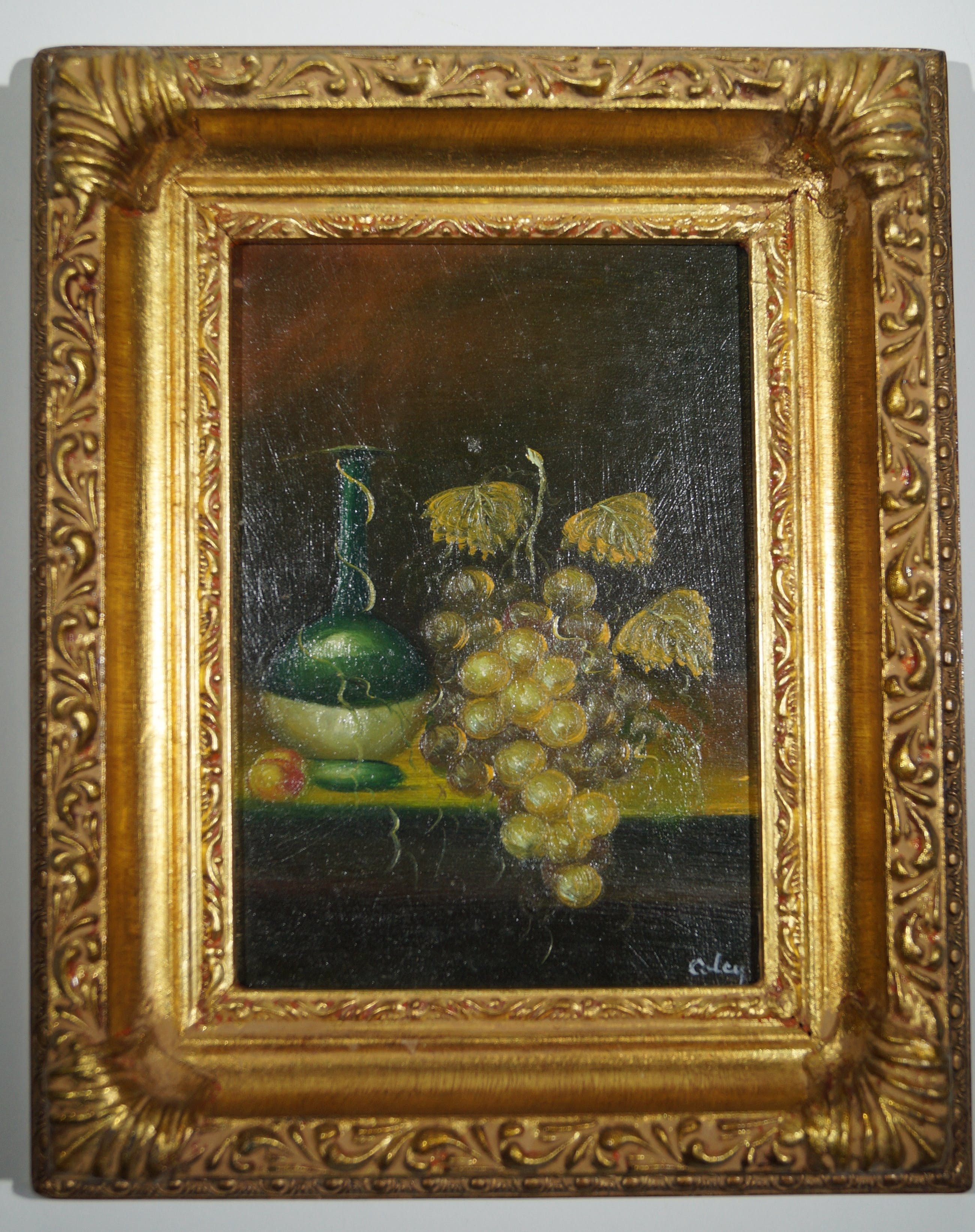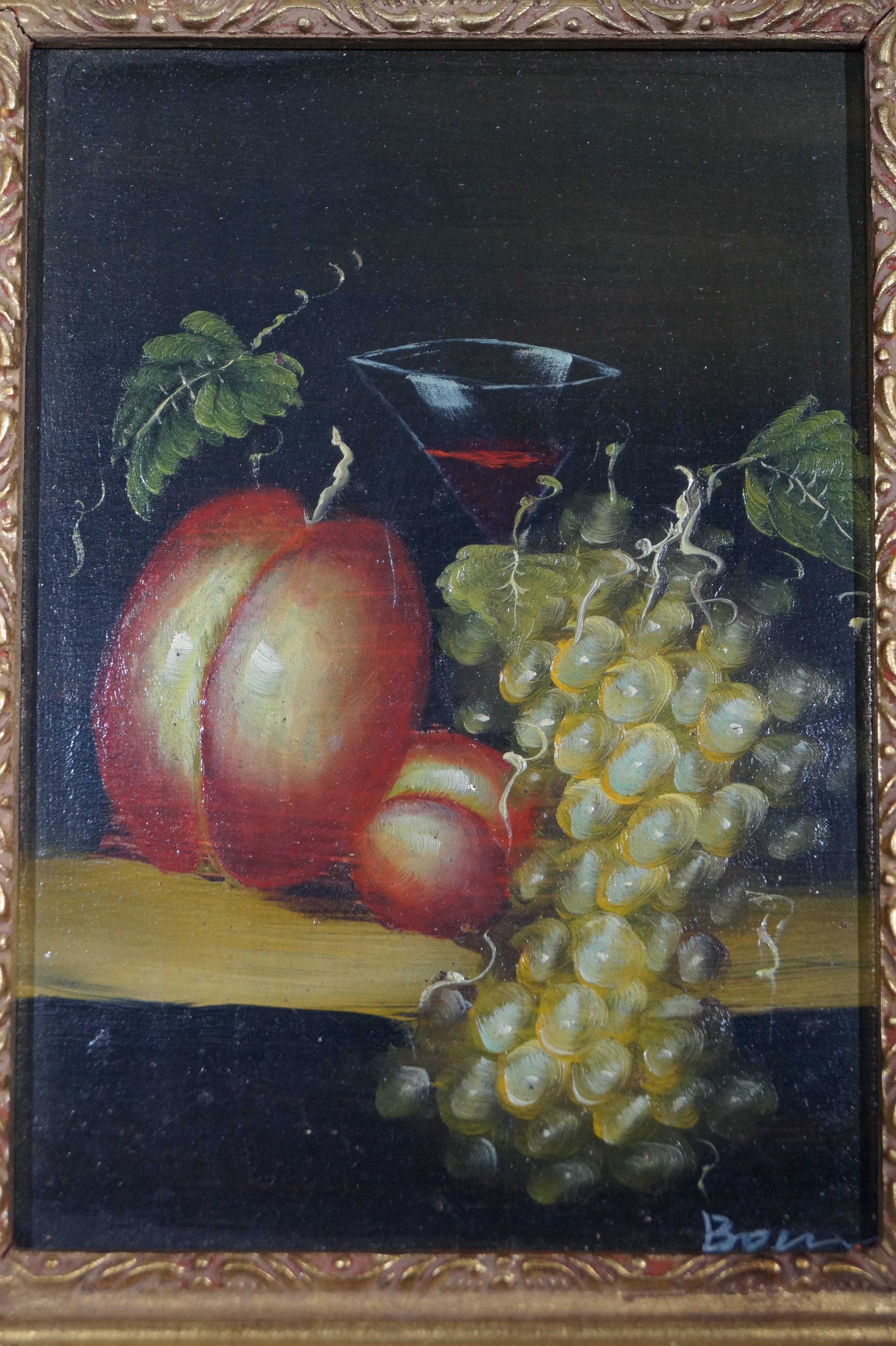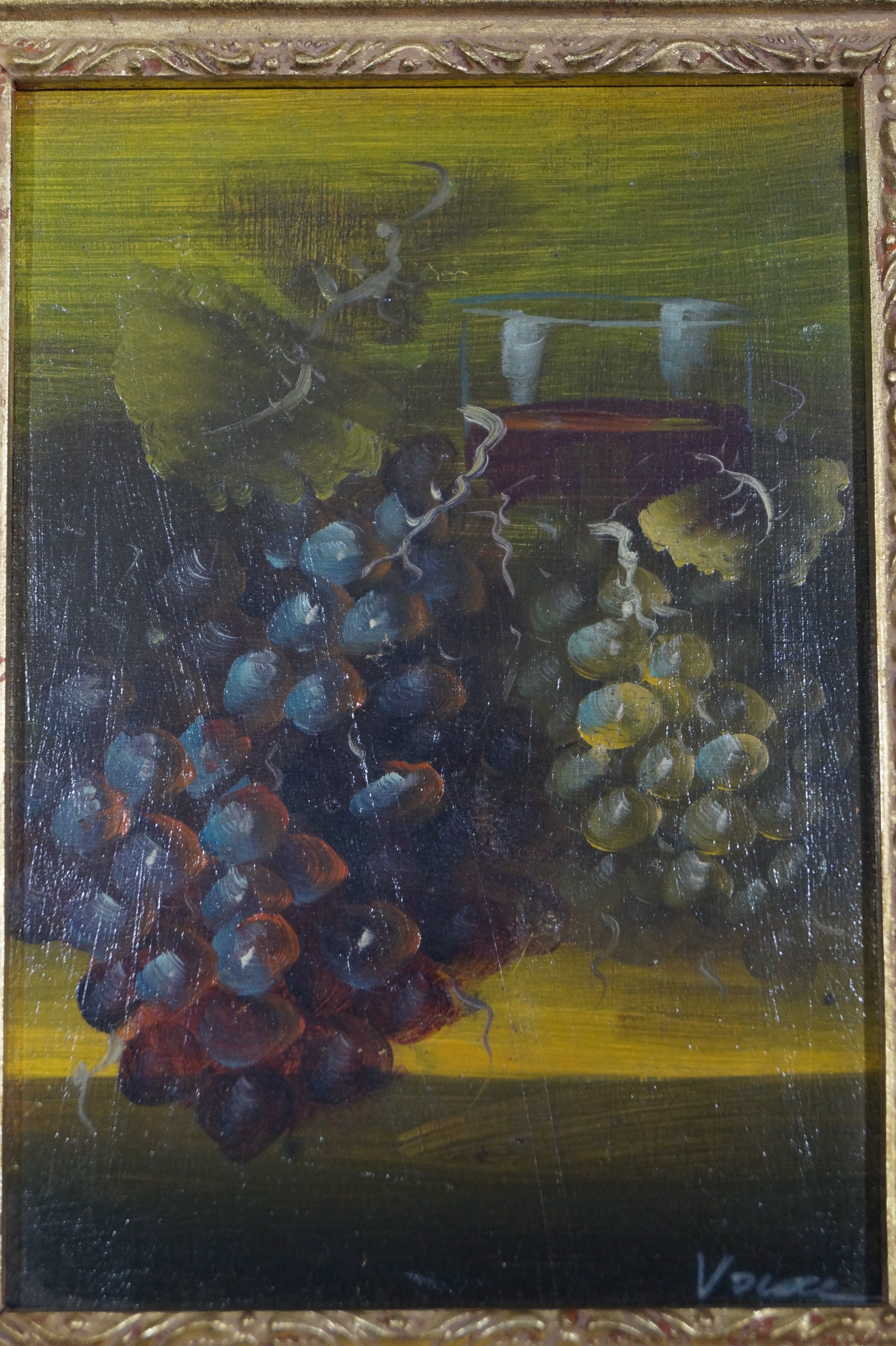 Leuke serie van vijf kleine schilderijtjes met druiventrossen en een uiltje. De houten paneeltjes zijn 13 x 18 cm Ze zijn alle op dezelfde manier mooi ingelijst. De signaturen zijn niet te ontcijferen en verschillend maar het is kennelijk gemaakt in de stijl van één atelier.