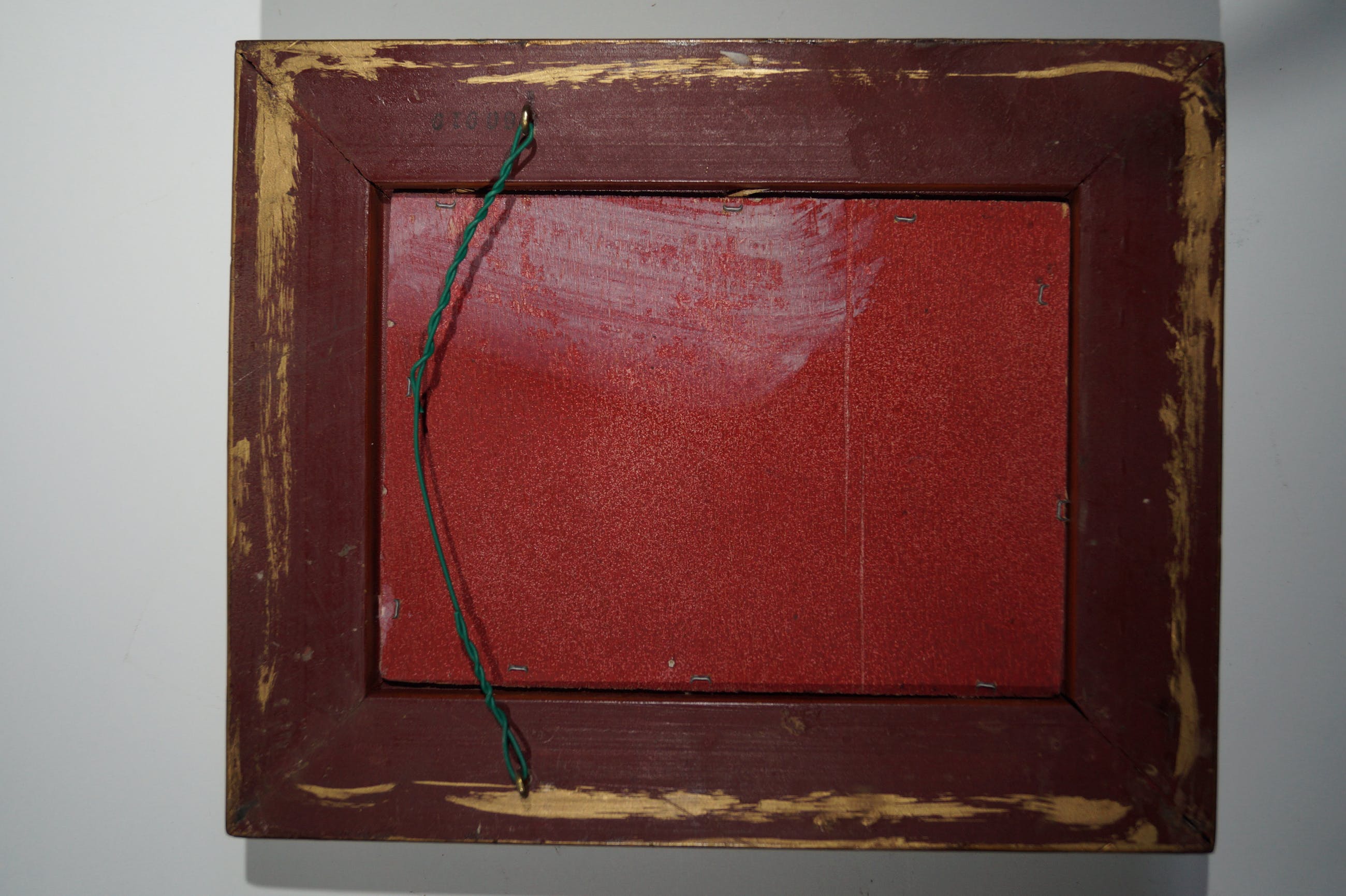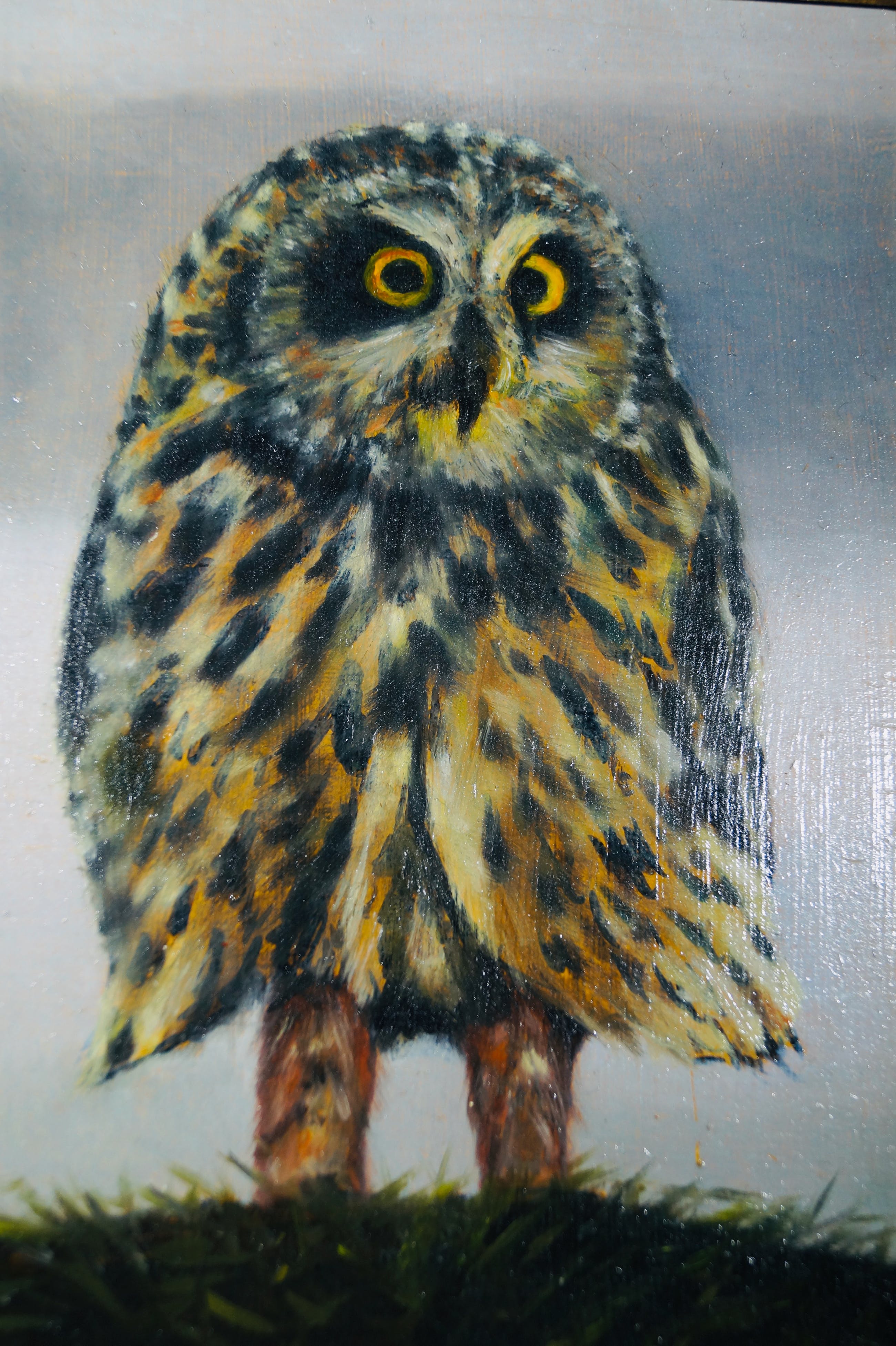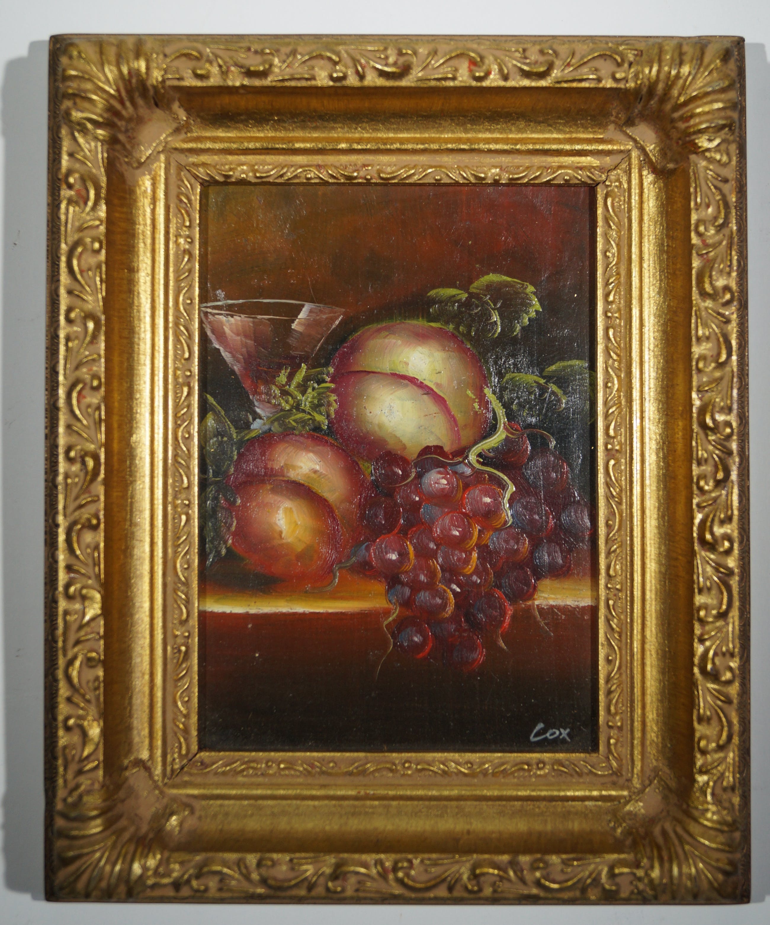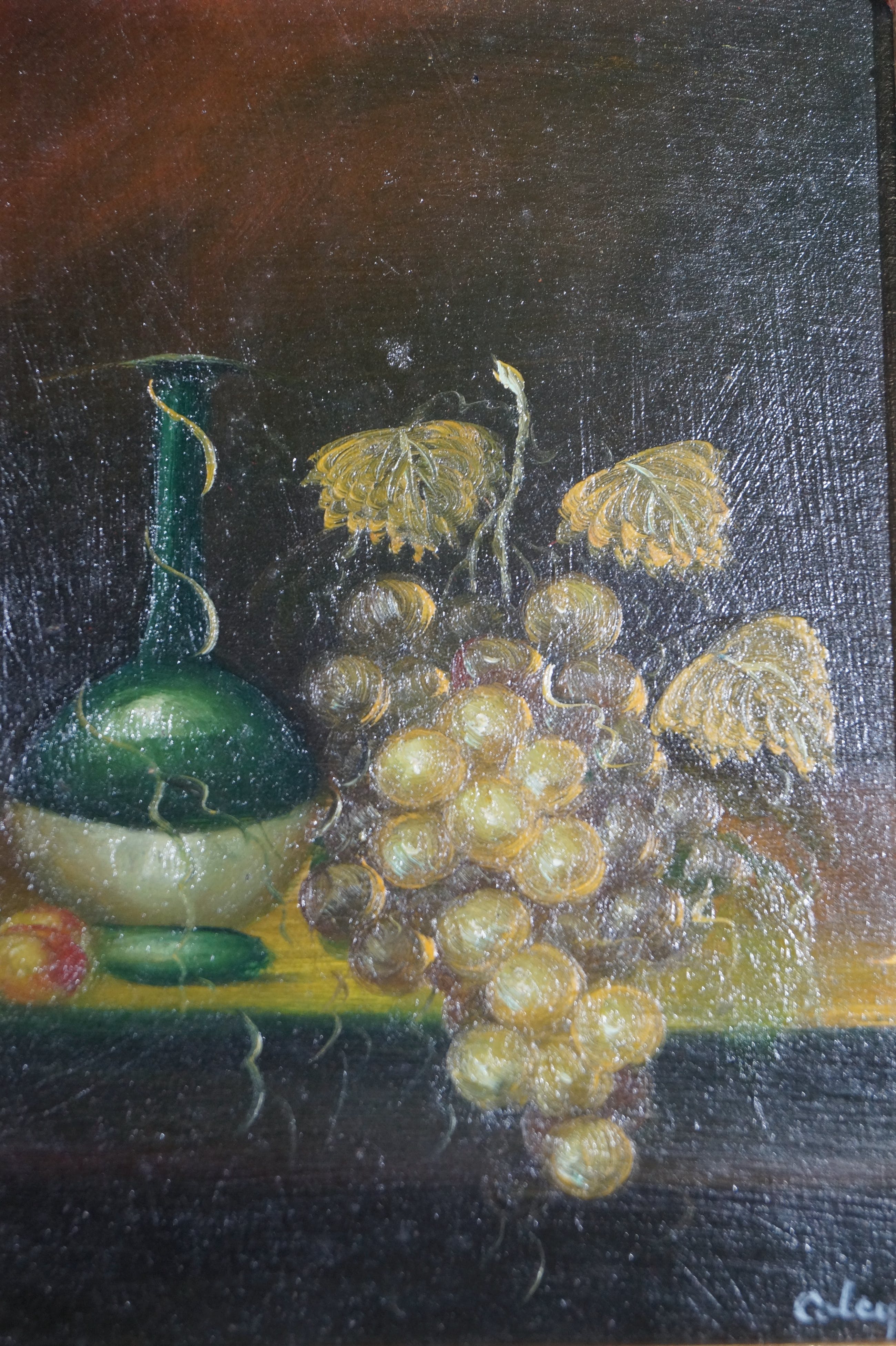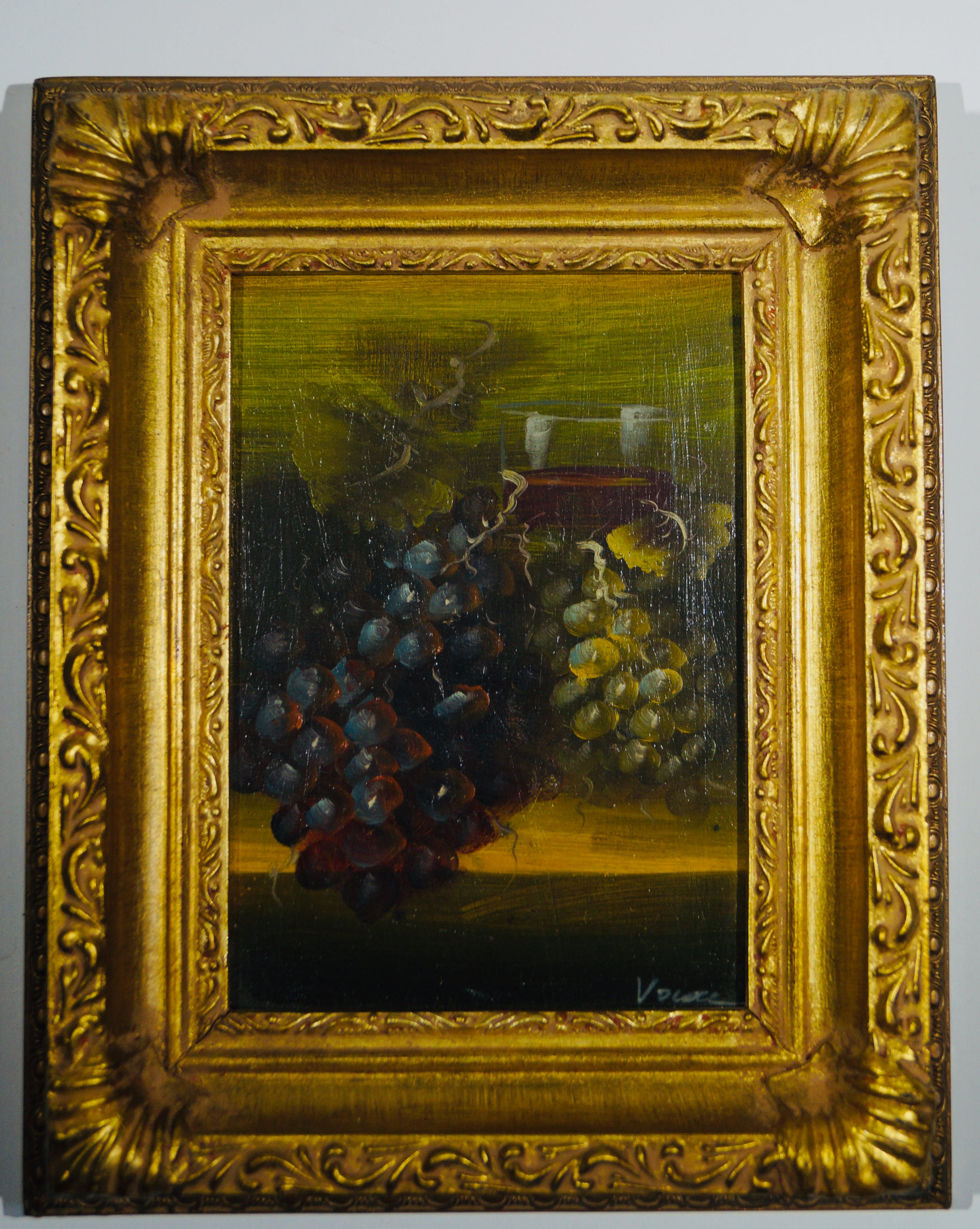 Leuke serie van vijf kleine schilderijtjes met druiventrossen en een uiltje. De houten paneeltjes zijn 13 x 18 cm Ze zijn alle op dezelfde manier mooi ingelijst. De signaturen zijn niet te ontcijferen en verschillend maar het is kennelijk gemaakt in de stijl van één atelier.