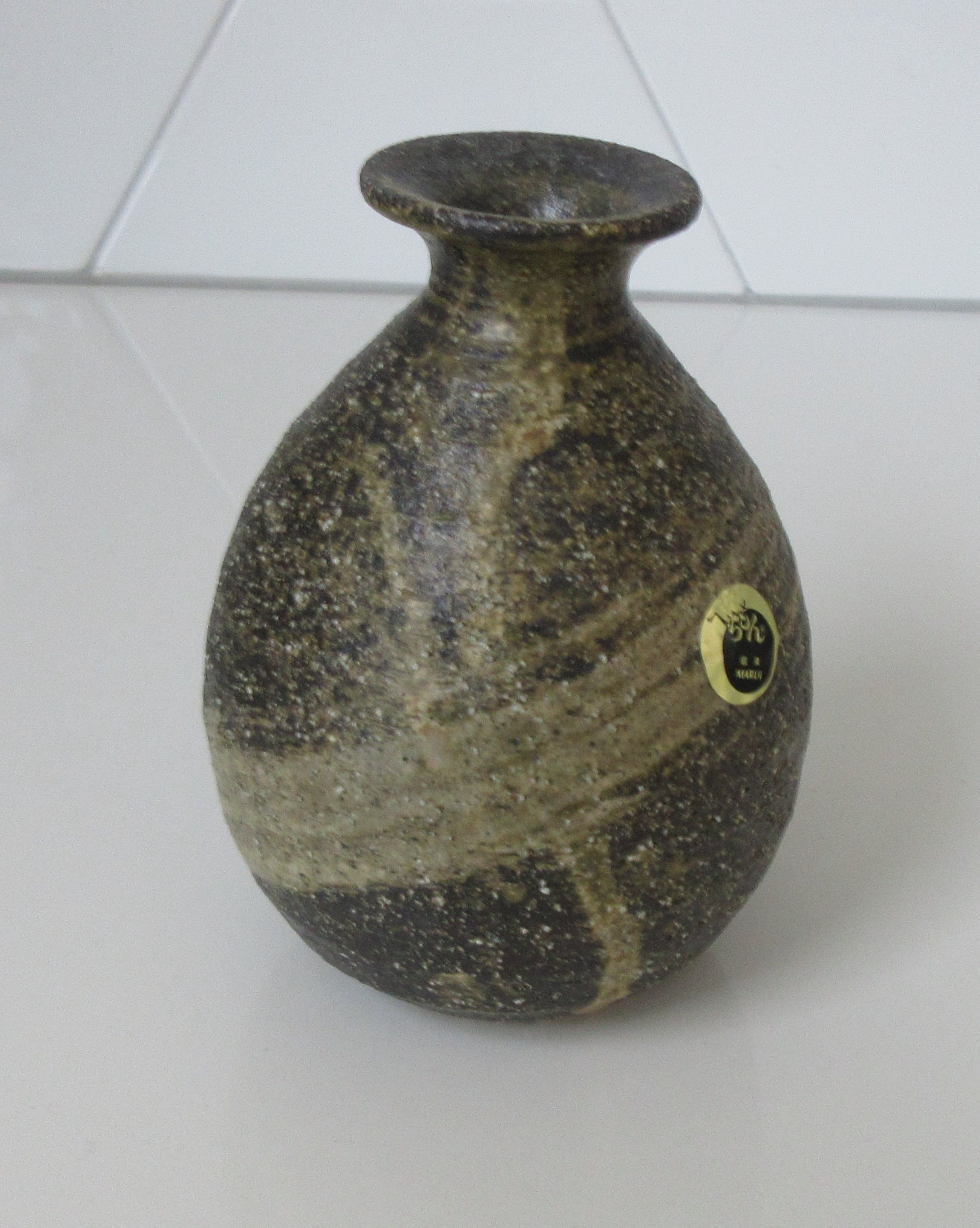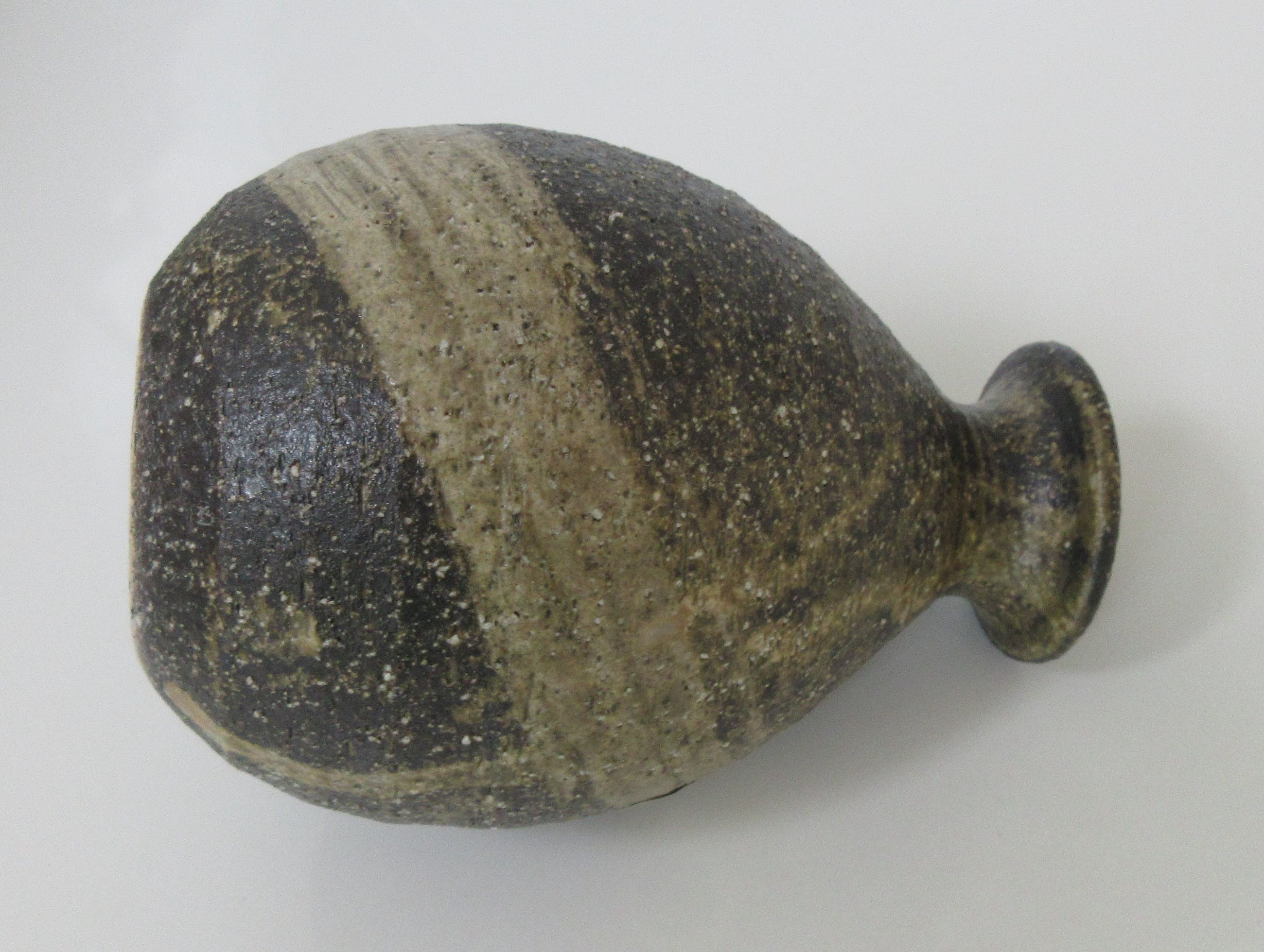 aardewerk vaasje met ruw bruine en zandkleurig glazuur. Onbeschadigde conditie,