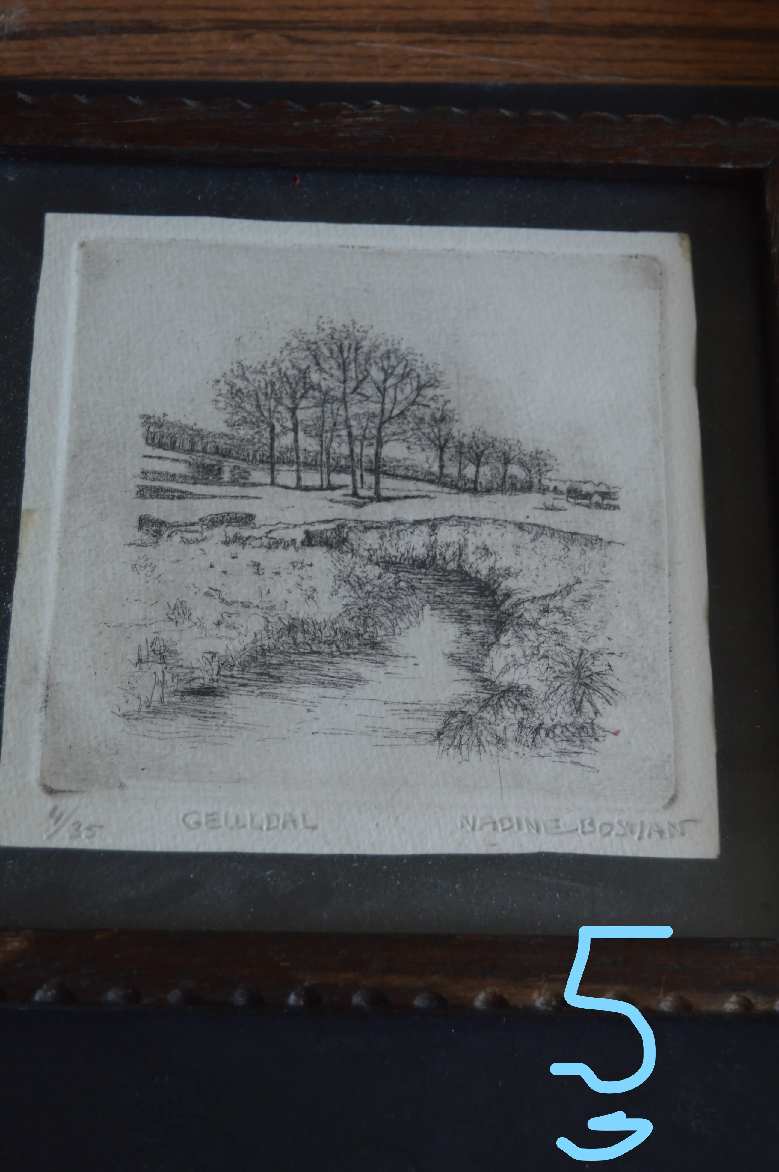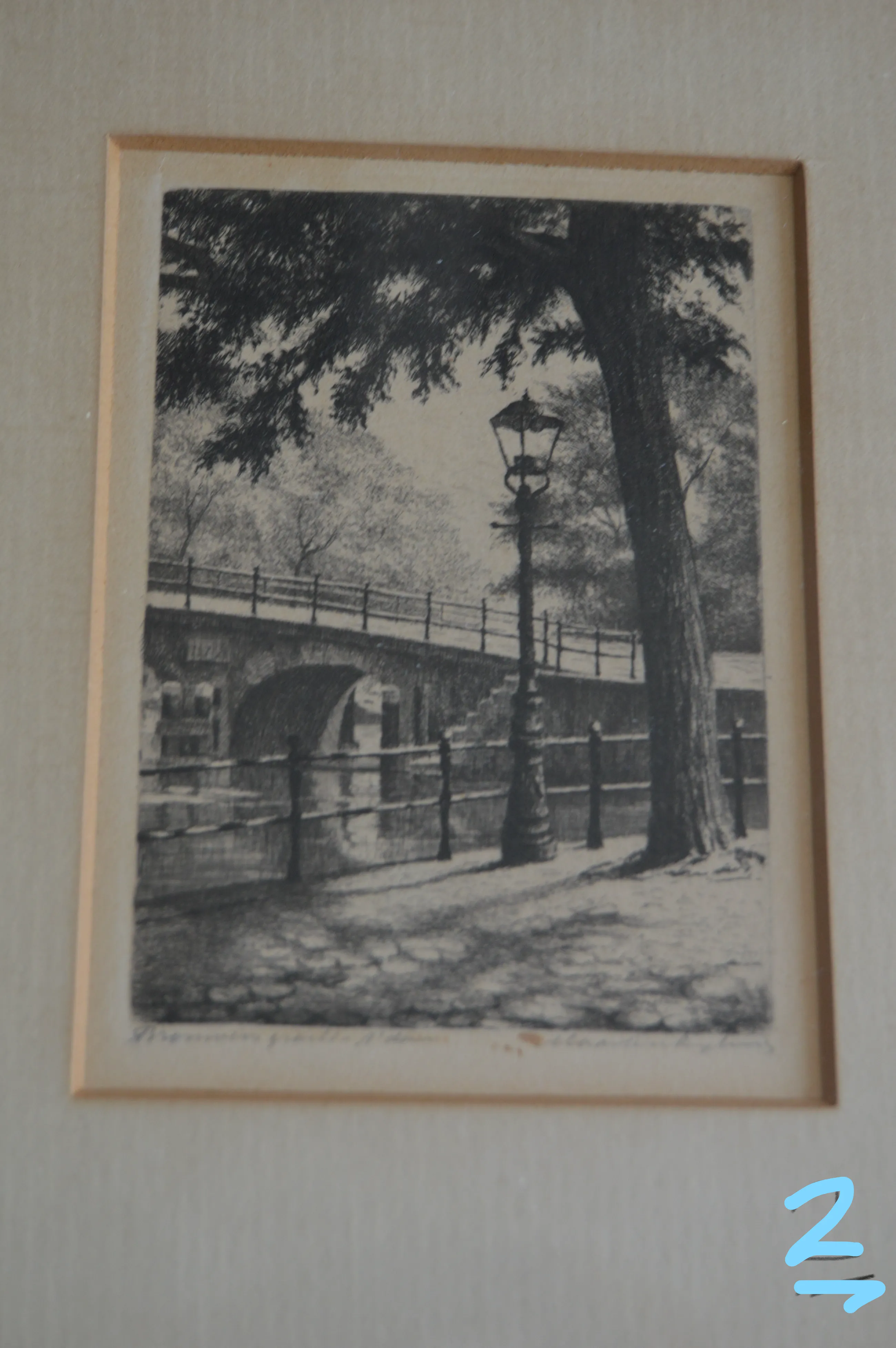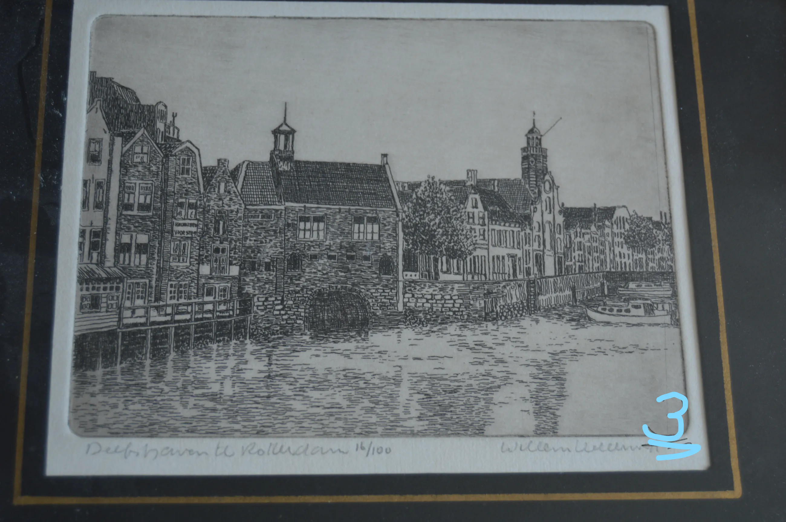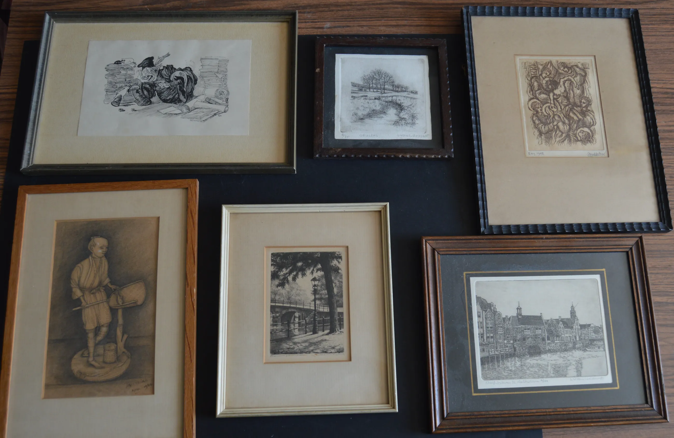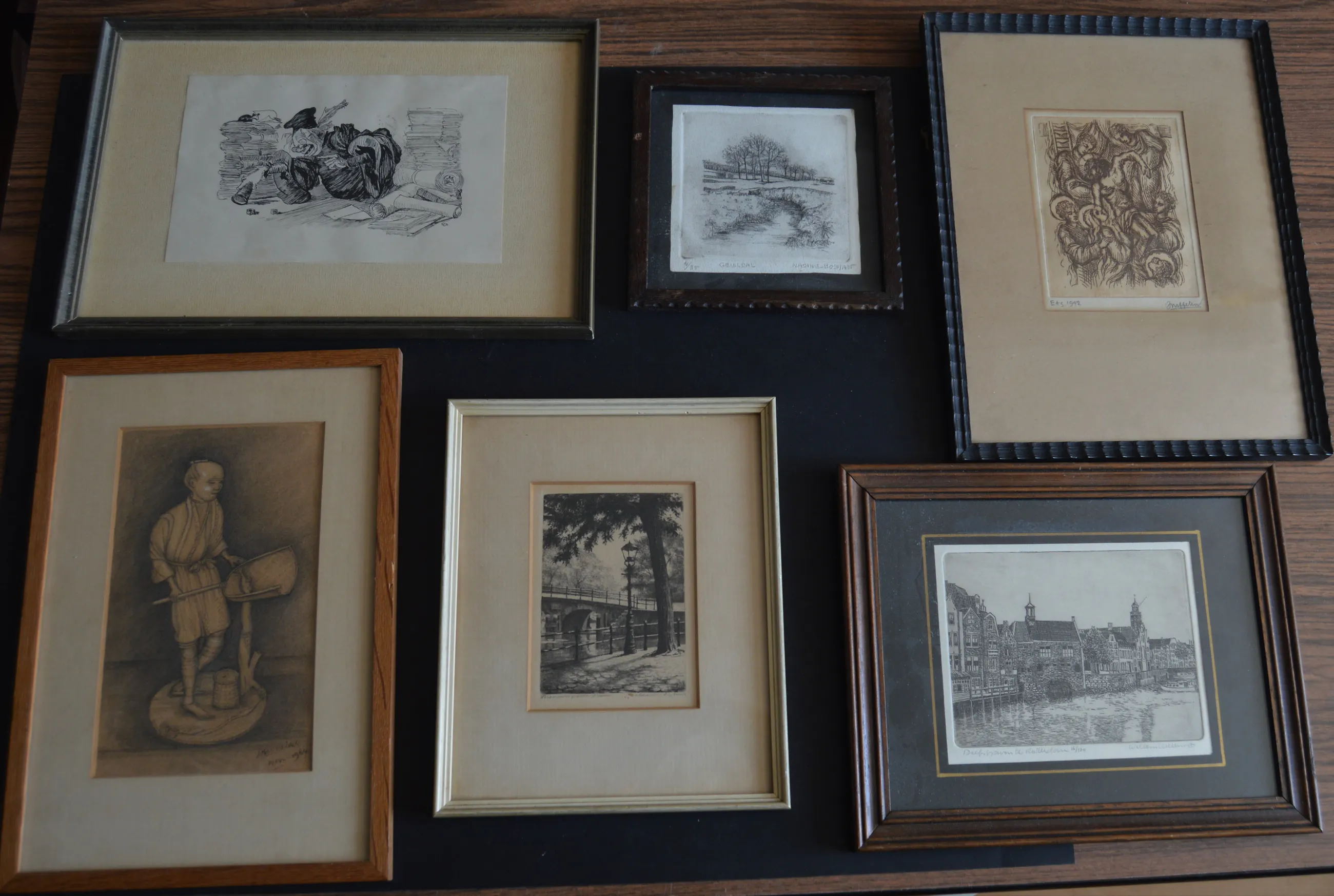 6 prachtige etsen, alle ingelijst. Zijn ook allemaal gesigneerd door de kunstenaar. Zie de foto's voor een prima indruk. Staat van het geheel is ondanks ouderdom prima. Alle zijn ook achter glas! Ophalen is de beste optie. Nummer 1; visser. 19 x 11 cm. Ingelijst; 30 x 20 cm. Nummer 2; Brouwersgracht A'dam. 11 x 8 cm. Ingelijst; 23 x 19 cm. Nummer 3; Delftshaven. 14 x 11 cm. Ingelijst; 26 x 21 cm. Nummer 4; Ets 1942. 12 x 10 cm. Ingelijst; 30 x 23 cm. Nummer 5; Geuldal. 10 x 10 cm. Ingelijst; 16 x 16 cm. Nummer 6; Dobbelaar. 20 x 13 cm. Ingelijst; 31 x 21 cm. Zie de blauwe nummering op de foto's.