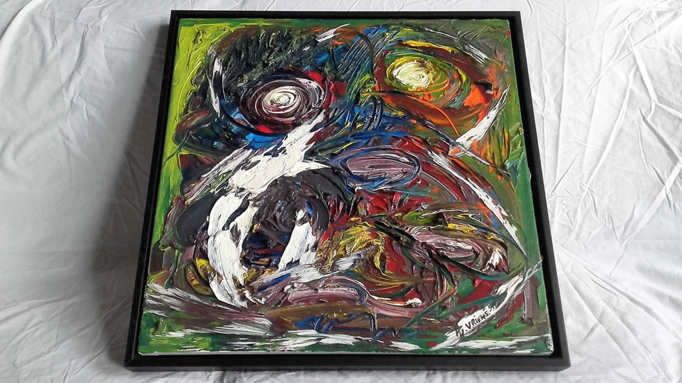 Acrylverf op linnen, (Abstract) Gesigneerd: A. Vriens. Afm totaal: 53 cm bij 53 cm. Afm doek: 50 cm bij 50 cm. Inclusief houten lijst en ophangmogelijkheid. Het schilderij verkeerd in perfecte staat. Wordt aangetekend opgestuurd en extra goed ingepakt, O/A in noppenplastic en doos.