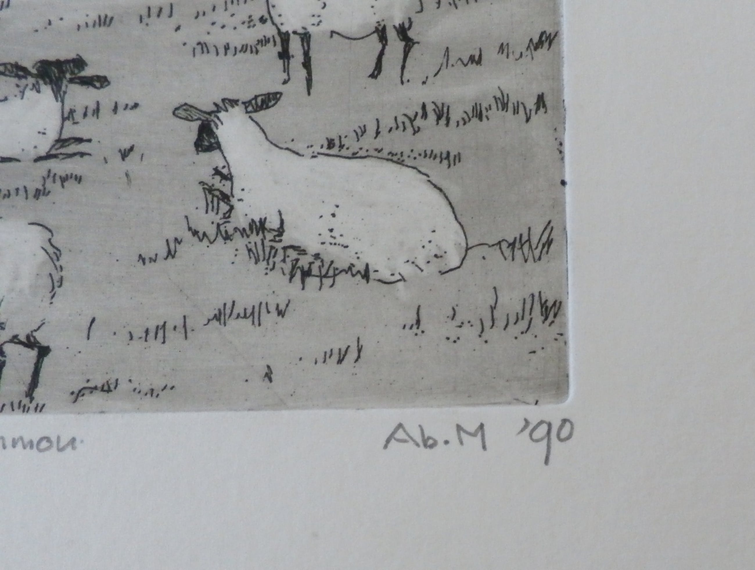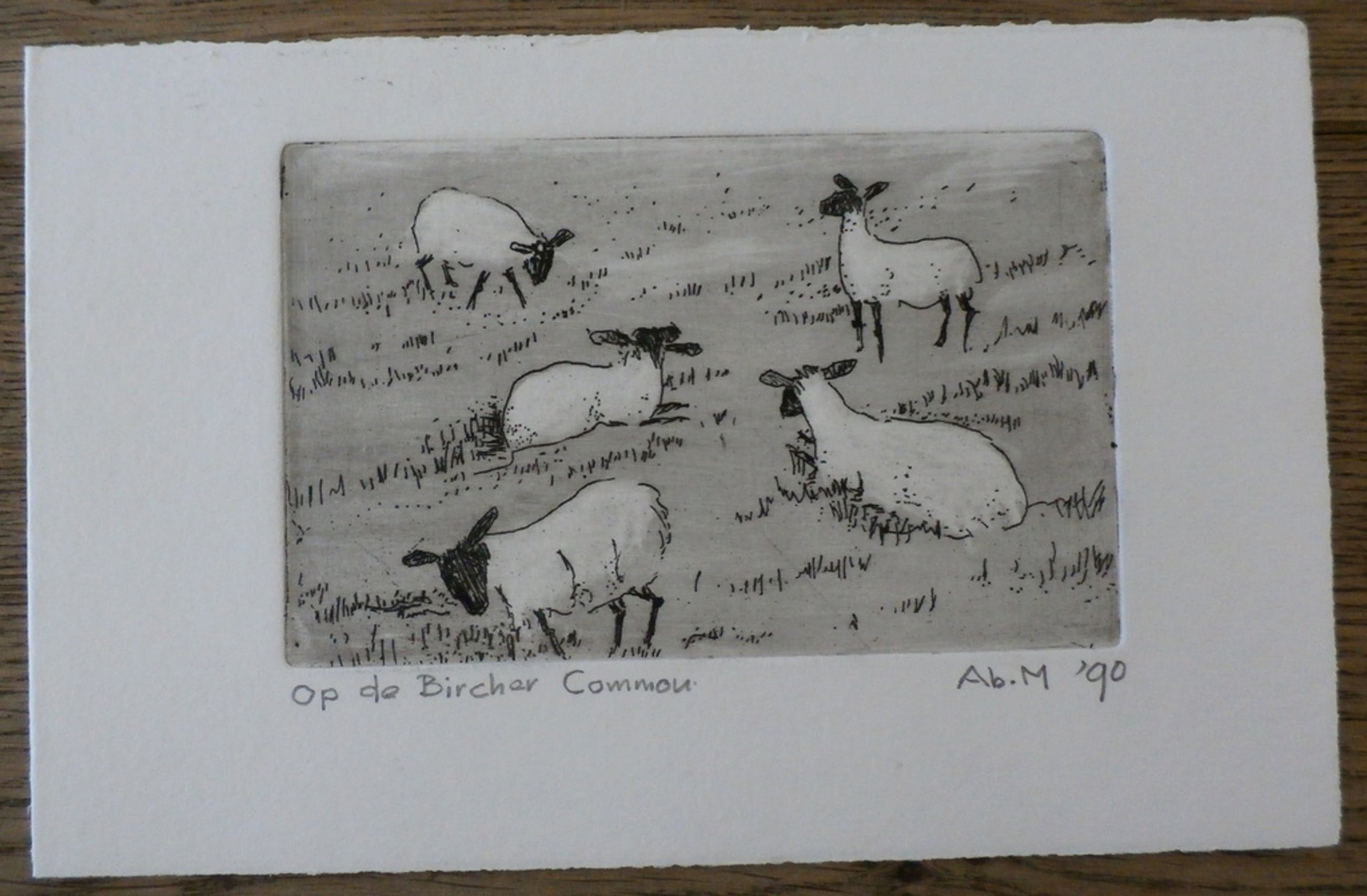 Ets van Ab Meilink (tekenleraar Koningin Beatrix) op kerstkaart. Titel: Op de Bircher Common. Jaar: 1990. Afmetingen ets: H6 x b6 cm.Conditie: in goede staat.