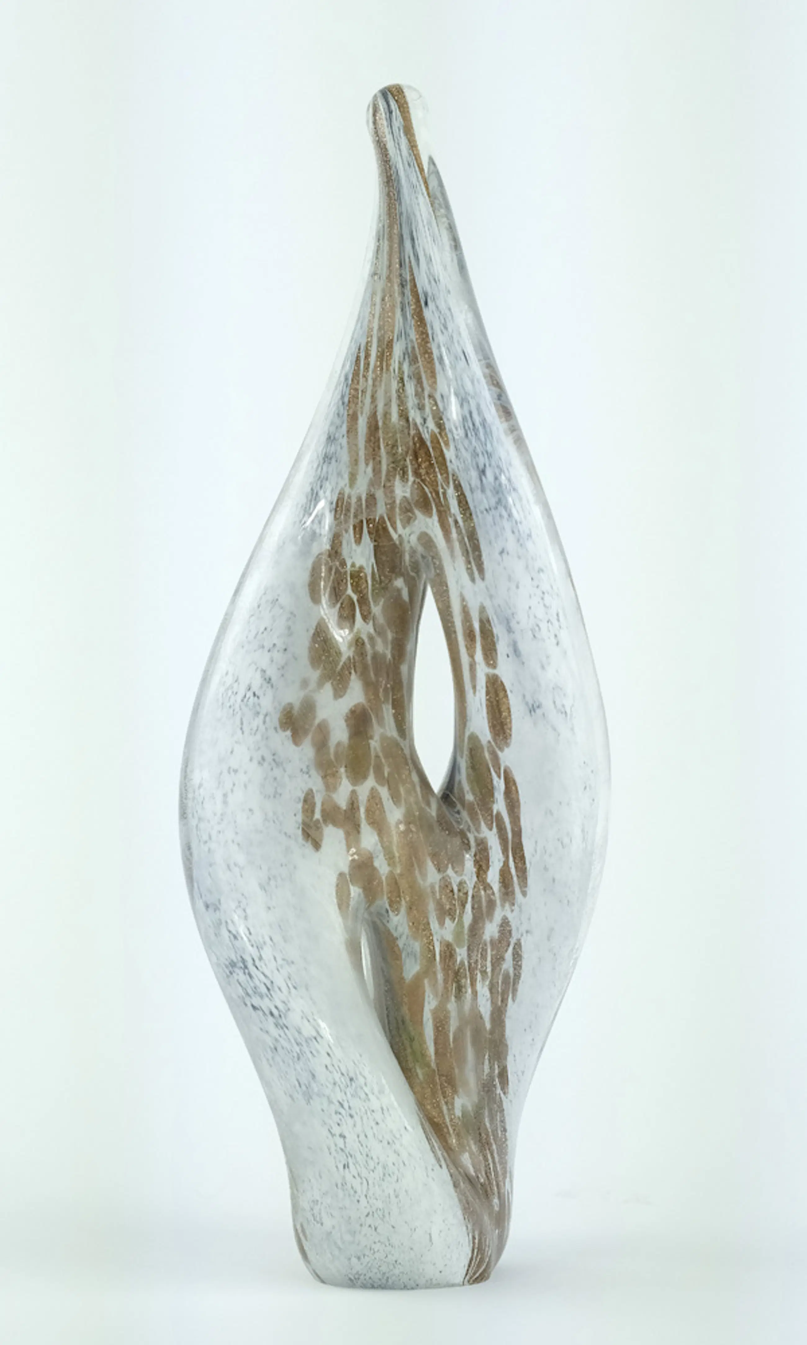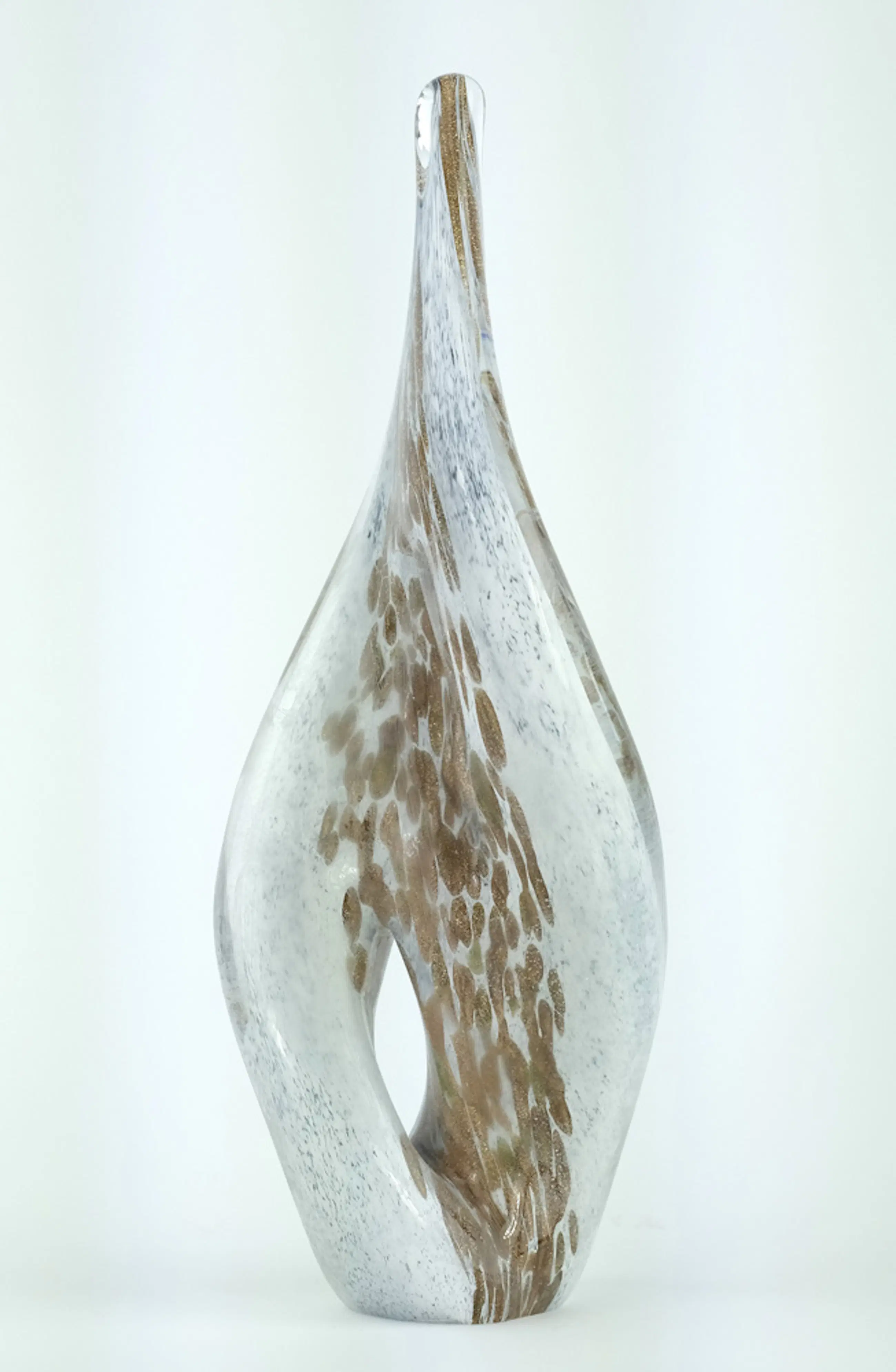 Een fraai abstract glazen sculptuur in het wit met gouden accenten.