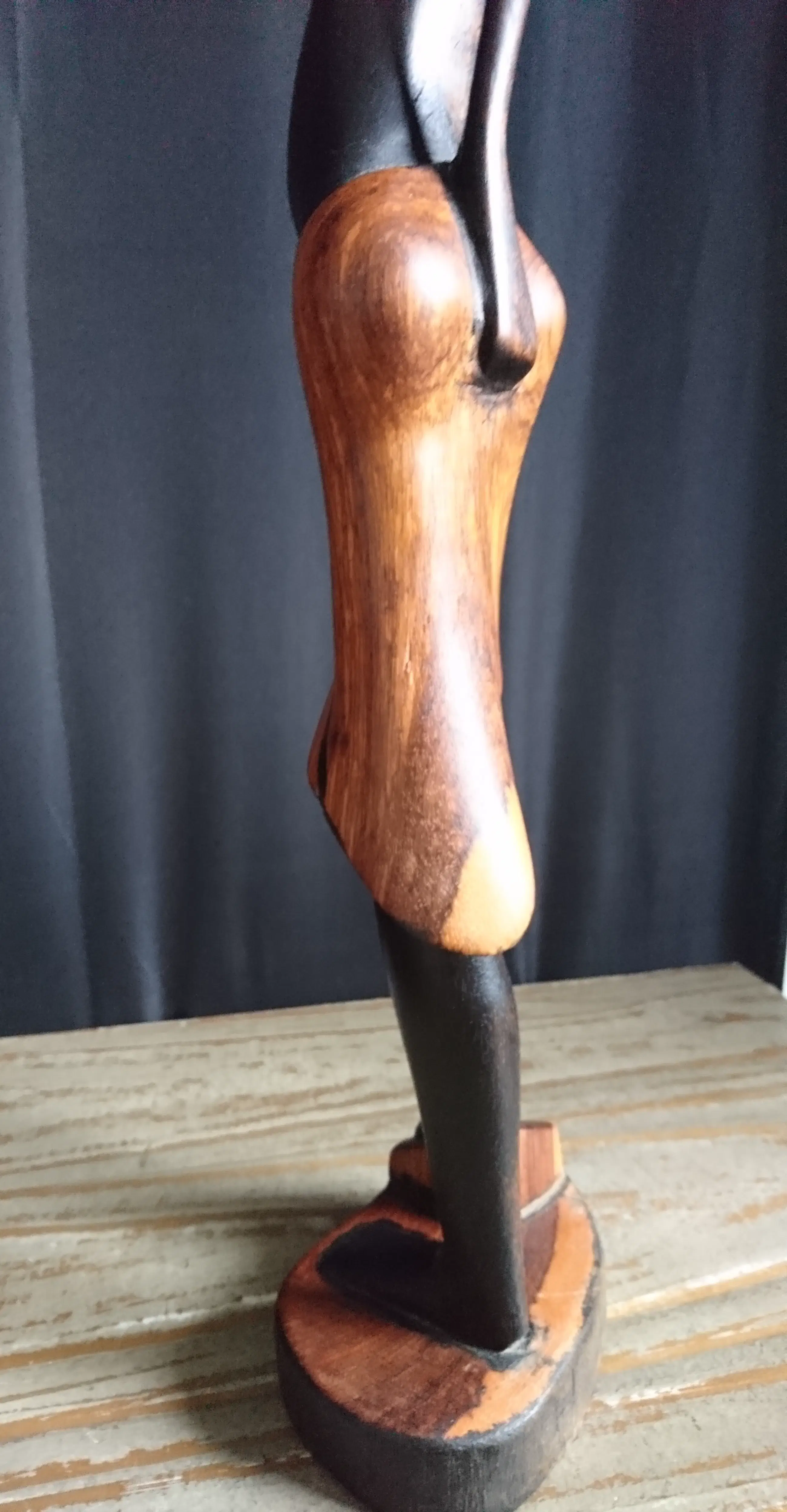Abstract houten beeld van een Afrikaanse vrouw die zichzelf met water overgiet.