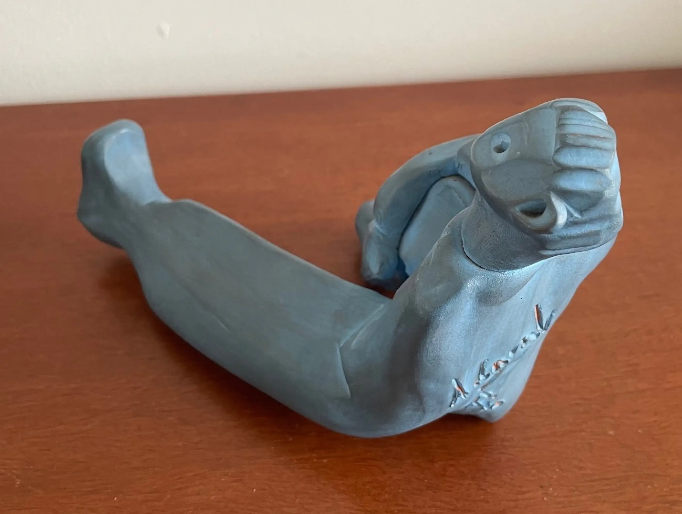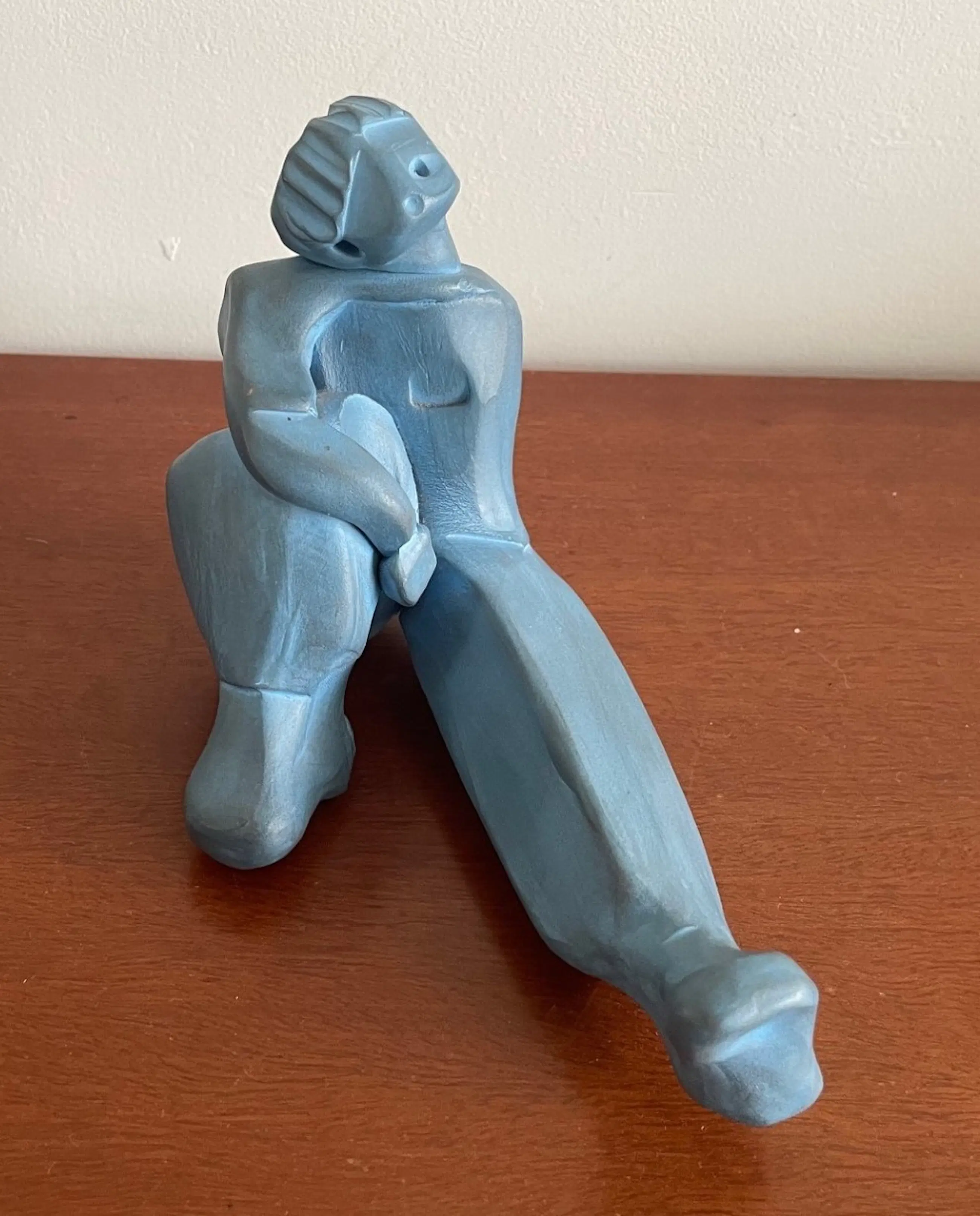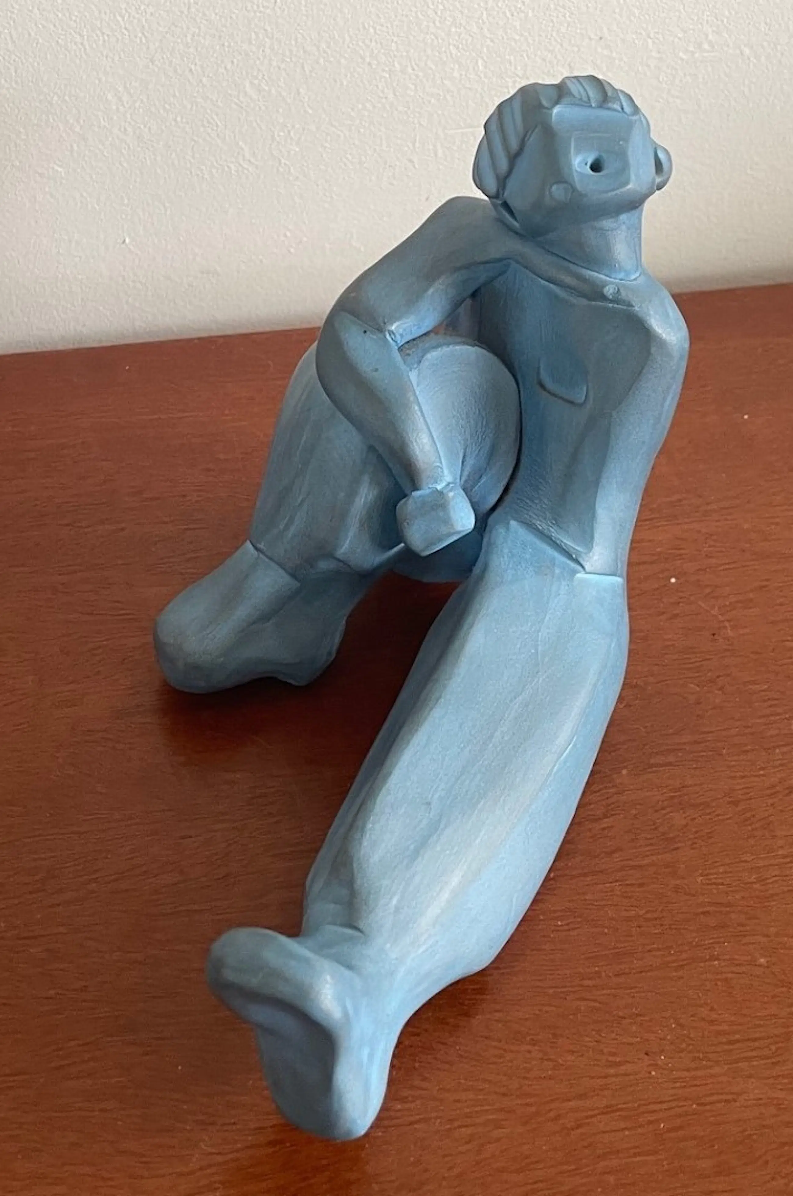 Abstract Studio keramisch plastiek van een persoon, uitgevoerd in rood aardewerk en voorzien van en blauw mat glazuur. aan de achterzijde gesigneerd, A. Lavals oid en Fio?  In onbeschadigde conditie.