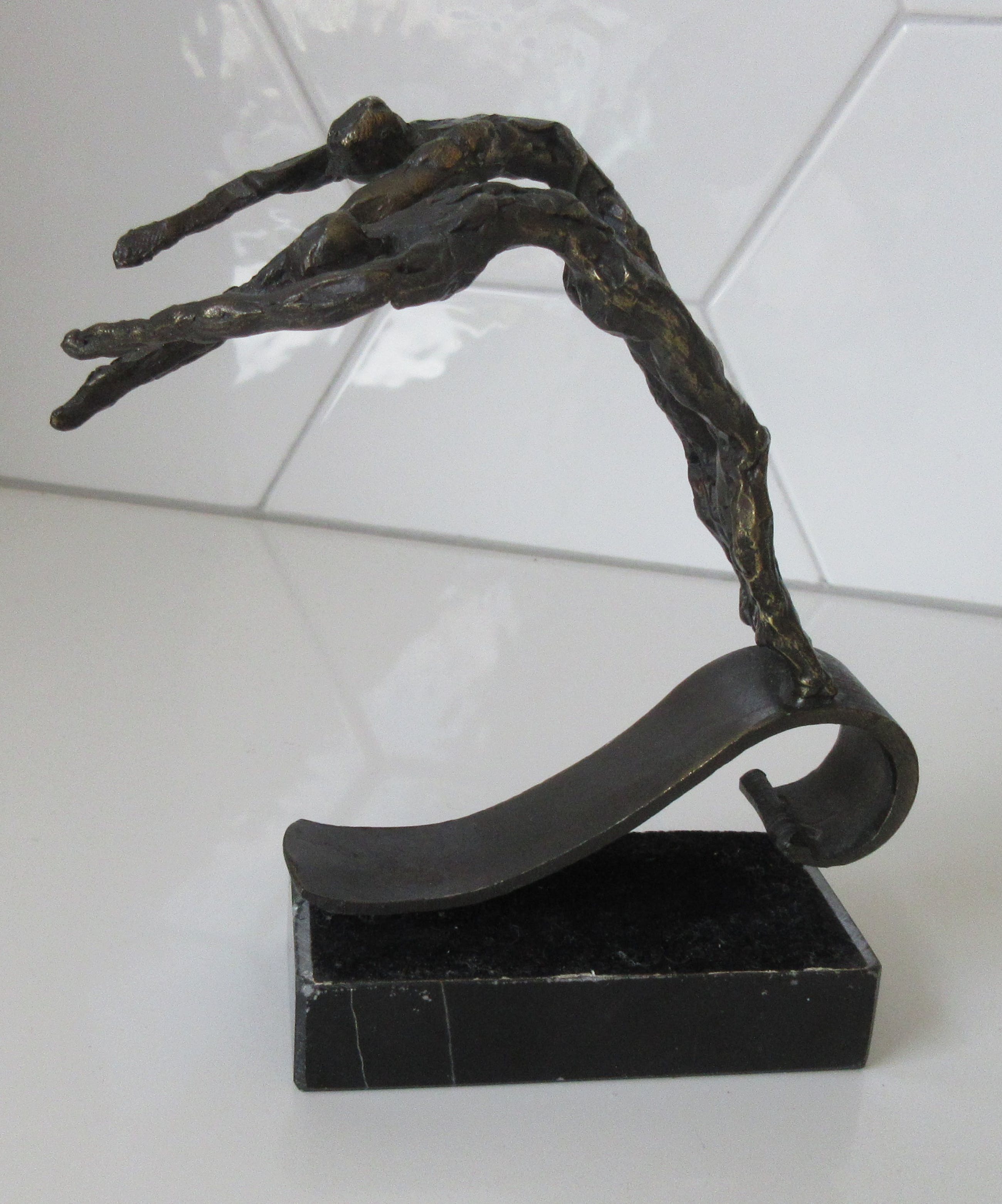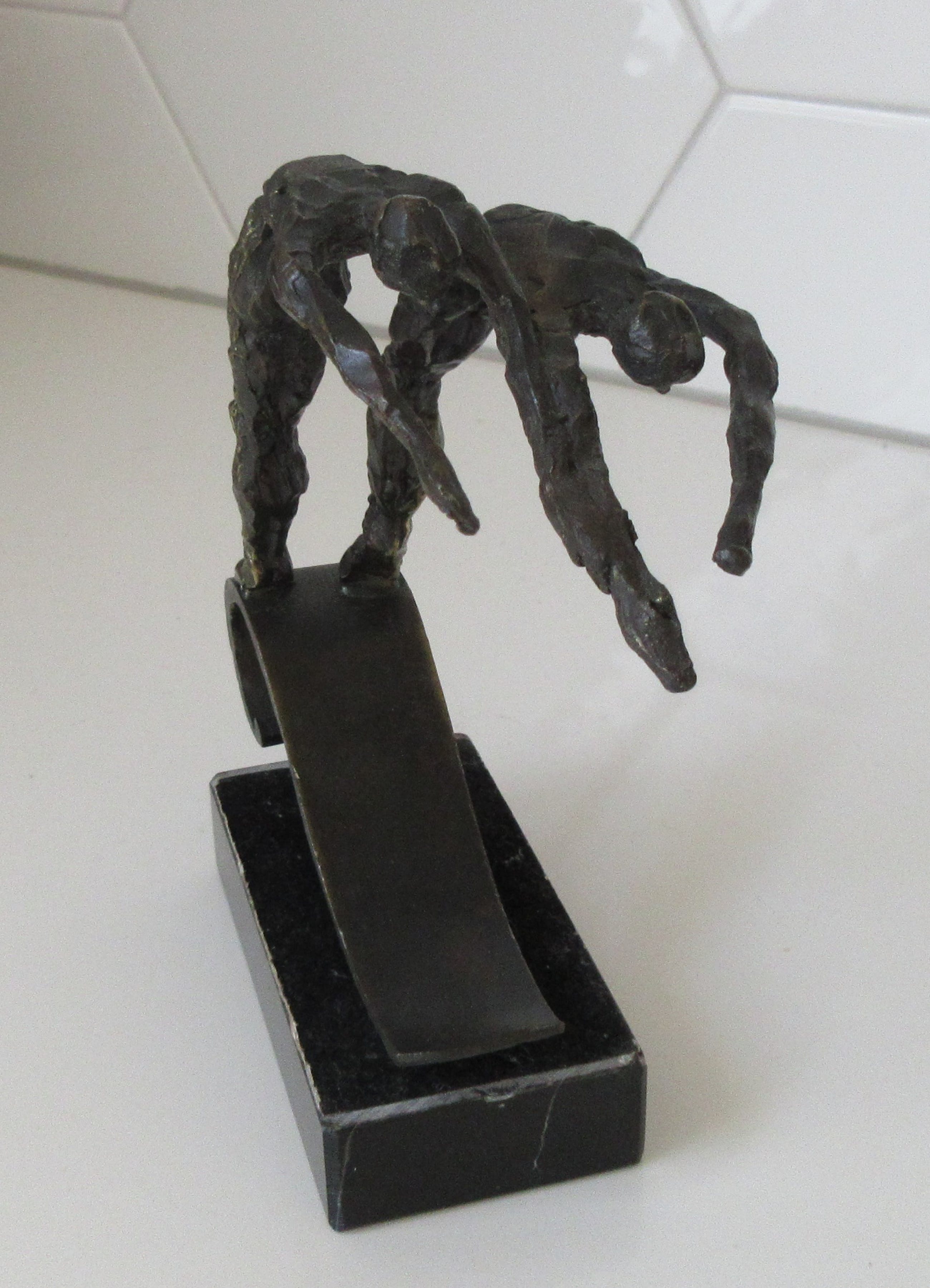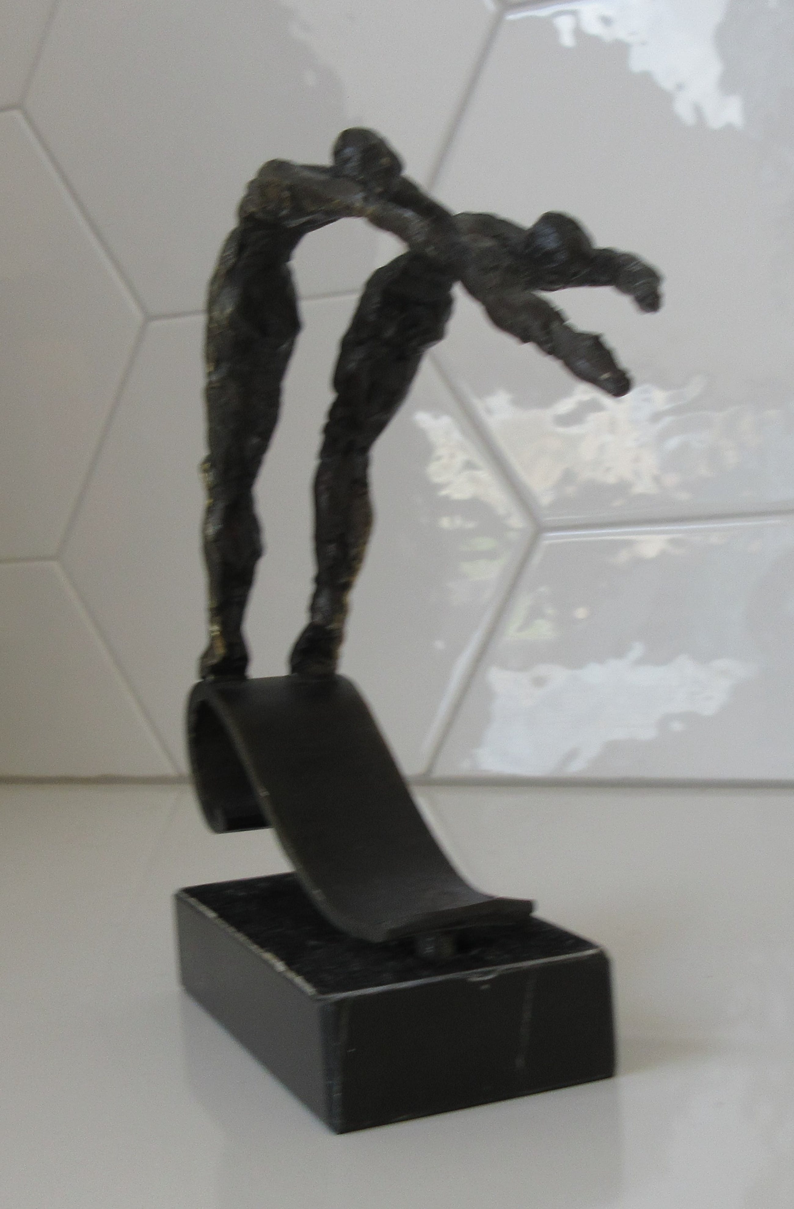 Abstract verbronsd metalen beeld van twee duikers. Niet gesigneerd. Uitgevoerd op metalen sokkel en marmeren voet.