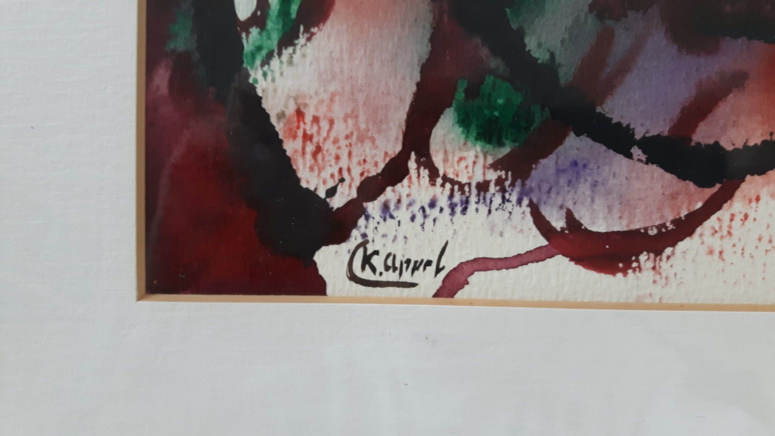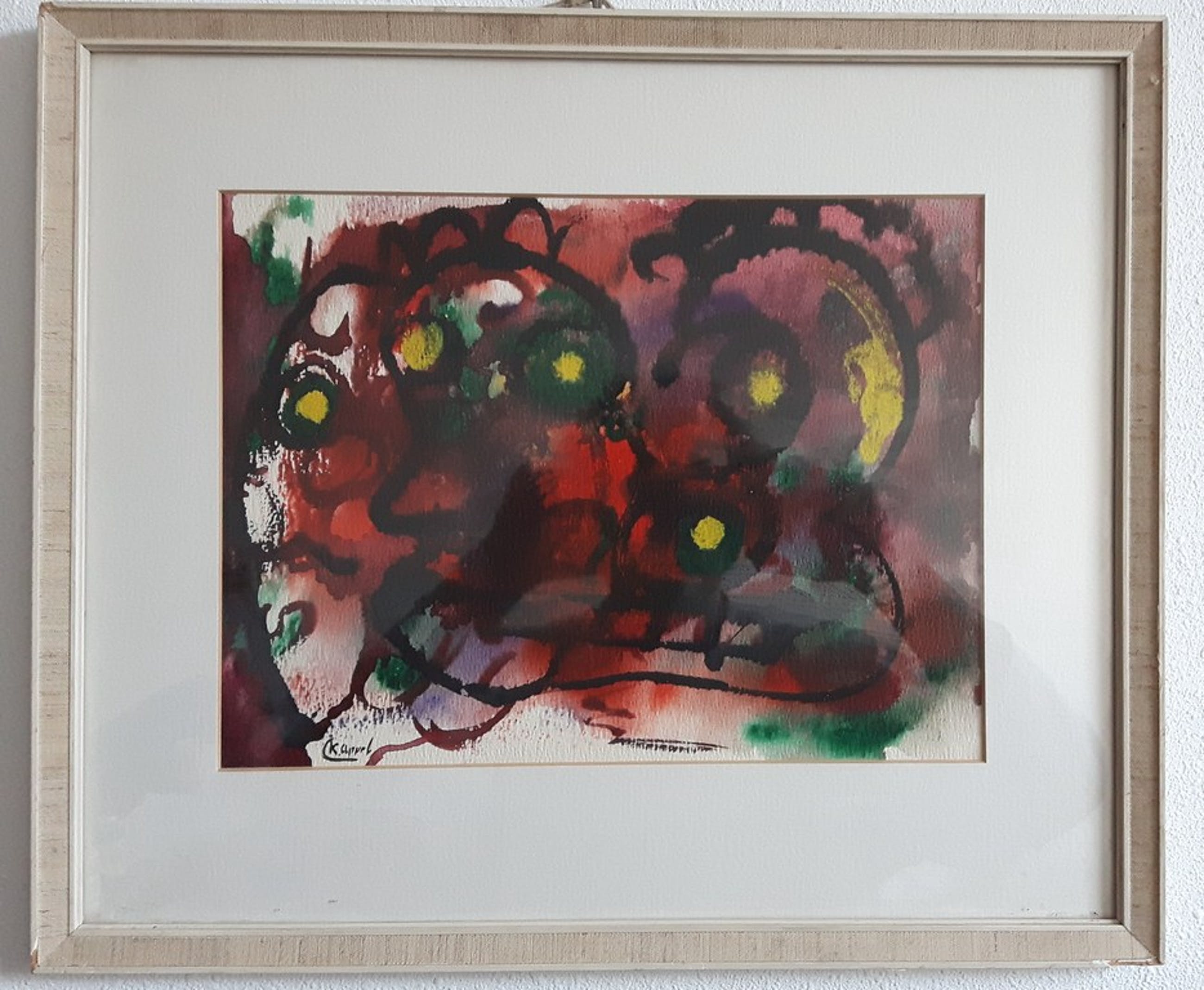 Abstract werk op aquarel basis. Linksonder gesigneerd met Karel Appel. Echtheid wordt niet gegarandeerd . Werk verkeerd in perfecte staat. Lijst op de hoeken wat beschadigd.