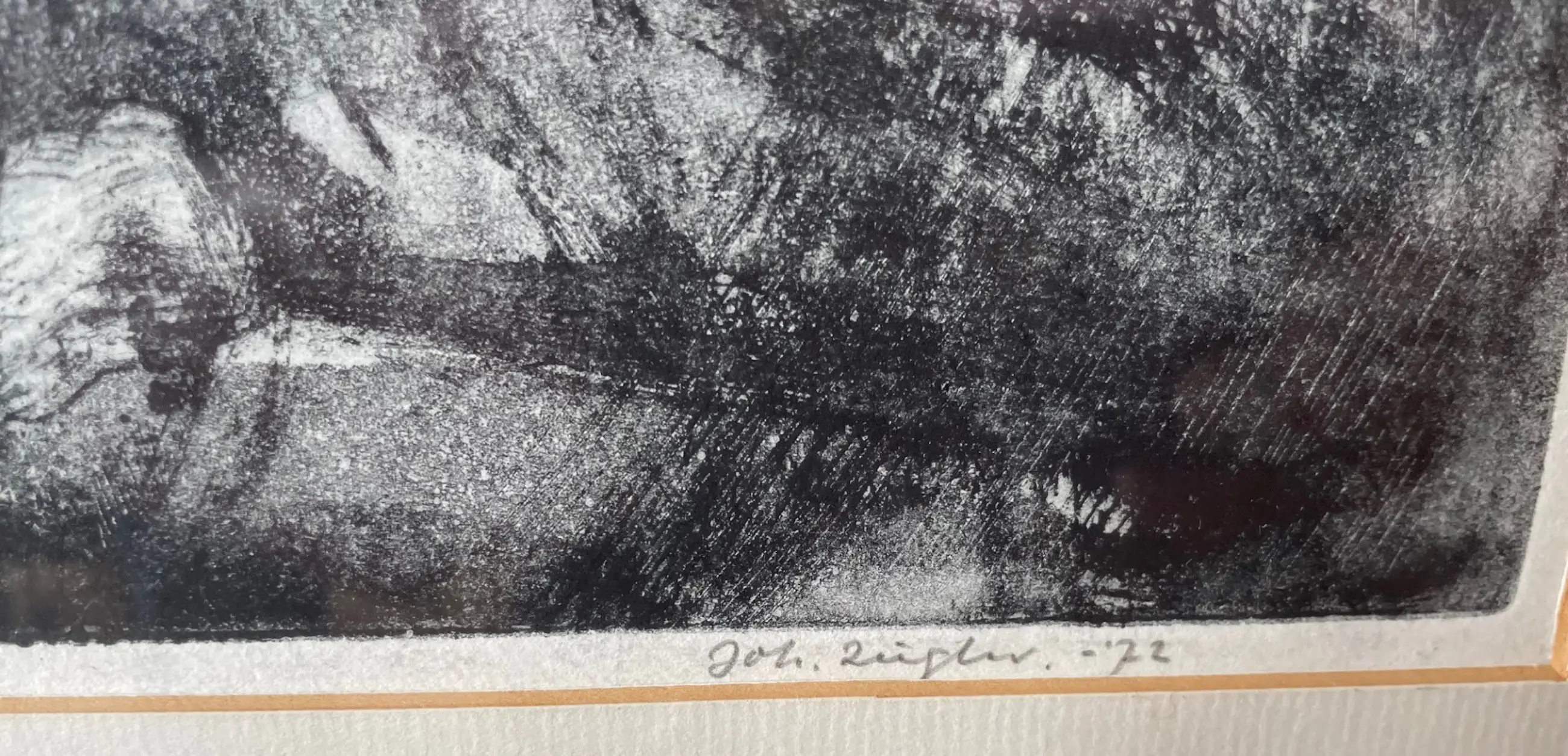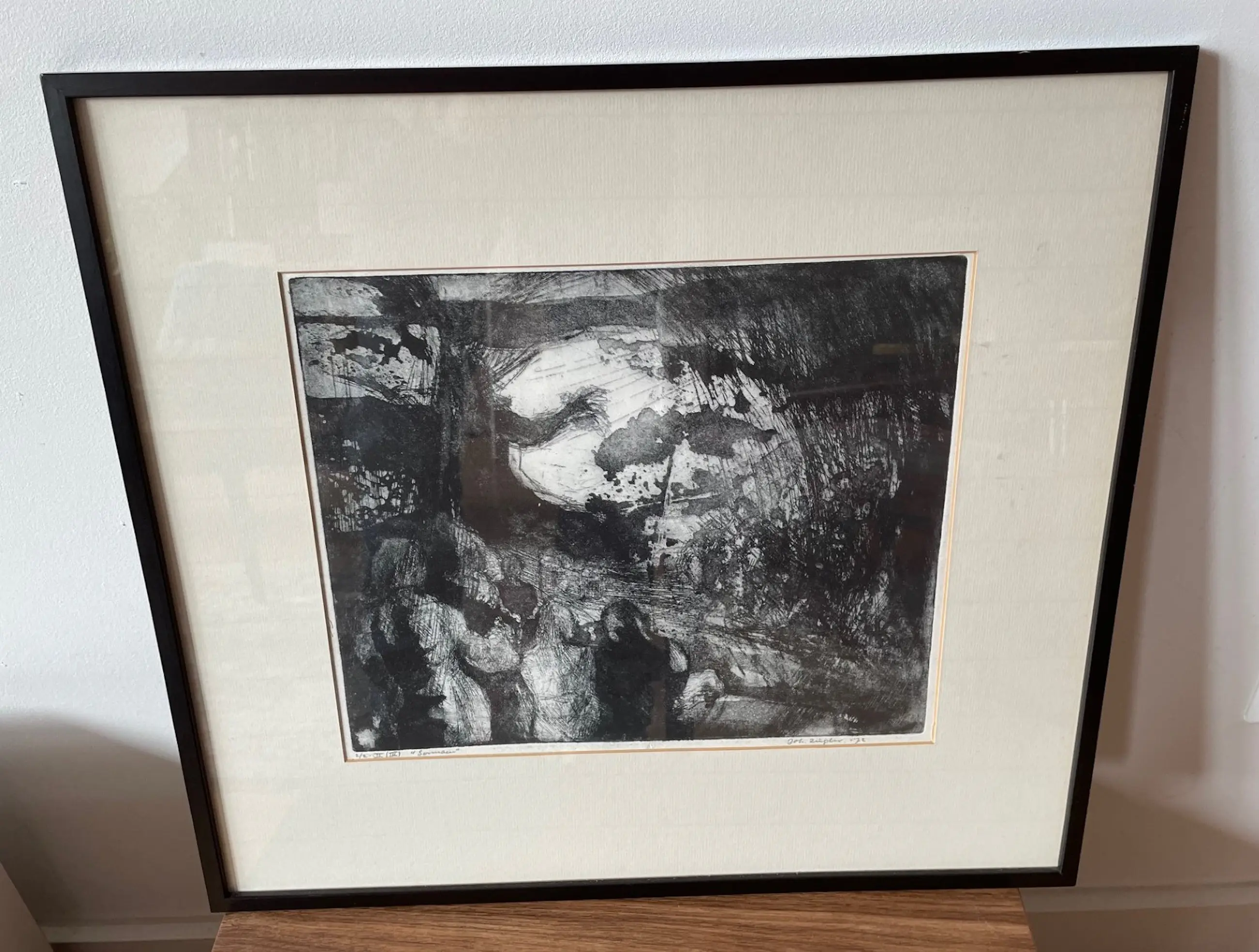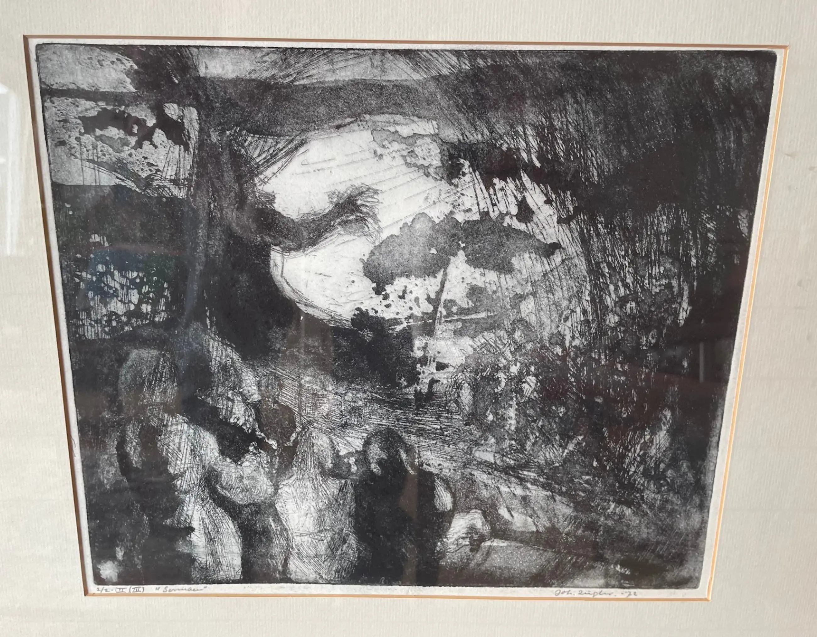 Abstracte Ets "Samaritaan" uit 1972 - gesigneerd rechtsonder Joh. Zutphen? In zeer goede conditie voorzien van een zwart houten lijst, glazen plaat en passe partout.
