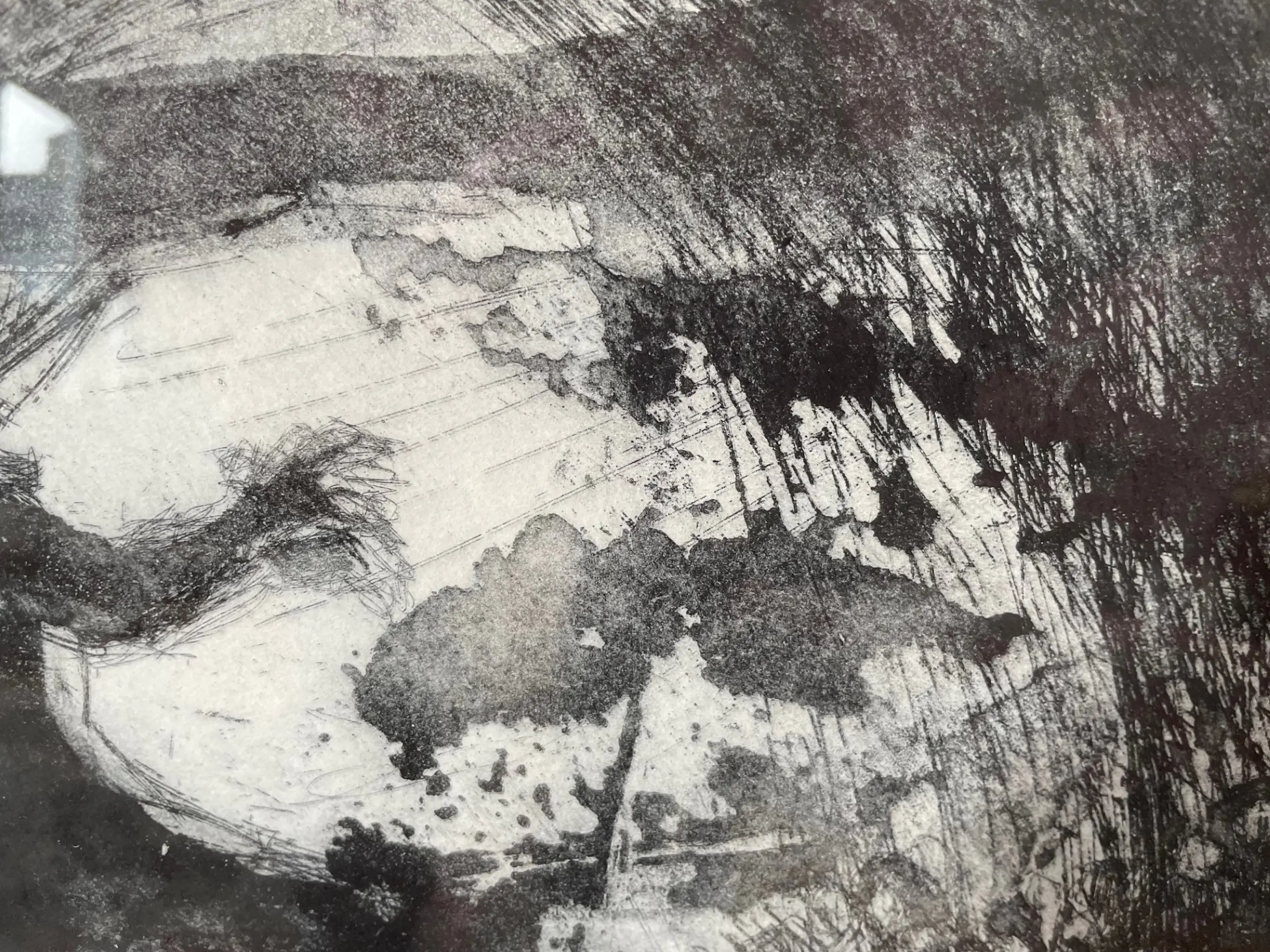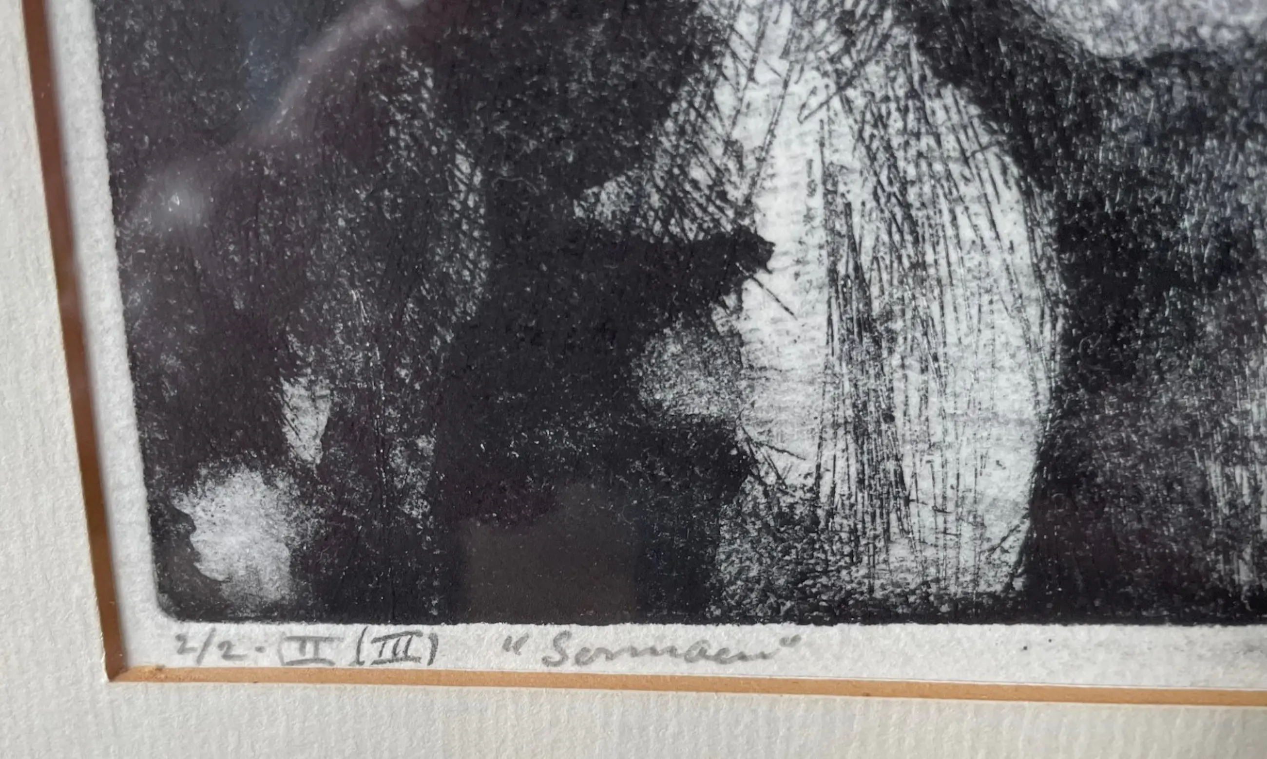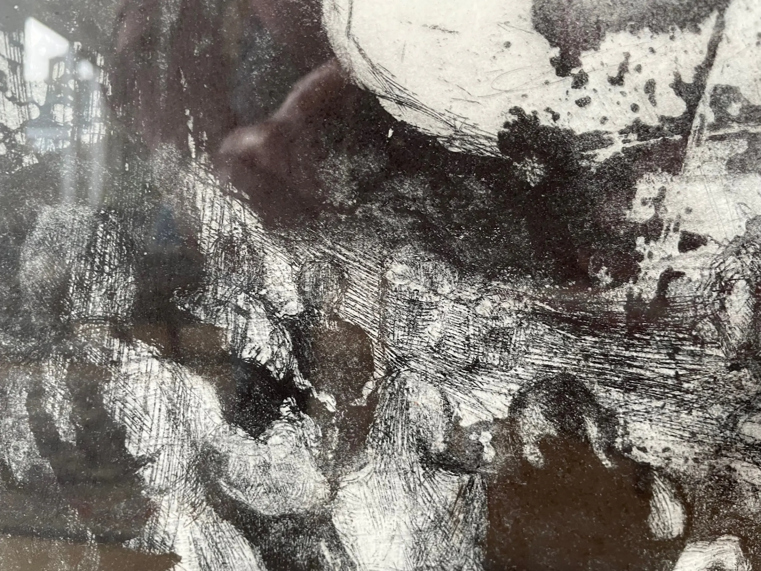 Abstracte Ets "Samaritaan" uit 1972 - gesigneerd rechtsonder Joh. Zutphen? In zeer goede conditie voorzien van een zwart houten lijst, glazen plaat en passe partout.