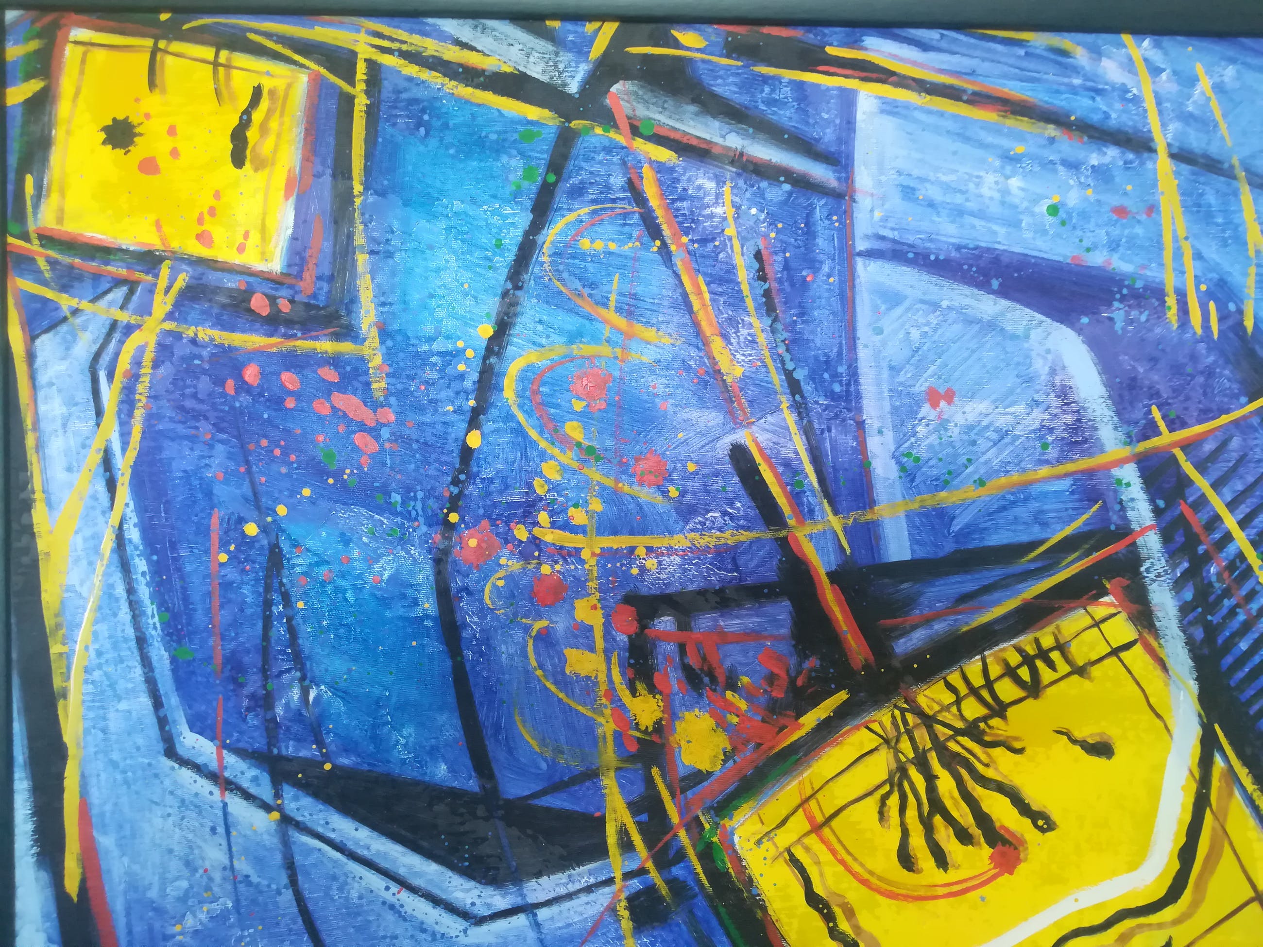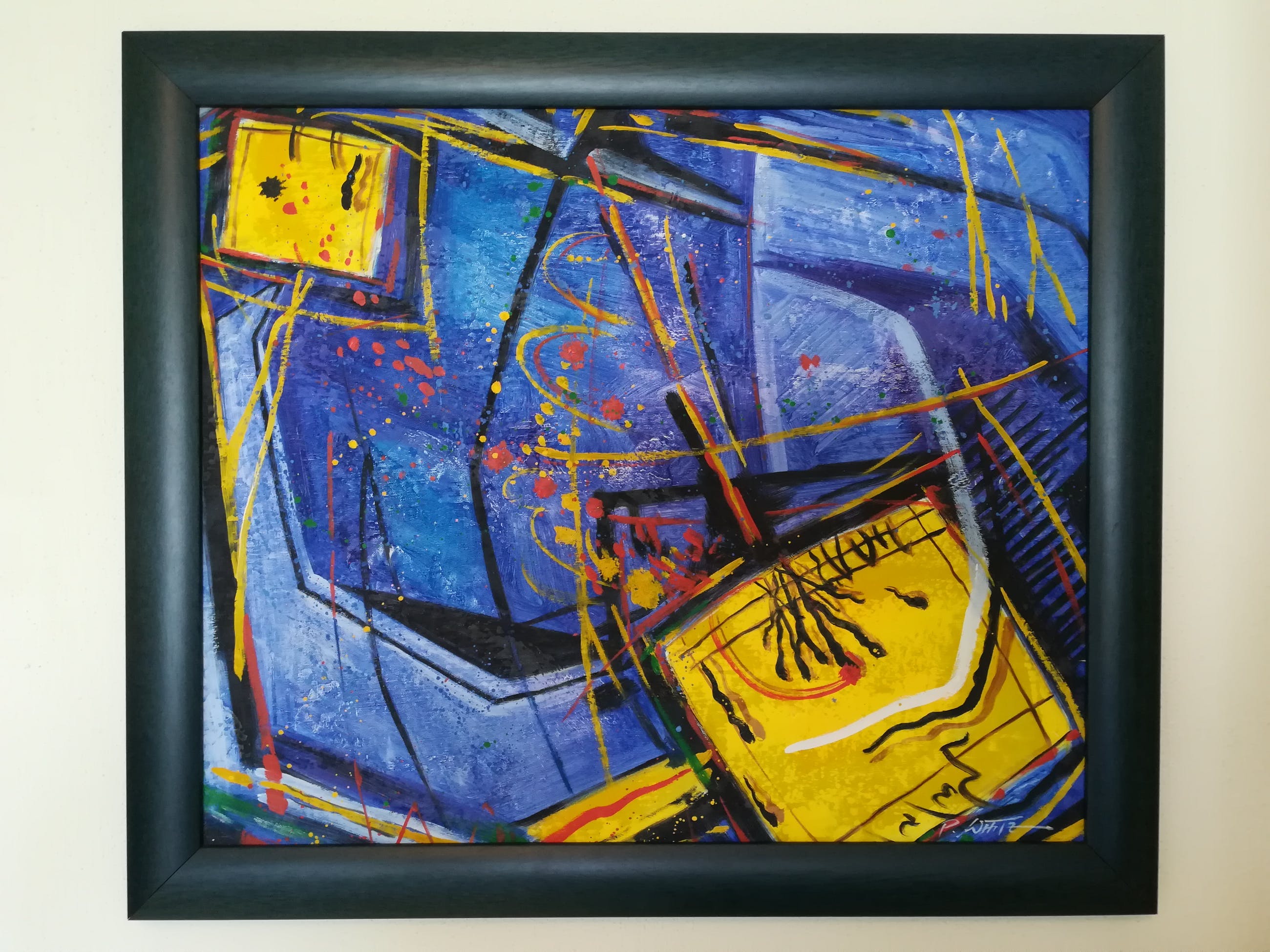 Een abstracte schilderij wat gemaakt is op canvas en hierna is ingelijst