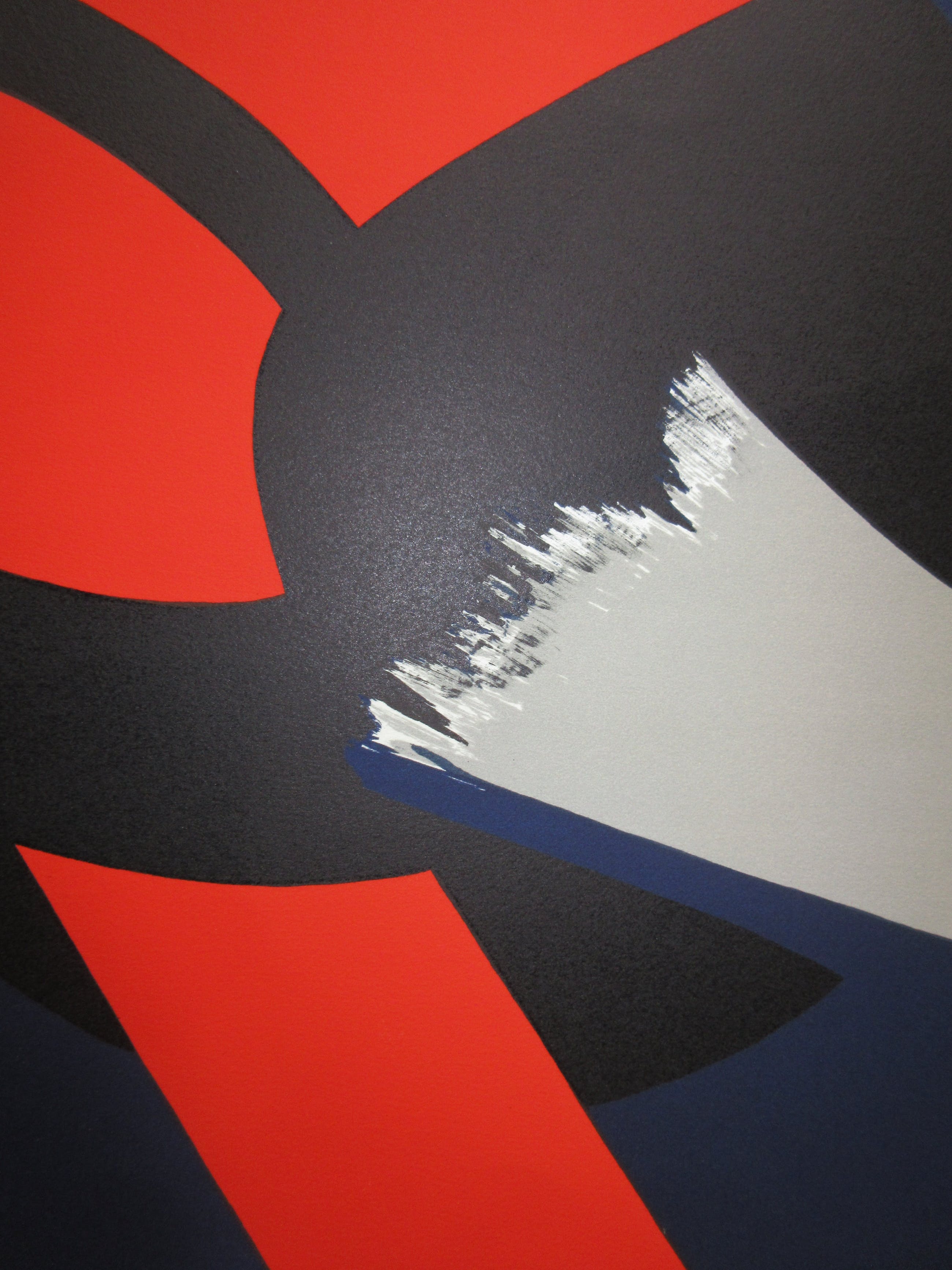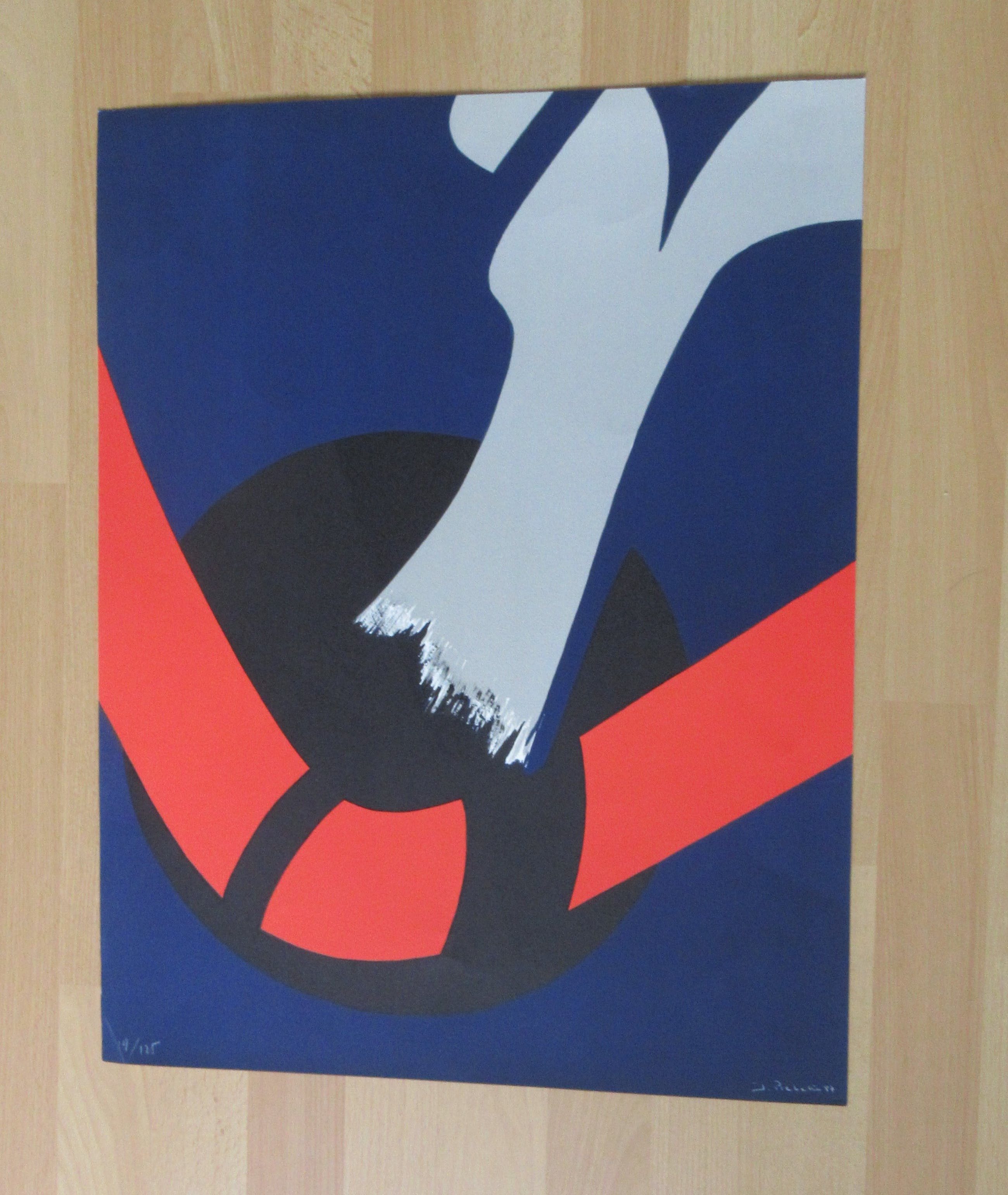 Moderne abstracte kleurrijke zeefdruk op papier. Uitgegeven in gelimiteerde opalge van 125 stuks, dit is exemplaar nummer 19. Genummerd 19/125 (LO) en gesigneerd J. Pieterse?? en gedateerd '87 (RO).