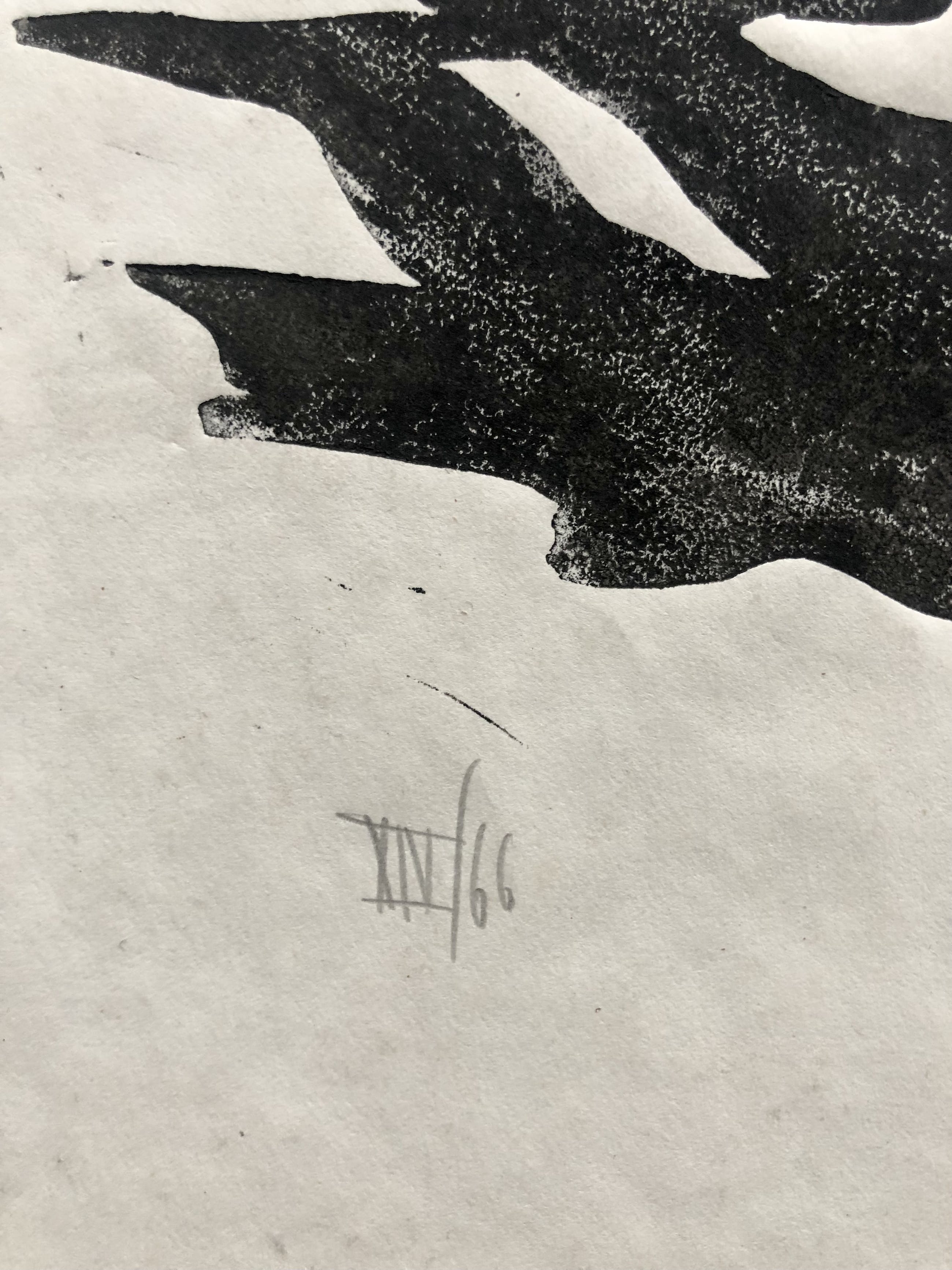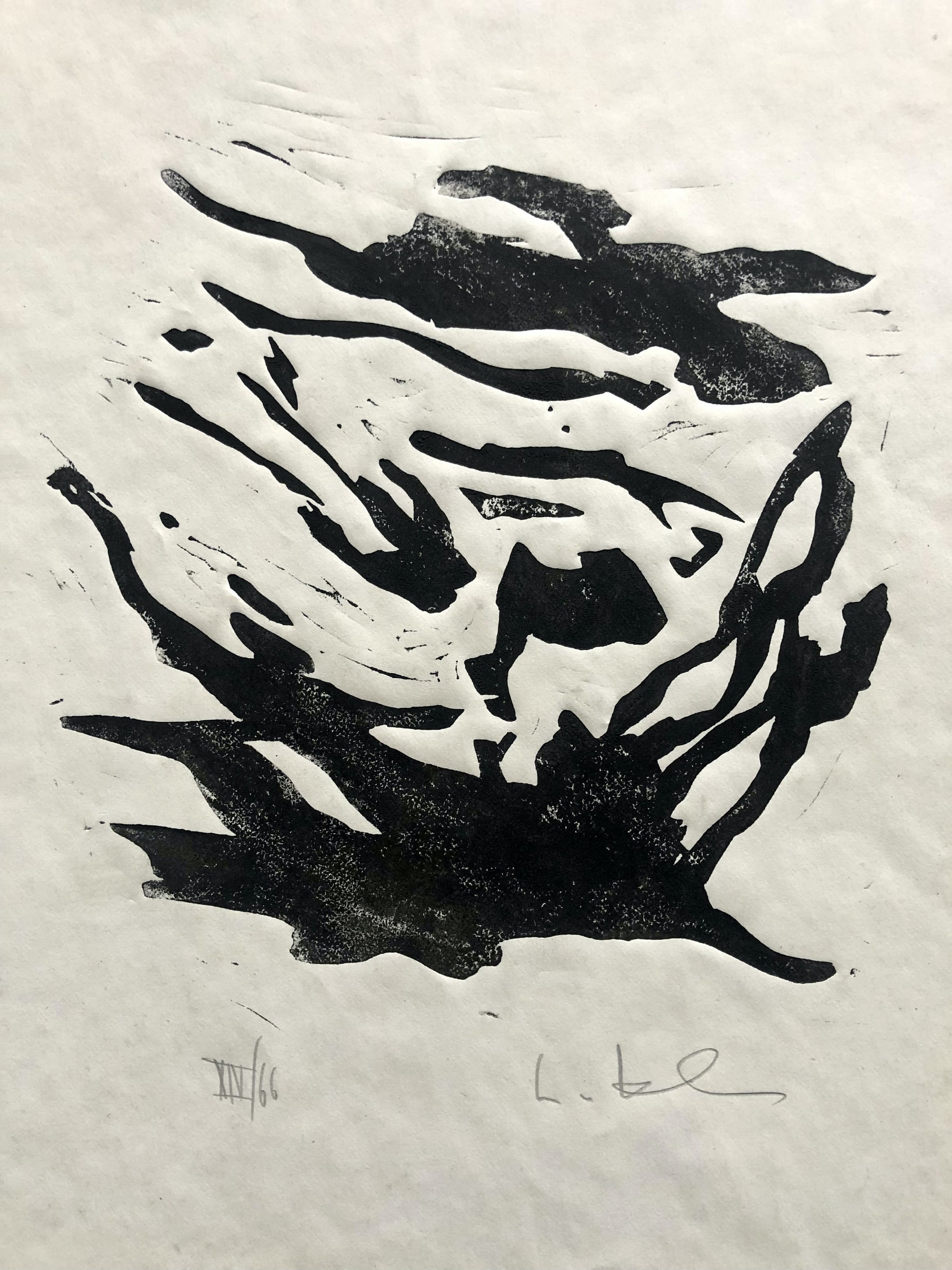 Fascinerende abstracte monoprint van een ons onbekende meester uit de jaren 60. In zeer goede staat, handgesigneerd en gedateerd.