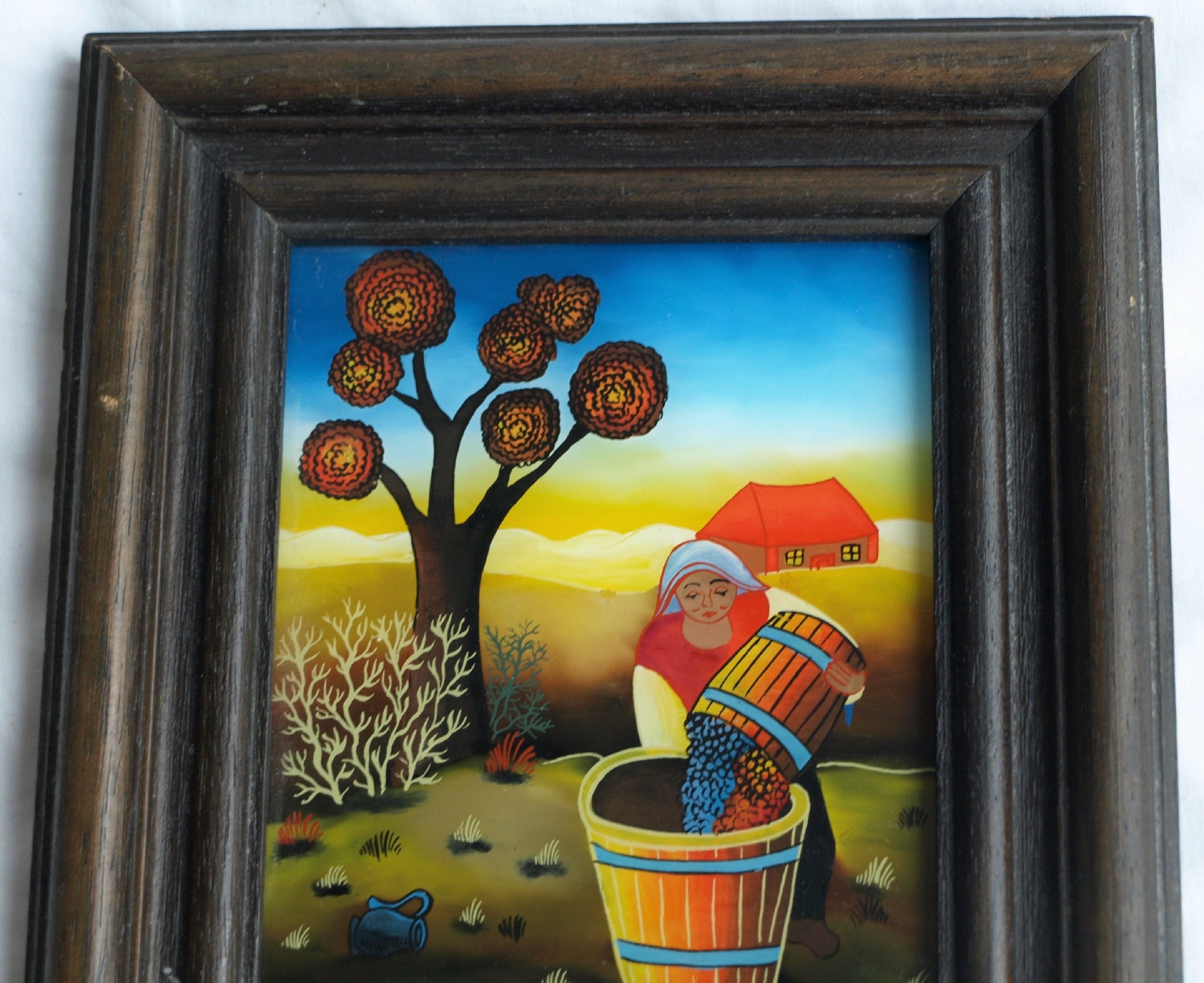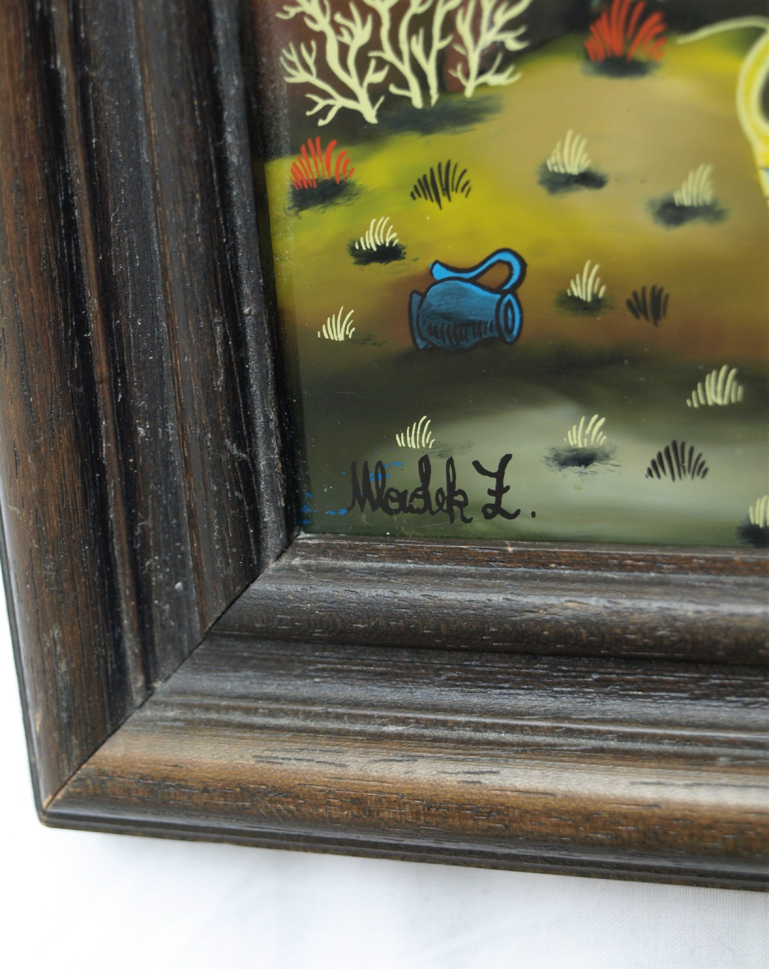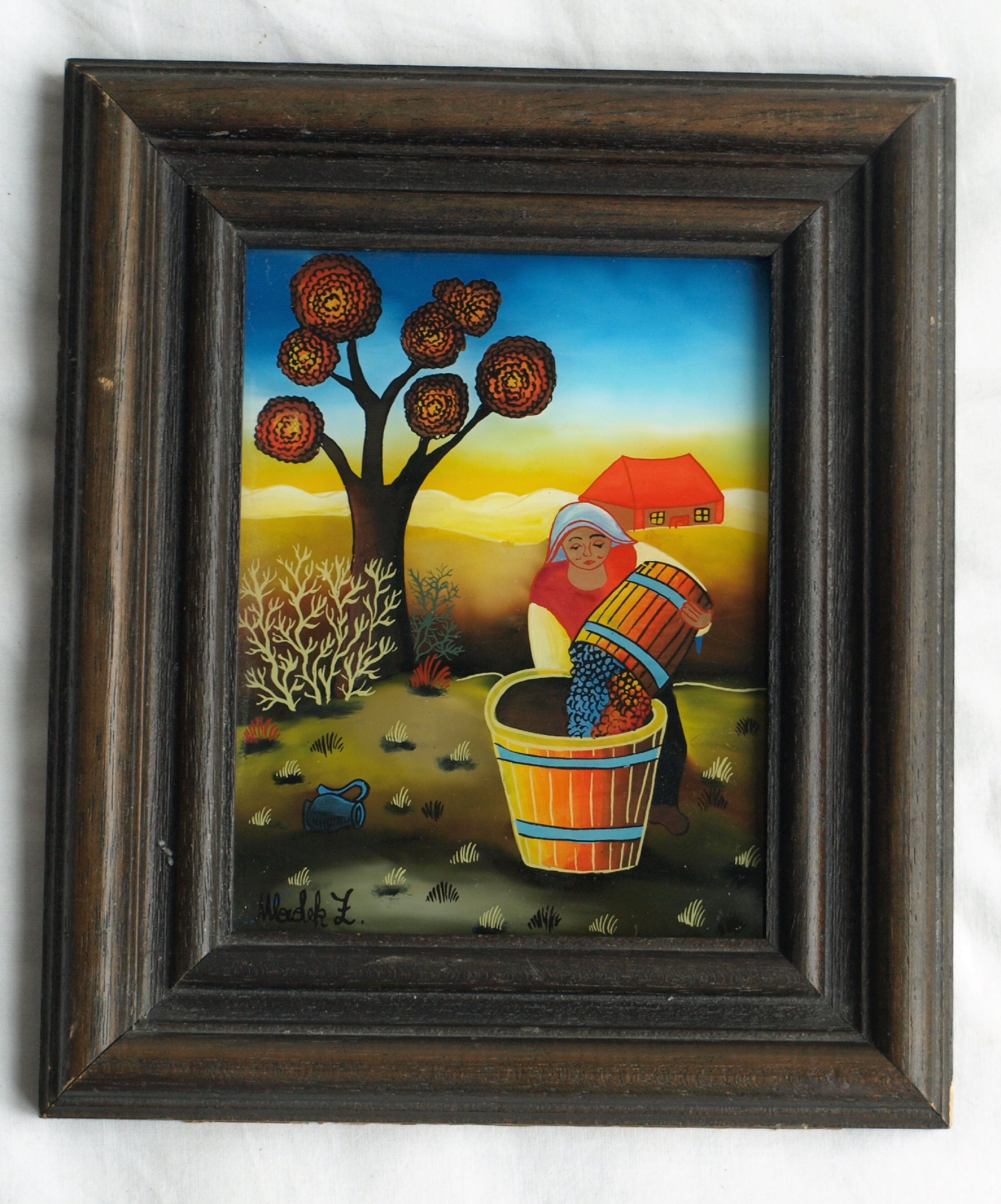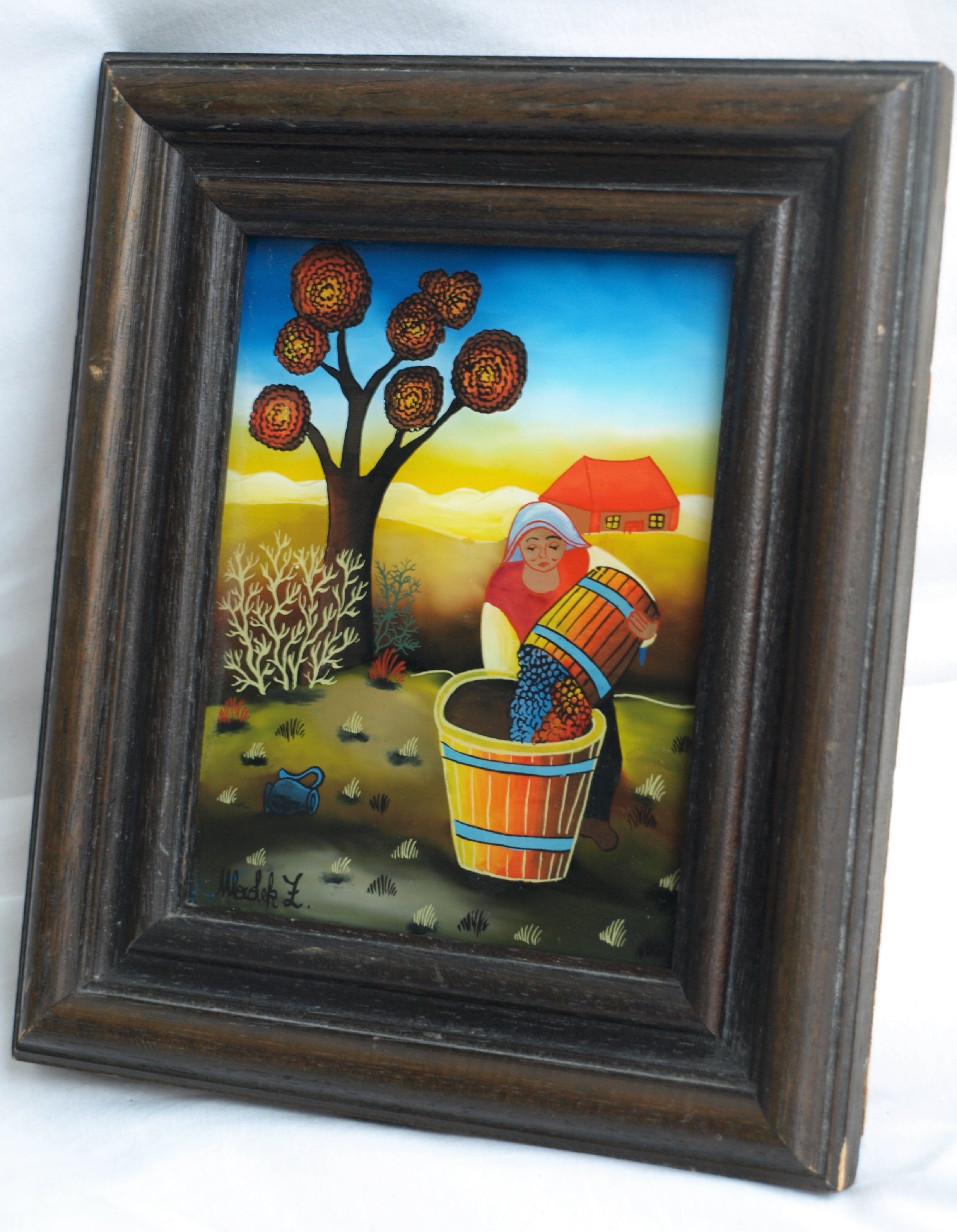 Een naief ingelijst ‘achterglas-schilderij’ van een ons onbekende (Joegoslavische / Kroatische) kunstenaar.